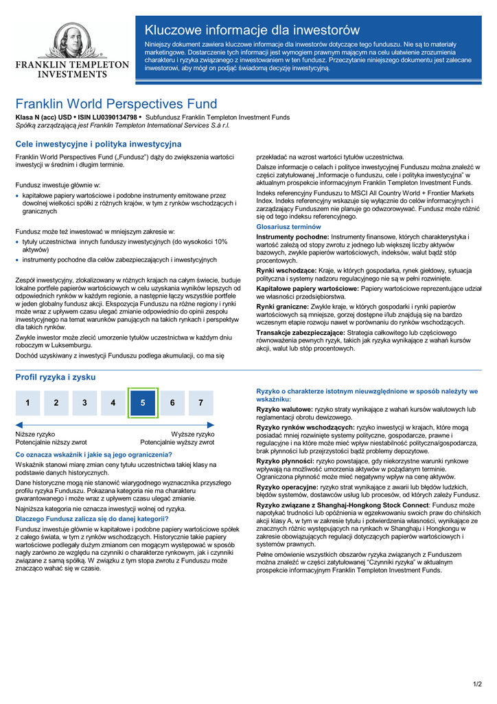 Kluczowe informacje dla inwestorów Niniejszy dokument zawiera kluczowe informacje dla inwestorów dotyczące tego funduszu. Nie są to materiały marketingowe. Dostarczenie tych informacji jest wymogiem prawnym mającym na celu ułatwienie zrozumienia charakteru i ryzyka związanego z inwestowaniem w ten fundusz. Przeczytanie niniejszego dokumentu jest zalecane inwestorowi, aby mógł on podjąć świadomą decyzję inwestycyjną. Franklin World Perspectives Fund Klasa N (acc) USD • ISIN LU0390134798 • Subfundusz Franklin Templeton Investment Funds Spółką zarządzającą jest Franklin Templeton International Services S.à r.l. Cele inwestycyjne i polityka inwestycyjna Franklin World Perspectives Fund („Fundusz”) dąży do zwiększenia wartości inwestycji w średnim i długim terminie. Fundusz inwestuje głównie w: · kapitałowe papiery wartościowe i podobne instrumenty emitowane przez dowolnej wielkości spółki z różnych krajów, w tym z rynków wschodzących i granicznych przekładać na wzrost wartości tytułów uczestnictwa. Dalsze informacje o celach i polityce inwestycyjnej Funduszu można znaleźć w części zatytułowanej „Informacje o funduszu, cele i polityka inwestycyjna” w aktualnym prospekcie informacyjnym Franklin Templeton Investment Funds. Indeks referencyjny Funduszu to MSCI All Country World + Frontier Markets Index. Indeks referencyjny wskazuje się wyłącznie do celów informacyjnych i zarządzający Funduszem nie planuje go odwzorowywać. Fundusz może różnić się od tego indeksu referencyjnego. Glosariusz terminów Fundusz może też inwestować w mniejszym zakresie w: · tytuły uczestnictwa innych funduszy inwestycyjnych (do wysokości 10% aktywów) · instrumenty pochodne dla celów zabezpieczających i inwestycyjnych Zespół inwestycyjny, zlokalizowany w różnych krajach na całym świecie, buduje lokalne portfele papierów wartościowych w celu uzyskania wyników lepszych od odpowiednich rynków w każdym regionie, a następnie łączy wszystkie portfele w jeden globalny fundusz akcji. Ekspozycja Funduszu na różne regiony i rynki może wraz z upływem czasu ulegać zmianie odpowiednio do opinii zespołu inwestycyjnego na temat warunków panujących na takich rynkach i perspektyw dla takich rynków. Zwykle inwestor może zlecić umorzenie tytułów uczestnictwa w każdym dniu roboczym w Luksemburgu. Dochód uzyskiwany z inwestycji Funduszu podlega akumulacji, co ma się Instrumenty pochodne: Instrumenty finansowe, których charakterystyka i wartość zależą od stopy zwrotu z jednego lub większej liczby aktywów bazowych, zwykle papierów wartościowych, indeksów, walut bądź stóp procentowych. Rynki wschodzące: Kraje, w których gospodarka, rynek giełdowy, sytuacja polityczna i systemy nadzoru regulacyjnego nie są w pełni rozwinięte. Kapitałowe papiery wartościowe: Papiery wartościowe reprezentujące udział we własności przedsiębiorstwa. Rynki graniczne: Zwykle kraje, w których gospodarki i rynki papierów wartościowych są mniejsze, gorzej dostępne i/lub znajdują się na bardzo wczesnym etapie rozwoju nawet w porównaniu do rynków wschodzących. Transakcje zabezpieczające: Strategia całkowitego lub częściowego równoważenia pewnych ryzyk, takich jak ryzyka wynikające z wahań kursów akcji, walut lub stóp procentowych. Profil ryzyka i zysku 1 2 3 Niższe ryzyko Potencjalnie niższy zwrot 4 5 6 7 Wyższe ryzyko Potencjalnie wyższy zwrot Co oznacza wskaźnik i jakie są jego ograniczenia? Wskaźnik stanowi miarę zmian ceny tytułu uczestnictwa takiej klasy na podstawie danych historycznych. Dane historyczne mogą nie stanowić wiarygodnego wyznacznika przyszłego profilu ryzyka Funduszu. Pokazana kategoria nie ma charakteru gwarantowanego i może wraz z upływem czasu ulegać zmianie. Najniższa kategoria nie oznacza inwestycji wolnej od ryzyka. Dlaczego Fundusz zalicza się do danej kategorii? Fundusz inwestuje głównie w kapitałowe i podobne papiery wartościowe spółek z całego świata, w tym z rynków wschodzących. Historycznie takie papiery wartościowe podlegały dużym zmianom cen mogącym występować w sposób nagły zarówno ze względu na czynniki o charakterze rynkowym, jak i czynniki związane z samą spółką. W związku z tym stopa zwrotu z Funduszu może znacząco wahać się w czasie. Ryzyko o charakterze istotnym nieuwzględnione w sposób należyty we wskaźniku: Ryzyko walutowe: ryzyko straty wynikające z wahań kursów walutowych lub reglamentacji obrotu dewizowego. Ryzyko rynków wschodzących: ryzyko inwestycji w krajach, które mogą posiadać mniej rozwinięte systemy polityczne, gospodarcze, prawne i regulacyjne i na które może mieć wpływ niestabilność polityczna/gospodarcza, brak płynności lub przejrzystości bądź problemy depozytowe. Ryzyko płynności: ryzyko powstające, gdy niekorzystne warunki rynkowe wpływają na możliwość umorzenia aktywów w pożądanym terminie. Ograniczona płynność może mieć negatywny wpływ na cenę aktywów. Ryzyko operacyjne: ryzyko strat wynikające z awarii lub błędów ludzkich, błędów systemów, dostawców usług lub procesów, od których zależy Fundusz. Ryzyko związane z Shanghaj-Hongkong Stock Connect: Fundusz może napotykać trudności lub opóźnienia w egzekwowaniu swoich praw do chińskich akcji klasy A, w tym w zakresie tytułu i potwierdzenia własności, wynikające ze znacznych różnic występujących na rynkach w Shanghaju i Hongkongu w zakresie obowiązujących regulacji dotyczących papierów wartościowych i systemów prawnych. Pełne omówienie wszystkich obszarów ryzyka związanych z Funduszem można znaleźć w części zatytułowanej “Czynniki ryzyka” w aktualnym prospekcie informacyjnym Franklin Templeton Investment Funds. 1/2 Franklin World Perspectives Fund Opłaty Opłaty ponoszone przez inwestora służą pokryciu kosztów działalności Funduszu, w tym kosztów jego marketingu