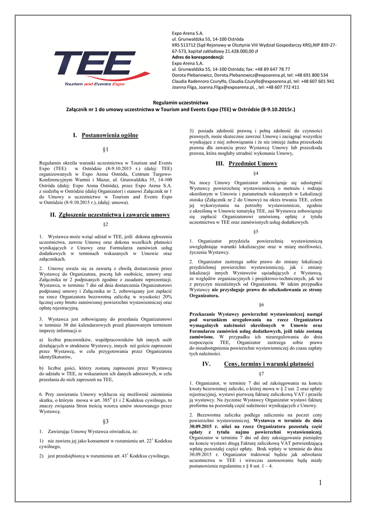Expo Arena S.A. ul. Grunwaldzka 55, 14-100 Ostróda KRS 513712 (Sąd Rejonowy w Olsztynie VIII Wydział Gospodarczy KRS),NIP 839-2767-573, kapitał zakładowy 21.428.000,00 zł Adres do korespondencji: Expo Arena S.A. ul. Grunwaldzka 55, 14-100 Ostróda; fax: +48 89 647 78 77 Dorota Plebanowicz, [email protected], tel: +48 691 800 534 Claudia Radenroro Czuryłło, [email protected], tel: +48 607 601 941 Joanna Fliga, [email protected], , tel: +48 607 772 411 Regulamin uczestnictwa Załącznik nr 1 do umowy uczestnictwa w Tourism and Events Expo (TEE) w Ostródzie (8-9.10.2015r.) I. Postanowienia ogólne §1 Regulamin określa warunki uczestnictwa w Tourism and Events Expo (TEE) w Ostródzie (8-9.10.2015 r.) (dalej: TEE) organizowanych w Expo Arena Ostróda, Centrum TargowoKonferencyjnym Warmii i Mazur, ul. Grunwaldzka 55, 14-100 Ostróda (dalej: Expo Arena Ostróda), przez Expo Arena S.A. z siedzibą w Ostródzie (dalej Organizator) i stanowi Załącznik nr 1 do Umowy o uczestnictwo w Tourism and Events Expo w Ostródzie (8-9.10.2015 r.), (dalej: umowa). II. Zgłoszenie uczestnictwa i zawarcie umowy §2 1. Wystawca może wziąć udział w TEE, jeśli dokona zgłoszenia uczestnictwa, zawrze Umowę oraz dokona wszelkich płatności wynikających z Umowy oraz Formularza zamówień usług dodatkowych w terminach wskazanych w Umowie oraz załącznikach. 2. Umowę uważa się za zawartą z chwilą dostarczenia przez Wystawcę do Organizatora, pocztą lub osobiście, umowy oraz Załącznika nr 2 podpisanych zgodnie z zasadami reprezentacji. Wystawca, w terminie 7 dni od dnia dostarczenia Organizatorowi podpisanej umowy i Załącznika nr 2, zobowiązany jest zapłacić na rzecz Organizatora bezzwrotną zaliczkę w wysokości 20% łącznej ceny brutto zamówionej powierzchni wystawienniczej oraz opłatę rejestracyjną. 3. Wystawca jest zobowiązany do przesłania Organizatorowi w terminie 30 dni kalendarzowych przed planowanym terminem imprezy informacji o: a) liczbie pracowników, współpracowników lub innych osób działających w strukturze Wystawcy, innych niż goście zaproszeni przez Wystawcę, w celu przygotowania przez Organizatora identyfikatorów, b) liczbie gości, którzy zostaną zaproszeni przez Wystawcę do udziału w TEE, ze wskazaniem ich danych adresowych, w celu przesłania do nich zaproszeń na TEE, 6. Przy zawieraniu Umowy wyklucza się możliwość zaistnienia skutku, o którym mowa w art. 3854 §1 i 2 Kodeksu cywilnego, to znaczy związania Stron treścią wzorca umów stosowanego przez Wystawcę. §3 1. Zawierając Umowę Wystawca oświadcza, że: 1) nie zawiera jej jako konsument w rozumieniu art. 22 1 Kodeksu cywilnego, 2) jest przedsiębiorcą w rozumieniu art. 431 Kodeksu cywilnego, 3) posiada zdolność prawną i pełną zdolność do czynności prawnych, może skutecznie zawrzeć Umowę i zaciągnąć wszystkie wynikające z niej zobowiązania i że nie istnieje żadna przeszkoda prawna dla zawarcia przez Wystawcę Umowy lub przeszkoda prawna, która mogłaby utrudnić wykonanie Umowy, III. Przedmiot Umowy §4 Na mocy Umowy Organizator zobowiązuje się udostępnić Wystawcy powierzchnię wystawienniczą o metrażu i rodzaju określonym w Umowie i parametrach wskazanych w Lokalizacji stoiska (Załącznik nr 2 do Umowy) na okres trwania TEE, celem jej wykorzystania na potrzeby wystawiennicze, zgodnie z określoną w Umowie tematyką TEE, zaś Wystawca zobowiązuje się zapłacić Organizatorowi umówioną opłatę z tytułu uczestnictwa w TEE oraz zamówionych usług dodatkowych. §5 1. Organizator przydziela powierzchnię wystawienniczą uwzględniając warunki lokalizacyjne oraz w miarę możliwości, życzenia Wystawcy. 2. Organizator zastrzega sobie prawo do zmiany lokalizacji przydzielonej powierzchni wystawienniczej, jak i zmiany lokalizacji innych Wystawców sąsiadujących z Wystawcą, ze względów organizacyjnych i projektowo-technicznych, jak też z przyczyn niezależnych od Organizatora. W takim przypadku Wystawcy nie przysługuje prawo do odszkodowania ze strony Organizatora. §6 Przekazanie Wystawcy powierzchni wystawienniczej nastąpi pod warunkiem uregulowania na rzecz Organizatora wymagalnych należności określonych w Umowie oraz Formularzu zamówień usług dodatkowych, jeśli takie zostaną zamówione. W przypadku ich nieuregulowania do dnia rozpoczęcia TEE, Organizator zastrzega sobie prawo do nieudostępnienia powierzchni wystawienniczej do czasu zapłaty tych należności. IV. Ceny, terminy i warunki płatności §7 1. Organizator, w terminie 7 dni od zaksięgowania na koncie kwoty bezzwrotnej zaliczki, o której mowa w § 2 ust. 2 oraz opłaty rejestracyjnej, wystawi pierwszą fakturę zaliczkową VAT i prześle ją wystawcy. Na życzenie Wystawcy Organizator wystawi fakturę proforma na pozostałą część należności wynikających z Umowy. 2. Bezzwrotna zaliczka podlega zaliczeniu na poczet ceny powierzchni wystawienniczej. Wystawca w terminie do dnia 30.09.2015 r. uiści na rzecz Organizatora pozostałą część opłaty z tytułu najmu powierzchni wystawienniczej. Organizator w terminie 7 dni od daty zaksięgowania pieniędzy na koncie wystawi drugą Fakturę zaliczkową VAT potwierdzającą wpłatę pozostałej części opłaty. Brak wpłaty w terminie do dnia 30.09.2015 r. Organizator traktować będzie jak odwołanie uczestnictwa w TEE i wówczas zastosowanie będą miały postanowienia regulaminu z § 8 ust. 1 – 4. 1 Expo Arena S.A. ul. Grunwaldzka 55, 14-100 Ostróda KRS 513712 (Sąd Rejonowy w Olsztynie VIII Wydział Gospodarczy KRS),NIP 839-2767-573, kapitał zakładowy 21.428.000,00 zł Adres do korespondencji: Expo Arena S.A. ul. Grunwaldzka 55, 14-100 Ostróda; fax: +48 89 647 78 77 Dorota Plebanowicz, [email protected], tel: +48 691 800 534 Claudia Radenroro Czuryłło, [email protected], tel: +48 607 601 941 Joanna Fliga, [email protected], , tel: +48 607 772 411 Regulamin uczestnictwa Załącznik nr 1 do umowy uczestni