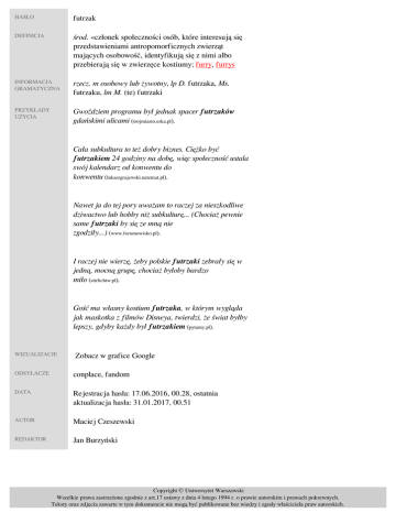 HASŁO futrzak DEFINICJA środ. «członek społeczności osób, które interesują się przedstawieniami antropomorficznych zwierząt mających osobowość, identyfikują się z nimi albo przebierają się w zwierzęce kostiumy; furry, furrys» INFORMACJA GRAMATYCZNA rzecz. m osobowy lub żywotny, lp D. futrzaka, Ms. futrzaku, lm M. (te) futrzaki PRZYKŁADY UŻYCIA Gwoździem programu był jednak spacer futrzaków gdańskimi ulicami (trojmiasto.eska.pl). Cała subkultura to też dobry biznes. Ciężko być futrzakiem 24 godziny na dobę, więc społeczność ustala swój kalendarz od konwentu do konwentu (lukaszgrajewski.natemat.pl). Nawet ja do tej pory uważam to raczej za nieszkodliwe dziwactwo lub hobby niż subkulturę... (Chociaż pewnie same futrzaki by się ze mną nie zgodziły...) (www.forumowisko.pl). I raczej nie wierzę, żeby polskie futrzaki zebrały się w jedną, mocną grupę, chociaż byłoby bardzo miło (stirlichtw.pl). Gość ma własny kostium futrzaka, w którym wygląda jak maskotka z filmów Disneya, twierdzi, że świat byłby lepszy, gdyby każdy był futrzakiem (pytamy.pl). WIZUALIZACJE Zobacz w grafice Google ODSYŁACZE conplace, fandom DATA Rejestracja hasła: 17.06.2016, 00.28, ostatnia aktualizacja hasła: 31.01.2017, 00.51 AUTOR Maciej Czeszewski REDAKTOR Jan Burzyński Copyright © Uniwersytet Warszawski Wszelkie prawa zastrzeżone zgodnie z art.17 ustawy z dnia 4 lutego 1994 r. o prawie autorskim i prawach pokrewnych. Teksty oraz zdjęcia zawarte w tym dokumencie nie mogą być publikowane bez wiedzy i zgody właściciela praw autorskich. Powered by TCPDF (www.tcpdf.org)