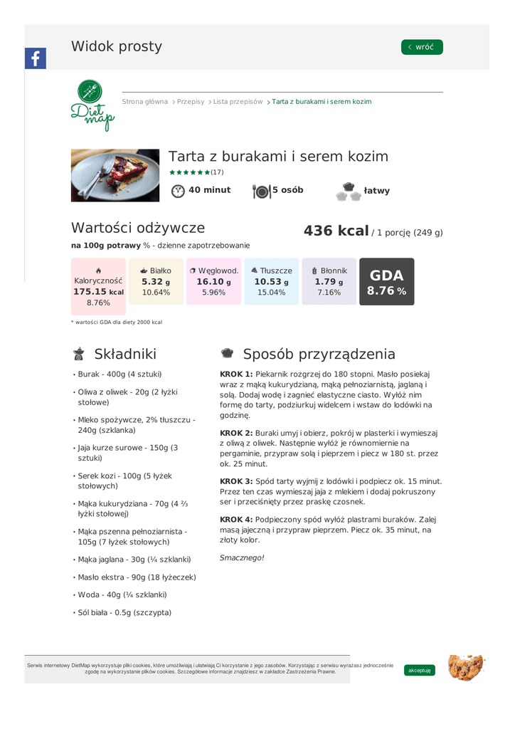 Tarta z burakami i serem kozim • Lista przepisów • DietMap