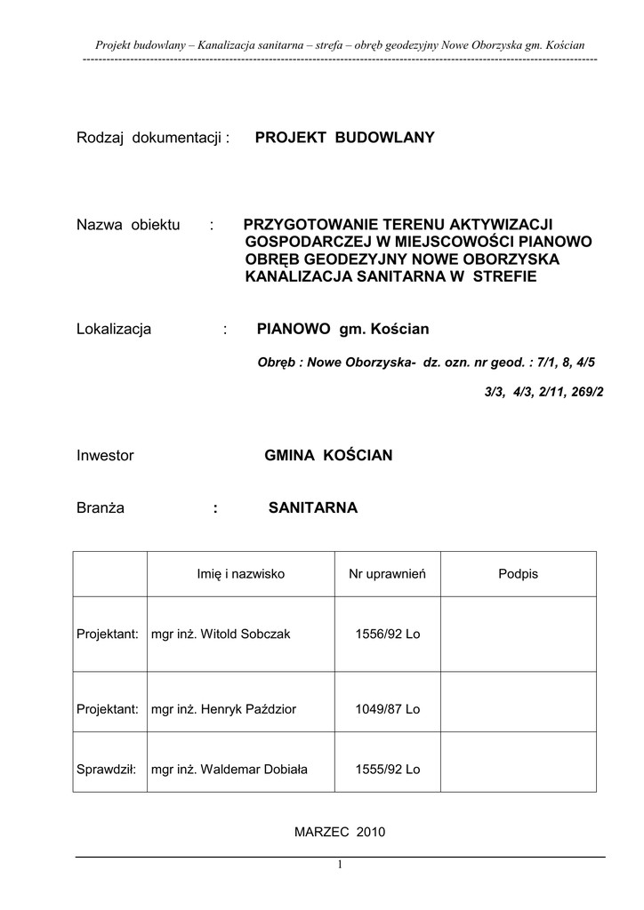 Projekt budowlany – Kanalizacja sanitarna – strefa – obręb geodezyjny Nowe Oborzyska gm. Kościan ---------------------------------------------------------------------------------------------------------------------------------- Rodzaj dokumentacji : Nazwa obiektu : Lokalizacja PROJEKT BUDOWLANY PRZYGOTOWANIE TERENU AKTYWIZACJI GOSPODARCZEJ W MIEJSCOWOŚCI PIANOWO OBRĘB GEODEZYJNY NOWE OBORZYSKA KANALIZACJA SANITARNA W STREFIE : PIANOWO gm. Kościan Obręb : Nowe Oborzyska- dz. ozn. nr geod. : 7/1, 8, 4/5 3/3, 4/3, 2/11, 269/2 Inwestor BranŜa GMINA KOŚCIAN : SANITARNA Imię i nazwisko Nr uprawnień Projektant: mgr inŜ. Witold Sobczak 1556/92 Lo Projektant: mgr inŜ. Henryk Paździor 1049/87 Lo Sprawdził: 1555/92 Lo mgr inŜ. Waldemar Dobiała MARZEC 2010 1 Podpis Projekt budowlany – Kanalizacja sanitarna – strefa – obręb geodezyjny Nowe Oborzyska gm. Kościan ---------------------------------------------------------------------------------------------------------------------------------- PROJEKT TECHNICZNY BUDOWY SIECI KANALIZACJI SANITARNEJ I PRZEPOMPOWNI W MIEJSCOWOŚCI PIANOWO – STREFA GM. KOŚCIAN Spis zawartości 1. Podstawa opracowania 2. Przedmiot, zakres i cel inwestycji 3. Materiały wyjściowe 4. Ogólna charakterystyka terenu inwestycji 4.1 Gospodarka wodno – ściekowa 4.2 Infrastruktura techniczna 5.0 Warunki gruntowo - wodne 6. Koncepcja rozwiązania technicznego 6.1 Ilość ścieków bytowo-gospodarczych 6.2 Parametry hydrauliczne projektowanych kolektorów 6.3 Lokalizacja kanalizacji sanitarnej 6.4 Przeszkody i kolizje 6.5 Obiekty i urządzenia na sieci. 6.5.1 Przepompownie ścieków 6.5.2 Pomiar ilości ścieków tłoczonych do miejskiej oczyszczalni ścieków 6.5.3 Pozostałe obiekty i urządzenia 6.6 Zastosowane materiały 6.7 Rozmiar rzeczowy. 7.0 Wytyczne wykonawstwa i odbiór techniczny. 7.1. Technologia robót ziemnych 7.2. Roboty montaŜowe 7.2.1 Przepompownie ścieków 7.2.1.1. Posadowienie 7.2.1.2. Układ hydrauliczny 7.2.1.3 Uruchomienie przepompowni 7.2.2 Kolektory i rurociągi tłoczne 8. Informacja dotycząca bezpieczeństwa i ochrony zdrowia 9. Uwagi końcowe 2 Projekt budowlany – Kanalizacja sanitarna – strefa – obręb geodezyjny Nowe Oborzyska gm. Kościan ---------------------------------------------------------------------------------------------------------------------------------- II._UZGODNIENIA I ZAŁĄCZNIKI 1. Uzgodnienia 1.1 Decyzja nr 25/10 Wójta Gminy Kościan z dnia 15.03.2010 roku w sprawie dróg gminnych 1.2 Starostwo Powiatowe w Kościanie Zespół Uzgadniania Dokumentacji Projektowej dla pow. kościańskiego - Opinia nr 469 /2009 z dnia 2009.10.21 2. Załączniki 2.1 Decyzja o ustaleniu lokalizacji inwestycji celu publicznego nr B.7331/117/09 z dnia 18.01.2010 r. wraz z załącznikami 2.2 Uchwała nr XXXI/291/09 Rady Gminy Kościan z dnia 13.10.2009 r w sprawie uchwalenia miejscowego planu zagospodarowania przestrzennego terenu aktywizacji zawodowej w części z prawem zabudowy mieszkaniowej w obrębie wsi Nowe Oborzyska i Kiełczewo. 2.3 Postanowienie Wójta Gminy Kościana nr GOŚ 7624/30/2009 z dnia 2009-10-05 w sprawie braku potrzeby przeprowadzenia oceny oddziaływania przedsięwzięcia na środowisko 2.4 Warunki techniczne Nr 62/2009 z dnia 19.10.2009 r. na wykonanie dokumentacji projektowej kanalizacji sanitarnej w m. Pianowo na działkach ozn. nr geod. 7/1, 4/5, 4/3, 2/11, 269/2 obręb Nowe Oborzyska wydane przez Urząd Gminy w Kościanie. 2.5 Wykaz właścicieli nieruchomości na których projektowana jest sieć kanalizacji sanitarnej z przyłączami i przepompownią PS1 2.6 Zestawienie sieci kanalizacji sanitarnej 2..7 Zestawienie kolektorów tłocznych 3 Projekt budowlany – Kanalizacja sanitarna – strefa – obręb geodezyjny Nowe Oborzyska gm. Kościan ---------------------------------------------------------------------------------------------------------------------------------- III.RYSUNKI 1. Mapa orientacyjna w skali 1 : 50 000 rys. nr 1 2. Mapy sytuacyjno-wysokościowe w skali 1 0000 rys. nr 2 3. Profile podłuŜne kolektorów K-1, K-2, K-3 rys. nr 3.1- 3.3 4 Przepompownia ścieków nr PS rys. nr 4 5. Przejście rurociągiem grawitacyjnym pod drogą gminną rys. nr 5 6. Studzienka kanalizacyjna rewizyjna średnicy 1 000 mm rys. nr 6 7. Studzienka kanalizacyjna rozpręŜna bet. średnicy 1 000 mm rys. nr 7 4 Projekt budowlany – Kanalizacja sanitarna – strefa – obręb geodezyjny Nowe Oborzyska gm. Kościan ---------------------------------------------------------------------------------------------------------------------------------- I.OPIS TECHNICZNY 1.Podstawa opracowania. Niniejsza dokumentacja techniczna na budowę kanalizacji sanitarnej dla części miejscowości PIANOWO obejmującej obszar aktywizacji gospodarczej opracowana została na podstawie umowy zawartej z Gminą Kościan. 2.Przedmiot, zakres i cel inwestycji Przedmiotem projektu jest sieć kanalizacji sanitarnej dla części miejscowości PIANOWO tworzącej obszar aktywizacji gospodarczej. Zakres zadania obejmuje budowę sieci kanalizacji sanitarnej z doprowadzeniem ścieków bytowo-gospodarczych systemem kolektorów grawitacyjnych, oraz przepompownią z kolektorem tłocznym do istniejącej sieci kanalizacji sanitarnej w m. Pianowo dz. nr 269/2, skąd ścieki przetransportowane zostaną do gminnej oczyszczalni mechaniczno-biologicznej w Starych Oborzyskach. Celem inwestycji jest stworzenie moŜliwości odprowadzania ścieków bytowo-gospodarczych z obszary aktywizacji gospodarczej w m. Pianowo do istniejącej gminnej mechanicznobiologicznej oczyszczalni w Starych Oborzyskach. Dokumentacja branŜy elektrycznej obejmująca zasilanie energetyczne przepompowni ścieków stanowi odrębne opracowanie nie objęte umową wyszczególnioną w pkt. 1. 3.Materiały wyjściowe. a) Mapy sytuacyjno-wysokościowe w skali 1 : 1000 wraz z inwentaryzacją istniejącego uzbrojenia podziemnego b) wizje terenowe, opinia o warunkach gruntowo-wo