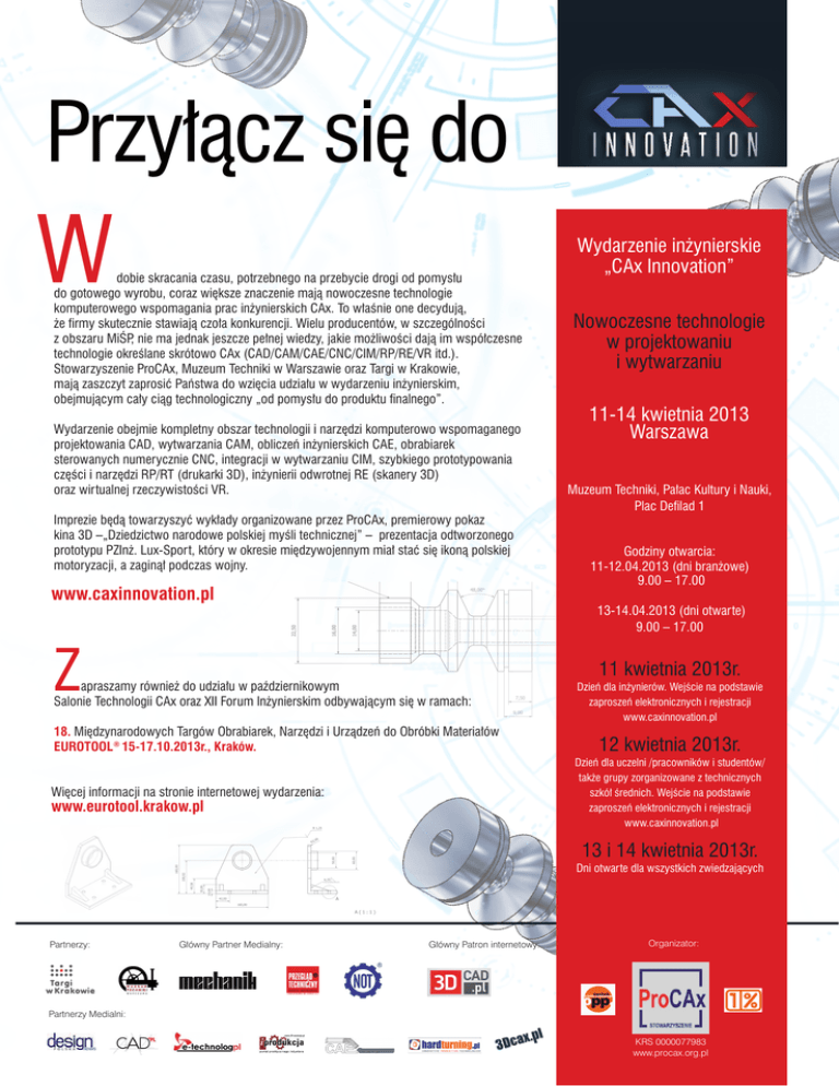 Przyłącz się do W dobie skracania czasu, potrzebnego na przebycie drogi od pomysłu do gotowego wyrobu, coraz większe znaczenie mają nowoczesne technologie komputerowego wspomagania prac inżynierskich CAx. To właśnie one decydują, że firmy skutecznie stawiają czoła konkurencji. Wielu producentów, w szczególności z obszaru MiŚP, nie ma jednak jeszcze pełnej wiedzy, jakie możliwości dają im współczesne technologie określane skrótowo CAx (CAD/CAM/CAE/CNC/CIM/RP/RE/VR itd.). Stowarzyszenie ProCAx, Muzeum Techniki w Warszawie oraz Targi w Krakowie, mają zaszczyt zaprosić Państwa do wzięcia udziału w wydarzeniu inżynierskim, obejmującym cały ciąg technologiczny „od pomysłu do produktu finalnego”. Wydarzenie obejmie kompletny obszar technologii i narzędzi komputerowo wspomaganego projektowania CAD, wytwarzania CAM, obliczeń inżynierskich CAE, obrabiarek sterowanych numerycznie CNC, integracji w wytwarzaniu CIM, szybkiego prototypowania części i narzędzi RP/RT (drukarki 3D), inżynierii odwrotnej RE (skanery 3D) oraz wirtualnej rzeczywistości VR. Imprezie będą towarzyszyć wykłady organizowane przez ProCAx, premierowy pokaz kina 3D –„Dziedzictwo narodowe polskiej myśli technicznej” – prezentacja odtworzonego prototypu PZInż. Lux-Sport, który w okresie międzywojennym miał stać się ikoną polskiej motoryzacji, a zaginął podczas wojny. www.caxinnovation.pl Wydarzenie inżynierskie „CAx Innovation” Nowoczesne technologie w projektowaniu i wytwarzaniu 11-14 kwietnia 2013 Warszawa Muzeum Techniki, Pałac Kultury i Nauki, Plac Defilad 1 Godziny otwarcia: 11-12.04.2013 (dni branżowe) 9.00 – 17.00 13-14.04.2013 (dni otwarte) 9.00 – 17.00 Z apraszamy również do udziału w październikowym Salonie Technologii CAx oraz XII Forum Inżynierskim odbywającym się w ramach: 18. Międzynarodowych Targów Obrabiarek, Narzędzi i Urządzeń do Obróbki Materiałów EUROTOOL® 15-17.10.2013r., Kraków. 11 kwietnia 2013r. Dzień dla inżynierów. Wejście na podstawie zaproszeń elektronicznych i rejestracji www.caxinnovation.pl 12 kwietnia 2013r. Dzień dla uczelni /pracowników i studentów/ także grupy zorganizowane z technicznych szkół średnich. Wejście na podstawie zaproszeń elektronicznych i rejestracji www.caxinnovation.pl Więcej informacji na stronie internetowej wydarzenia: www.eurotool.krakow.pl 13 i 14 kwietnia 2013r. Dni otwarte dla wszystkich zwiedzających Partnerzy: Główny Partner Medialny: Główny Patron internetowy: Organizator: Partnerzy Medialni: KRS 0000077983 www.procax.org.pl Firmy obecne podczas CAx Innovation OBERON 3D L. Pietrzak i Wspólnicy Sp. J. Firma OBERON 3D L. Pietrzak i Wspólnicy Sp. J. wprowadza na polski rynek urządzenia pomiarowe umożliwiające szybkie i dokładne dokonywanie pomiarów zróżnicowanych detali. Najpopularniejszym rozwiązaniem oferowanym przez firmę są skanery Shining 3D Tech Co Ltd 3D OptiScan. Jest to najbardziej wszechstronny typ skanerów dedykowany szybkim i dokładnym pomiarom małych i dużych detali. Ciekawym rozwiązaniem jest również Shining3D-Metric, stworzony z myślą o szybkich pomiarach elementów wielkogabarytowych oraz unikatowe cechy platformy Shiningform XOR. Tomografy firmy SHR ShakeGmbh, bazujące na oprogramowaniu Volume Graphics umożliwiają metody szybkiej kontroli jakości na podstawie porównania mierzonego detalu do pliku CAD, oraz zaawansowanych technik, jak pełna digitalizacja do postaci pliku STL lub obrazy konstrukcyjne będące efektem tomografii, do bezpośredniego przyrównania do pliku CAD bądź korzystając z metody odwrotnego odwzorowania, do stworzenia danego pliku. BAKPIT Firma BAKPIT oferuje swoim klientom kompleksową obsługę obejmującą pełen cykl życia produktu – od rysunku do wyrobu finalnego. Wysoka jakość produkcji osiągana jest przez nas dzięki wieloletniemu doświadczeniu. Atuty naszej firmy to: bogato wyposażone laboratorium pomiarowe, przygotowywanie indywidualnych rozwiązań technologicznych oraz oferowanie klientom wsparcia technicznego. Jesteśmy uznanym kooperantem dla wielu zagranicznych i krajowych producentów znanych marek.Oferujemy szeroki zakres usług CNC: - toczenie, frezowanie, gięcie, cięcie, wykrawanie, formowanie oraz wiele innych; - precyzyjne cięcie strumieniem wody; - szybkie prototypowanie. Obrabiamy różnego rodzaju materiały metodą obróbki skrawaniem między innymi: stale, stale nierdzewne, mosiądz, brąz, miedź, aluminium, tworzywa, odlewy. Szczególnie wyspecjalizowaliśmy się w obróbce materiałów trudnoobrabialnych. Smart Solutions Robert Kaczmarczyk SMART SOLUTIONS – to autoryzowany i wyłączny przedstawiciel wiodących firm na rynku tj. Nikon Metrology, Solutionix czy API Sensor, stosujących bezstykowe oraz stykowe metody pomiaru oraz digitalizacji mierzonych części . Posiadane w ofercie współrzędnościowe multisensoryczne maszyny pomiarowy, ramiona pomiarowe, maszyny optyczne działające z laserowymi głowicami skanującymi jak również tomografy komputerowe CT i skanery stereoskopowe pozwalające na zbieranie pełnych informacji o kontrolowanych częściach są szeroko stosowane przez wielu klientów w kraju i za granicą. Oferowane oprogramowanie Rapidform XOR firmy 3D Systems, pozwala na bardzo szybkie stworzenie parametrycznego modelu CAD skanowanej części. W celu przeprowadzenia kontroli jakości części z zeskanowanego detalu, wykorzystywane są oprogramowania FOCUS oraz Rapidform XOV. W celu uzyskania więcej informacji prosimy o kontakt z naszymi inżynierami lub pod adres [email protected]. SMARTTECH Sp. z o.o. Firma SMARTTECH produkująca skanery 3D od ponad 12 lat, ma swoje wdrożenia między innymi w branży motoryzacyjnej, tworzyw sztucznych, narzędziowej ale również w muzealnictwie i medycynie. Skanery 3D typu scan3D w połączeniu profesjonalnym oprogramowaniem do tworzenia raportów kontroli jakości oraz profesjonalnej dokumentacji st