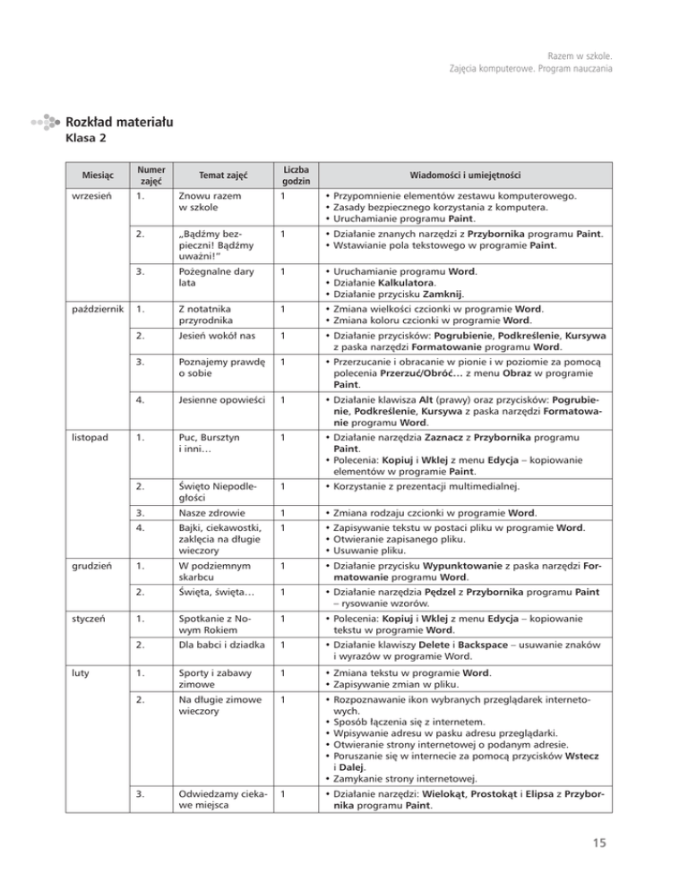 Razem w szkole. Zajęcia komputerowe. Program nauczania Rozkład materiału Klasa 2 Miesiąc wrzesień październik listopad grudzień styczeń luty Numer zajęć Temat zajęć Liczba godzin Wiadomości i umiejętności 1. Znowu razem w szkole 1 • Przypomnienie elementów zestawu komputerowego. • Zasady bezpiecznego korzystania z komputera. • Uruchamianie programu Paint. 2. „Bądźmy bezpieczni! Bądźmy uważni!” 1 • Działanie znanych narzędzi z Przybornika programu Paint. • Wstawianie pola tekstowego w programie Paint. 3. Pożegnalne dary lata 1 • Uruchamianie programu Word. • Działanie Kalkulatora. • Działanie przycisku Zamknij. 1. Z notatnika przyrodnika 1 • Zmiana wielkości czcionki w programie Word. • Zmiana koloru czcionki w programie Word. 2. Jesień wokół nas 1 • Działanie przycisków: Pogrubienie, Podkreślenie, Kursywa z paska narzędzi Formatowanie programu Word. 3. Poznajemy prawdę o sobie 1 • Przerzucanie i obracanie w pionie i w poziomie za pomocą polecenia Przerzuć/Obróć… z menu Obraz w programie Paint. 4. Jesienne opowieści 1 • Działanie klawisza Alt (prawy) oraz przycisków: Pogrubienie, Podkreślenie, Kursywa z paska narzędzi Formatowanie programu Word. 1. Puc, Bursztyn i inni… 1 • Działanie narzędzia Zaznacz z Przybornika programu Paint. • Polecenia: Kopiuj i Wklej z menu Edycja – kopiowanie elementów w programie Paint. 2. Święto Niepodległości 1 • Korzystanie z prezentacji multimedialnej. 3. Nasze zdrowie 1 • Zmiana rodzaju czcionki w programie Word. 4. Bajki, ciekawostki, zaklęcia na długie wieczory 1 • Zapisywanie tekstu w postaci pliku w programie Word. • Otwieranie zapisanego pliku. • Usuwanie pliku. 1. W podziemnym skarbcu 1 • Działanie przycisku Wypunktowanie z paska narzędzi Formatowanie programu Word. 2. Święta, święta… 1 • Działanie narzędzia Pędzel z Przybornika programu Paint – rysowanie wzorów. 1. Spotkanie z Nowym Rokiem 1 • Polecenia: Kopiuj i Wklej z menu Edycja – kopiowanie tekstu w programie Word. 2. Dla babci i dziadka 1 • Działanie klawiszy Delete i Backspace – usuwanie znaków i wyrazów w programie Word. 1. Sporty i zabawy zimowe 1 • Zmiana tekstu w programie Word. • Zapisywanie zmian w pliku. 2. Na długie zimowe wieczory 1 • Rozpoznawanie ikon wybranych przeglądarek internetowych. • Sposób łączenia się z internetem. • Wpisywanie adresu w pasku adresu przeglądarki. • Otwieranie strony internetowej o podanym adresie. • Poruszanie się w internecie za pomocą przycisków Wstecz i Dalej. • Zamykanie strony internetowej. 3. Odwiedzamy ciekawe miejsca 1 • Działanie narzędzi: Wielokąt, Prostokąt i Elipsa z Przybornika programu Paint. 15 Razem w szkole. Zajęcia komputerowe. Program nauczania Miesiąc marzec kwiecień maj czerwiec 16 Numer zajęć Temat zajęć Liczba godzin Wiadomości i umiejętności 1. Szkolna rodzina 1 • Pisanie tekstu w programie Paint: wstawianie pola tekstowego, zmiana rozmiaru czcionki. 2. Przyroda budzi się do życia 1 • Działanie narzędzia Linia z Przybornika programu Paint połączone z użyciem klawisza Shift. 3. Wielkanoc 1 • Działanie narzędzia Krzywa z Przybornika programu Paint. 1. Ciekawostki, zjawiska, odkrycia, wynalazki 1 • Działanie klawisza Alt (prawy). 2. Ziemia – błękitna planeta 1 • Ozdabianie tekstu w programie Word – Animacje. • Działanie klawiszy: Shift i Caps Lock. 3. Wiosna w sadzie i w ogrodzie 1 • Działanie przycisków: Wyrównaj do lewej, Wyśrodkuj, Wyrównaj do prawej, Wyjustuj z paska narzędzi Formatowanie programu Word. 1. Majowe święta 1 • Zapisywanie obrazka utworzonego w programie Paint w postaci pliku na Pulpicie. • Zmniejszanie i powiększanie elementów obrazka za pomocą narzędzia Zaznacz z Przybornika programu Paint i przeciągania narożnika ramki myszką. • Otwieranie zapisanego pliku. • Zamykanie pliku. • Usuwanie pliku. 2. Wędrówki po kraju ze Smokiem Wawelskim 1 • Działanie narzędzia Zaokrąglony prostokąt z Przybornika programu Paint. 3. Majowe poranki i wieczory 1 • Działanie poznanych narzędzi z Przybornika programu Paint. Powtórzenie wiadomości. 1. Wspólne rodzinne chwile 1 • Polecenia: Kopiuj i Wklej z menu Edycja – kopiowanie elementów w programie Paint. • Działanie polecenia Przerzuć/Obróć… z menu Obraz w programie Paint. • Działanie poznanych narzędzi z Przybornika programu Paint. Powtórzenie wiadomości. 2. Stąd jestem… 1 • Działanie poznanych klawiszy na klawiaturze. • Działanie poznanych przycisków z paska narzędzi Formatowanie programu Word. • Korzystanie z internetu – otwieranie stron o podanym adresie. Powtórzenie wiadomości. 3. Witamy lato w słońce bogate 1 • Działanie poznanych klawiszy na klawiaturze. • Działanie poznanych przycisków z paska narzędzi Formatowanie programu Word. • Zmiana tekstu. • Usuwanie tekstu. • Kopiowanie tekstu. Powtórzenie wiadomości. Razem w szkole. Zajęcia komputerowe. Program nauczania Plan wynikowy Klasa 2 Numer zajęć Temat zajęć Zakres materiału Osiągnięcia ucznia 1. Znowu razem w szkole • Przypomnienie elementów zestawu komputerowego. • Zasady bezpiecznego korzystania z komputera. • Uruchamianie programu Paint. • zna i nazywa elementy zestawu komputerowego; • zna i stosuje w praktyce zasady bezpiecznego korzystania z komputera; • samodzielnie uruchamia program Paint. 2. „Bądźmy bezpieczni! Bądźmy uważni!” • Działanie znanych narzędzi z Przybornika programu Paint. • Wstawianie pola tekstowego w programie Paint. • zna działanie poznanych narzędzi z Przybornika; • posługuje się poznanymi narzędziami z Przybornika, wykonując rysunek; • samodzielnie wstawia pole tekstowe na rysunku; • pisze tekst za pomocą klawiatury. 3. Pożegnalne dary lata • Uruchamianie programu Word. • Działanie Kalkulatora. • Działanie przycisku Zamknij. • samodzielnie uruchamia