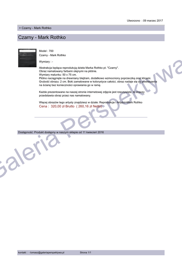 Utworzono : 09 marzec 2017 > Czarny - Mark Rothko Czarny - Mark Rothko Model : 700 Czarny - Mark Rothko a w ty Wymiary : - Abstrakcja będąca reprodukcją dzieła Marka Rothko pt. "Czarny". Obraz namalowany farbami olejnymi na płótnie. Wymiary malunku: 50 x 75 cm. Płótno naciągnięte na drewniany blejtram, dodatkowo wzmocniony poprzeczką oraz klinami. Grubość obrazu: 2 cm. Boki zamalowane w kolorystyce całości, obraz nadaje się do powieszenia na ścianę bez konieczności oprawiania go w ramę. k e Każde prezentowane na naszej stronie internetowej zdjęcie jest rzeczywiste, to znaczy przedstawia obraz przez nas namalowany. p rs Więcej obrazów tego artysty znajdziesz w dziale: Reprodukcje i Artyści>Mark Rothko Cena : 320,00 zł Brutto ( 260,16 zł Netto) a i r e l a e P Dostępność: Produkt dostępny w naszym sklepie od 11 kwiecień 2016 G kontakt : - [email protected] Strona 1/1