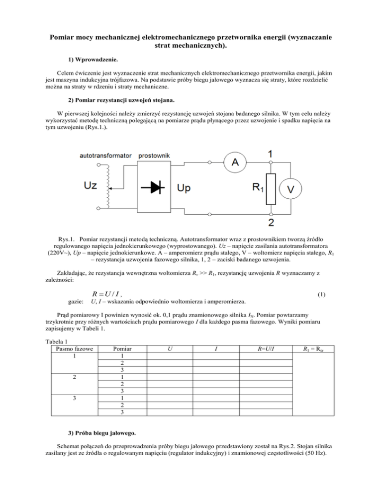 Pomiar mocy mechanicznej elektromechanicznego przetwornika energii (wyznaczanie strat mechanicznych). 1) Wprowadzenie. Celem ćwiczenie jest wyznaczenie strat mechanicznych elektromechanicznego przetwornika energii, jakim jest maszyna indukcyjna trójfazowa. Na podstawie próby biegu jałowego wyznacza się straty, które rozdzielić można na straty w rdzeniu i straty mechaniczne. 2) Pomiar rezystancji uzwojeń stojana. W pierwszej kolejności należy zmierzyć rezystancję uzwojeń stojana badanego silnika. W tym celu należy wykorzystać metodę techniczną polegającą na pomiarze prądu płynącego przez uzwojenie i spadku napięcia na tym uzwojeniu (Rys.1.). Rys.1. Pomiar rezystancji metodą techniczną. Autotransformator wraz z prostownikiem tworzą źródło regulowanego napięcia jednokierunkowego (wyprostowanego). Uz – napięcie zasilania autotransformatora (220V~), Up – napięcie jednokierunkowe. A – amperomierz prądu stałego, V – woltomierz napięcia stałego, R1 – rezystancja uzwojenia fazowego silnika, 1, 2 – zaciski badanego uzwojenia. Zakładając, że rezystancja wewnętrzna woltomierza Rv >> R1, rezystancję uzwojenia R wyznaczamy z zależności: gazie: R U/I , U, I – wskazania odpowiednio woltomierza i amperomierza. (1) Prąd pomiarowy I powinien wynosić ok. 0,1 prądu znamionowego silnika IN. Pomiar powtarzamy trzykrotnie przy różnych wartościach prądu pomiarowego I dla każdego pasma fazowego. Wyniki pomiaru zapisujemy w Tabeli 1. Tabela 1 Pasmo fazowe 1 2 3 Pomiar 1 2 3 1 2 3 1 2 3 U I R=U/I R1 = Rśr 3) Próba biegu jałowego. Schemat połączeń do przeprowadzenia próby biegu jałowego przedstawiony został na Rys.2. Stojan silnika zasilany jest ze źródła o regulowanym napięciu (regulator indukcyjny) i znamionowej częstotliwości (50 Hz). Pomiary przeprowadza się przy zwartym uzwojeniu wirnika (rezystancja rozruchowa Rr = 0) od napięcia najwyższego (1,1 ÷ 1,3 Un), stopniowo je obniżając tak, aby otrzymać co njmniej 12 punktów pomiarowych. Napięcie należy obniżyć do takiej wartości, przy której prąd biegu jałowego zaczyna ponownie wzrastać (odpowiada to wartości ok. 0,2 Un). Podczas próby należy dokonać pomiaru: - trzech napięć międzyprzewodowych UU,V,W; - trzech prądów przewodowych I0U,V,W; - mocy pobieranej P10. Rys.2. Schemat połączeń do próby biegu jałowego silnika indukcyjnego. RI – regulator indukcyjny napięcia zasilania silnika. V, A, W – odpowiednio woltomierze, amperomierze i watomierze napięcia przemiennego. Do pomiaru mocy pobieranej należy zastosować dwa watomierze w układzie Arona. Moc pobraną obliczamy w tym wypadku zgodnie z zależnością: P10 gdzie: P P , (2) Pα, Pβ – odpowiednio wskazania obu watomierzy. Straty biegu jałowego składają się ze strat w uzwojeniu stojana: Pu 0 gdzie: 3R1 I 02ph , (3) I0ph – fazowy prąd stojana przy biegu jałowym, i strat jałowych (strat w rdzeniu maszyny /straty wiroprądowe i histerezowe/ oraz strat mechanicznych /straty w łożyskach i straty wentylacyjne/). Straty jałowe wyznaczamy jako różnicę mocy pobranej i strat w uzwojeniach stojana: P0 P10 Pu0 . (4) Wyniki pomiaru zapisujemy w Tabeli 2: Tabela 2 UUV 1 2 3 4 5 6 7 8 9 10 11 12 UVW UUW U=Uśr I0U I0V I0W I0ph=Iśr Pα Pβ P10 Pu0 P0 4) Wyznaczenie strat mechanicznych Podczas przeprowadzanego eksperymentu prędkość obrotowa wirnika nie ulega zmianie, można więc przyjąć, że straty mechaniczne Pm są stałe. Natomiast straty w rdzeniu PFe są proporcjonalne do kwadratu indukcji a tym samym do kwadratu napięcia zasilającego. W rezultacie otrzymujemy: P0 Pm k1 k2U 2 . PFe (5) W celu rozdzielenia strat jałowych na straty w rdzeniu PFe i straty mechaniczne Pm ()czyli wyznaczenia parametrów k1 i k2) należy zlinearyzować równanie (5) przez dokonanie podstawienia z = U2 : P0 k1 k2 z , (6) a następnie skorzystać z regresji liniowej: N ( P0 n k2 P0 )( zn n 1 z) , k1 N ( zn z) P0 a z . (7) 2 n 1 gdzie: N – ilość pomiarów, P0 z 1 N P0 n – wartość średnia strat jałowych, N n1 1 N zn – wartość średnia kwadratu napięcia zasilającego. N n1 Następnie należy nanieść na wykresie zależność wyliczonych na podstawie pomiarów strat jałowych P0 od kwadratu napięcia zasilającego silnik i wykreślić charakterystykę uzyskaną metodą regresji liniowej (Rys.3.). Wartość start mechanicznych jest równa wyliczonemu wcześniej parametrowi k1, gdyż: P0 |U 0 k1 k2 0 k1 . (8) Rys.3. Rozkład strat jałowych silnika indukcyjnego na straty mechaniczne Pm i straty w rdzeniu PFe. Instrukcję opracował Adam Biernat