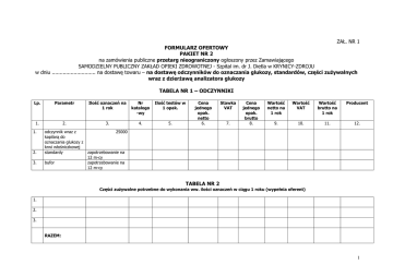 ZAŁ. NR 1 FORMULARZ OFERTOWY PAKIET NR 2 na zamówienia publiczne przetarg nieograniczony ogłoszony przez Zamawiającego SAMODZIELNY PUBLICZNY ZAKŁAD OPIEKI ZDROWOTNEJ - Szpital im. dr J. Dietla w KRYNICY-ZDROJU w dniu ............................ na dostawę towaru – na dostawę odczynników do oznaczania glukozy, standardów, części zużywalnych wraz z dzierżawą analizatora glukozy TABELA NR 1 – ODCZYNNIKI Lp. Parametr Ilość oznaczeń na 1 rok Nr katalogo -wy Ilość testów w 1 opak. 1. 2. 3. 4. 5. 1. 2. odczynnik wraz z kapilarą do oznaczania glukozy z krwi włośniczkowej standardy 3. bufor Cena jednego opak. netto 6. Stawka VAT 7. Cena jednego opak. brutto 8. Wartość netto na 1 rok Wartość VAT Wartość brutto na 1 rok Producent 9. 10. 11. 12. 25000 zapotrzebowanie na 12 m-cy zapotrzebowanie na 12 m-cy TABELA NR 2 Części zużywalne potrzebne do wykonania ww. ilości oznaczeń w ciągu 1 roku (wypełnia oferent) 1. 2. 3. RAZEM: 1 TABRLA NR 3 Dzierżawa analizatora glukozy L.p. DZIERŻAWA ANALIZATORA GLUKOZY Ilość opłat Czynsz dzierżawny za 1 m-c netto Stawka VAT Czynsz dzierżawny za 1 m-c brutto Wartość netto Wartość brutto 1. Opłata dzierżawna 12 RAZEM: TABELA NR 4 – Łączna wartość brutto /suma tabeli 1, 2 i 3/ Lp. Przedmiot 1. Odczynniki 2. Części zużywalne do analizatora 3. Opłata dzierżawna Łączna wartość brutto RAZEM: 2 ANALIZATOR GLUKOZY wraz z odczynnikami. Roczna ilość oznaczeń glukozy 25 000 sztuk wraz ze standardami oraz buforami i membranami LP WYMAGANY PARAMETR 1. Wydajność- 50 badań na godzinę 2. Metoda pomiarowa: • enzymatyczna lub • enzymatyczno-amperometryczna 3. Kalibracja: automatyczna 4. Materiał do badania: krew, surowica, osocze, mocz, płyn mózgowo-rdzeniowy 5. Ilość próbki do badania: max. 20 mikrolitrów krwi pełnej, surowicy lub osocza 6. Pojemność talerza próbek: min. 10 miejsc dla próbek, 1 pozycja dla surowic kontrolnych, 1 pozycja tzw. cito 7. Zakres pomiarowy: od 0,5 do 50 mmol/l, możliwość zmiany jednostek na mg/l 8. Analizy bez odwirowywania 9. Kapilarna metoda pobierania krwi 10. Próbki CITO: możliwość dokonania pomiaru CITO w dowolnym momencie pracy analizatora 11. Możliwość dołożenia próbek w czasie pomiaru bez obawy WPISAĆ OFEROWANY PARAMETR 3 wprowadzenia aparatu w błąd 12. Naczyńka na próbki: wymagane naczyńka o pojemności 1.5ml lub 2ml wypełnione odczynnikiem 13. Trwałość membrany: minimum 3000 oznaczeń 14. Temperatura pracy: +15...35 st.C 15. Wyjścia: do komputera zewnętrznego i do drukarki 16. Oprogramowanie: język polski 4