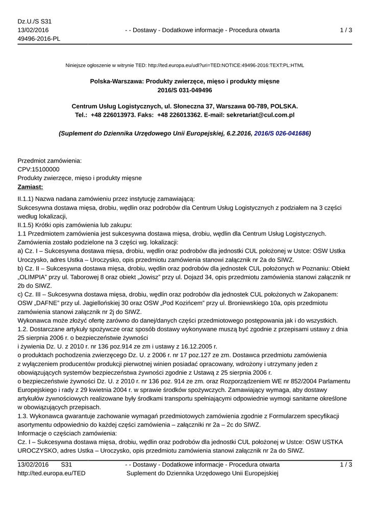 Dz.U./S S31 13/02/2016 49496-2016-PL - - Dostawy - Dodatkowe informacje - Procedura otwarta 1/3 Niniejsze ogłoszenie w witrynie TED: http://ted.europa.eu/udl?uri=TED:NOTICE:49496-2016:TEXT:PL:HTML Polska-Warszawa: Produkty zwierzęce, mięso i produkty mięsne 2016/S 031-049496 Centrum Usług Logistycznych, ul. Słoneczna 37, Warszawa 00-789, POLSKA. Tel.: +48 226013973. Faks: +48 226013362. E-mail: [email protected] (Suplement do Dziennika Urzędowego Unii Europejskiej, 6.2.2016, 2016/S 026-041686) Przedmiot zamówienia: CPV:15100000 Produkty zwierzęce, mięso i produkty mięsne Zamiast: II.1.1) Nazwa nadana zamówieniu przez instytucję zamawiającą: Sukcesywna dostawa mięsa, drobiu, wędlin oraz podrobów dla Centrum Usług Logistycznych z podziałem na 3 części według lokalizacji, II.1.5) Krótki opis zamówienia lub zakupu: 1.1 Przedmiotem zamówienia jest sukcesywna dostawa mięsa, drobiu, wędlin dla Centrum Usług Logistycznych. Zamówienia zostało podzielone na 3 części wg. lokalizacji: a) Cz. I – Sukcesywna dostawa mięsa, drobiu, wędlin oraz podrobów dla jednostki CUL położonej w Ustce: OSW Ustka Uroczysko, adres Ustka – Uroczysko, opis przedmiotu zamówienia stanowi załącznik nr 2a do SIWZ. b) Cz. II – Sukcesywna dostawa mięsa, drobiu, wędlin oraz podrobów dla jednostek CUL położonych w Poznaniu: Obiekt „OLIMPIA” przy ul. Taborowej 8 oraz obiekt „Jowisz” przy ul. Dojazd 34, opis przedmiotu zamówienia stanowi załącznik nr 2b do SIWZ. c) Cz. III – Sukcesywna dostawa mięsa, drobiu, wędlin oraz podrobów dla jednostek CUL położonych w Zakopanem: OSW „DAFNE” przy ul. Jagiellońskiej 30 oraz OSW „Pod Kozińcem” przy ul. Broniewskiego 10a, opis przedmiotu zamówienia stanowi załącznik nr 2j do SIWZ. Wykonawca może złożyć ofertę zarówno do danej/danych części przedmiotowego postępowania jak i do wszystkich. 1.2. Dostarczane artykuły spożywcze oraz sposób dostawy wykonywane muszą być zgodnie z przepisami ustawy z dnia 25 sierpnia 2006 r. o bezpieczeństwie żywności i żywienia Dz. U. z 2010 r. nr 136 poz.914 ze zm i ustawy z 16.12.2005 r. o produktach pochodzenia zwierzęcego Dz. U. z 2006 r. nr 17 poz.127 ze zm. Dostawca przedmiotu zamówienia z wyłączeniem producentów produkcji pierwotnej winien posiadać opracowany, wdrożony i utrzymany jeden z obowiązujących systemów bezpieczeństwa żywności zgodnie z Ustawą z 25 sierpnia 2006 r. o bezpieczeństwie żywności Dz. U. z 2010 r. nr 136 poz. 914 ze zm. oraz Rozporządzeniem WE nr 852/2004 Parlamentu Europejskiego i rady z 29 kwietnia 2004 r. w sprawie środków spożywczych. Zamawiający wymaga, aby dostawy artykułów żywnościowych realizowane były środkami transportu spełniającymi odpowiednie wymogi sanitarne określone w obowiązujących przepisach. 1.3. Wykonawca gwarantuje zachowanie wymagań przedmiotowych zamówienia zgodnie z Formularzem specyfikacji asortymentu odpowiednio do każdej części zamówienia – załączniki nr 2a – 2c do SIWZ. Informacje o częściach zamówienia: Cz. I – Sukcesywna dostawa mięsa, drobiu, wędlin oraz podrobów dla jednostki CUL położonej w Ustce: OSW USTKA UROCZYSKO, adres Ustka – Uroczysko, opis przedmiotu zamówienia stanowi załącznik nr 2a do SIWZ. 13/02/2016 S31 http://ted.europa.eu/TED - - Dostawy - Dodatkowe informacje - Procedura otwarta Suplement do Dziennika Urzędowego Unii Europejskiej 1/3 Dz.U./S S31 13/02/2016 49496-2016-PL - - Dostawy - Dodatkowe informacje - Procedura otwarta 2/3 (...) Cz. II – Sukcesywna dostawa mięsa, drobiu, wędlin oraz podrobów dla jednostek CUL położonych w Poznaniu: Obiekt „OLIMPIA” przy ul. Taborowej 8 oraz obiekt „JOWISZ” przy ul. Dojazd 34, opis przedmiotu zamówienia stanowi załącznik nr 2b do SIWZ, (...) Cz. III – Sukcesywna dostawa mięsa, drobiu, wędlin oraz podrobów dla jednostek CUL położonych w Zakopanem: OSW „DAFNE” przy ul. Jagiellońskiej 30 oraz OSW „POD KOZIŃCEM” przy ul. Broniewskiego 10a, opis przedmiotu zamówienia stanowi załącznik nr 2c do SIWZ. III.1.1) Wymagane wadia i gwarancje: Cz. II, III – 2 000 PLN Cz. I – Zamawiający nie wymaga wniesienia wadium w tej części postępowania, III.2.1) Sytuacja podmiotowa wykonawców, w tym wymogi związane z wpisem do rejestru zawodowego lub handlowego: 2) Posiadanie wiedzy i doświadczenia. Zamawiający uzna warunek za spełniony, jeżeli wykonawca wykaże, że wykonał w okresie ostatnich 3 lat przed upływem terminu składania ofert, a jeżeli okres prowadzenia działalności jest krótszy, w tym okresie minimum 1 dostawę mięsa lub produktów mięsnych o wartości min: Cz. II, III – 100 000 PLN brutto; Cz. I – 20 000 PLN brutto, Powinno być: II.1.1) Nazwa nadana zamówieniu przez instytucję zamawiającą: Sukcesywna dostawa mięsa, drobiu, wędlin oraz podrobów dla Centrum Usług Logistycznych z podziałem na 2 części według lokalizacji: II.1.5) Krótki opis zamówienia lub zakupu: 1.1 Przedmiotem zamówienia jest sukcesywna dostawa mięsa, drobiu, wędlin dla Centrum Usług Logistycznych. Zamówienia zostało podzielone na 2 części wg. lokalizacji: a) Cz. I – Sukcesywna dostawa mięsa, drobiu, wędlin oraz podrobów dla jednostek CUL położonych w Poznaniu: Obiekt „OLIMPIA” przy ul. Taborowej 8 oraz obiekt „JOWISZ” przy ul. Dojazd 34, opis przedmiotu zamówienia stanowi załącznik nr 2a do SIWZ, b) Cz. II – Sukcesywna dostawa mięsa, drobiu, wędlin oraz podrobów dla jednostek CUL położonych w Zakopanem: OSW „DAFNE” przy ul. Jagiellońskiej 30 oraz OSW „POD KOZIŃCEM” przy ul. Broniewskiego 10a, opis przedmiotu zamówienia stanowi załącznik nr 2b do SIWZ, Wykonawca może złożyć ofertę zarówno do danej/danych części przedmiotowego postępowania jak i do wszystkich. 1.2. Dostarczane artykuły spożywcze oraz sposób dostawy wykonywane muszą być zgodnie z przepisami ustawy z 25.8.2006 o bezpieczeństwie żywności