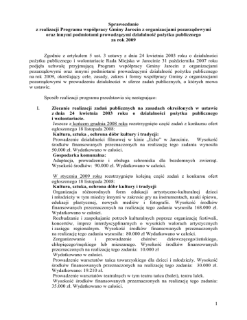 Sprawozdanie z realizacji Programu współpracy Gminy Jarocin z organizacjami pozarządowymi oraz innymi podmiotami prowadzącymi działalność poŜytku publicznego za rok 2009 Zgodnie z artykułem 5 ust. 3 ustawy z dnia 24 kwietnia 2003 roku o działalności poŜytku publicznego i wolontariacie Rada Miejska w Jarocinie 31 października 2007 roku podjęła uchwałę przyjmującą Program współpracy Gminy Jarocin z organizacjami pozarządowymi oraz innymi podmiotami prowadzącymi działalność poŜytku publicznego na rok 2009, określający cele, zasady, zakres i formy współpracy Gminy z organizacjami pozarządowymi w prowadzeniu działalności w sferze zadań publicznych, o których mowa w ustawie. Sposób realizacji programu przedstawia się następująco: I. Zlecanie realizacji zadań publicznych na zasadach określonych w ustawie z dnia 24 kwietnia 2003 roku o działalności poŜytku publicznego i wolontariacie. Jeszcze z końcem grudnia 2008 roku rozstrzygnięto część zadań z konkursu ofert ogłoszonego 18 listopada 2008: Kultura, sztuka , ochrona dóbr kultury i tradycji: Wysokość Prowadzenie działalności filmowej w kinie „Echo” w Jarocinie. środków finansowanych przeznaczonych na realizację tego zadania wynosiła 50.000 zł. Wydatkowano w całości. Gospodarka komunalna: Adaptacja, prowadzenie i obsługa schroniska dla bezdomnych zwierząt. Wysokość środków: 90.000 zł. Wydatkowano w całości. W styczniu 2009 roku rozstrzygnięto kolejną część zadań z konkursu ofert ogłoszonego 18 listopada 2008: Kultura, sztuka, ochrona dóbr kultury i tradycji: Organizacja róŜnorodnych form edukacji artystyczno-kulturalnej dzieci i młodzieŜy w tym miedzy innymi w zakresie gry na instrumentach, nauki śpiewu, edukacji plastycznej, nowych mediów i fotografii. Wysokość środków finansowanych przeznaczonych na realizację tego zadania wynosiła 168.000 zł. Wydatkowano w całości. Rozbudzanie i zaspokajanie potrzeb kulturalnych poprzez organizację festiwali, koncertów, imprez interdyscyplinarnych o wysokich walorach artystycznych i zasięgu regionalnym. Wysokość środków finansowanych przeznaczonych na realizację tego zadania wynosiła: 80.000 zł Wydatkowano w całości. Zorganizowanie i prowadzenie chórów: dziewczęcego/Ŝeńskiego, chłopięcego/męskiego lub mieszanego. Wysokość środków finansowanych przeznaczonych na realizację tego zadania: 10.000 zł Wydatkowano w całości. Prowadzenie warsztatów tańca towarzyskiego dla dzieci i młodzieŜy. Wysokość środków finansowanych przeznaczonych na realizację tego zadania: 30.000 zł. Wydatkowano: 19.210 zł. Prowadzenie warsztatów teatralnych w tym teatru tańca (balet), teatru lalek. Wysokość środków finansowanych przeznaczonych na realizację tego zadania: 35.000 zł. Wydatkowano w całości. 1 Prowadzenie warsztatów z zakresu haftu snutkowego. Wysokość środków finansowanych przeznaczonych na realizację tego zadania: 3.000 zł. Wydatkowano w całości. Zorganizowanie konferencji naukowej upamiętniającej 90. rocznicę wybuchu Powstania Wielkopolskiego. Wysokość środków finansowanych przeznaczonych na realizację tego zadania: 7.000 zł. Wydatkowano w całości. Ochrona i promocja zdrowia: Prowadzenie świetlic socjoterapeutycznych i opiekuńczo – wychowawczych dla dzieci i młodzieŜy. Wysokość środków: 100 000 zł. Wydatkowano w całości. Upowszechnianie kultury fizycznej i sportu: Prowadzenie szkółek i pozalekcyjnych zajęć sportowych dla dzieci i młodzieŜy. Wysokość środków finansowanych przeznaczonych na realizację tego zadania: 190.000 zł. Wydatkowano w całości. Nauka pływania w II semestrze roku szkolnego 2008/2009 oraz w I semestrze roku szkolnego 2009/2010. Wysokość środków finansowanych przeznaczonych na realizację tego zadania: 100.000 zł. Wydatkowano w całości. W lutym 2009 roku rozstrzygnięto kolejną część zadań z konkursu ofert ogłoszonego 18 listopada 2008: Kultura, sztuka, ochrona dóbr kultury i tradycji: Organizacja przedsięwzięć propagujących idee skautingu. Wysokość środków finansowanych przeznaczonych na realizację tego zadania: 8.000 zł. Wydatkowano w całości. Organizacja edukacji kulturalnej adresowanych do seniorów. Wysokość środków finansowanych przeznaczonych na realizację tego zadania: 7.000 zł Wydatkowano: 5 700 zł. Ochrona zabytkowych pojazdów kolejowych. Wysokość środków finansowanych przeznaczonych na realizację tego zadania: 7.000 zł. Wydatkowano w całości. Opracowanie i wydanie publikacji w formie ksiąŜkowej i czasopism o historii i dziedzictwie kulturowym Ziemi Jarocińskiej. Wysokość środków finansowanych przeznaczonych na realizację tego zadania: 30.000 zł. Wydatkowano 27.000 zł Promocja kultury i dziedzictwa kulturowego Gminy Jarocin poza granicami kraju. Wysokość środków finansowanych przeznaczonych na realizację tego zadania: 15.000 zł. Wydatkowano 10.000 zł. Krajoznawstwo: Popularyzacja wiedzy z zakresu krajoznawstwa poprzez organizację warsztatów i imprez krajoznawczych o zasięgu regionalnym promujących walory turystyczne Ziemi Jarocińskiej. Wysokość środków finansowanych przeznaczonych na realizację tego zadania: 20.000 zł. Wydatkowano 11.000 zł. Ochrona i promocja zdrowia: Organizacja przedsięwzięć integracyjnych o charakterze terapeutycznym dla osób uzaleŜnionych i członków ich rodzin. Wysokość środków finansowanych przeznaczonych na realizację tego zadania: 15.000 zł. Wydatkowano w całości. Organizacja przedsięwzięć promujących zdrowy styl Ŝycia wśród osób starszych. Wysokość środków finansowanych przeznaczonych na realizację tego zadania: 12.000 zł. Wydatkowano w całości. Upowszechnianie kultury fizycznej i sportu: Organizacja imprez, zawodów i turniejów sportowych. Wysokość środków finansowanych przeznaczonych na realizację tego zadania: 60.000 zł. Wydatkowano w całości. 2 W kwietniu 2009 roku ro