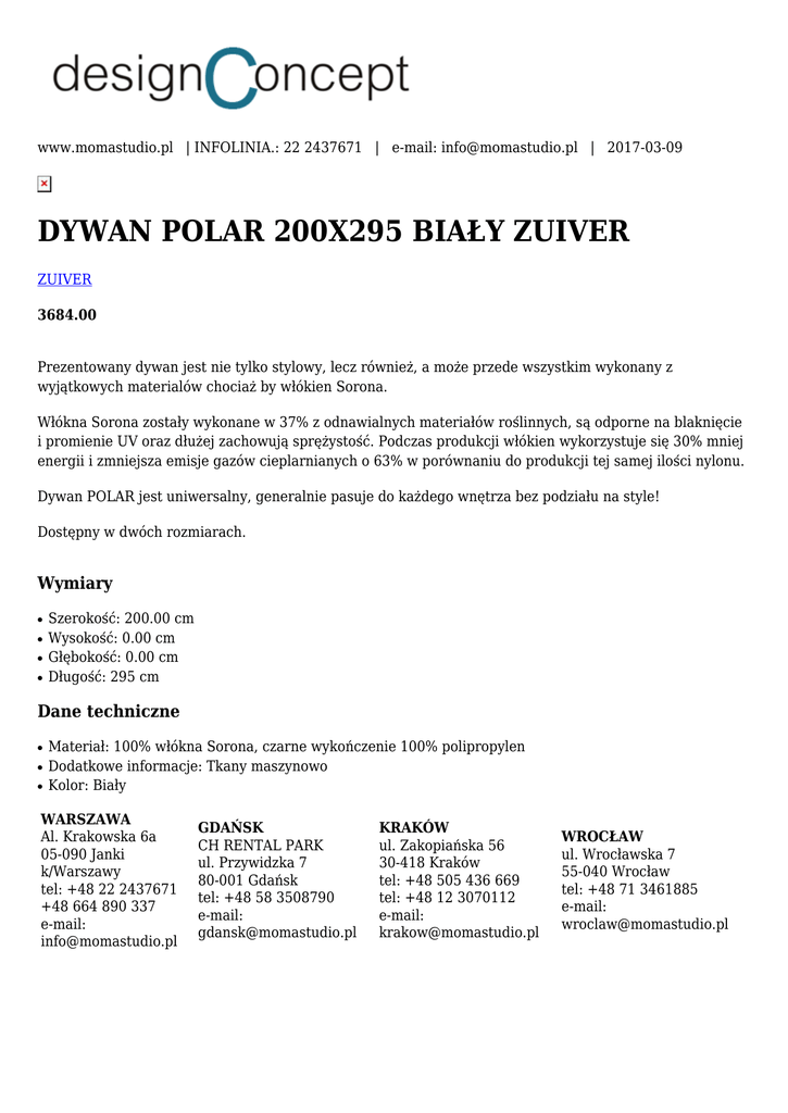 www.momastudio.pl | INFOLINIA.: 22 2437671 | e-mail: [email protected] | 2017-03-09 DYWAN POLAR 200X295 BIAŁY ZUIVER ZUIVER 3684.00 Prezentowany dywan jest nie tylko stylowy, lecz również, a może przede wszystkim wykonany z wyjątkowych materialów chociaż by włókien Sorona. Włókna Sorona zostały wykonane w 37% z odnawialnych materiałów roślinnych, są odporne na blaknięcie i promienie UV oraz dłużej zachowują sprężystość. Podczas produkcji włókien wykorzystuje się 30% mniej energii i zmniejsza emisje gazów cieplarnianych o 63% w porównaniu do produkcji tej samej ilości nylonu. Dywan POLAR jest uniwersalny, generalnie pasuje do każdego wnętrza bez podziału na style! Dostępny w dwóch rozmiarach. Wymiary ● ● ● ● Szerokość: 200.00 cm Wysokość: 0.00 cm Głębokość: 0.00 cm Długość: 295 cm Dane techniczne ● ● ● Materiał: 100% włókna Sorona, czarne wykończenie 100% polipropylen Dodatkowe informacje: Tkany maszynowo Kolor: Biały WARSZAWA Al. Krakowska 6a 05-090 Janki k/Warszawy tel: +48 22 2437671 +48 664 890 337 e-mail: [email protected] GDAŃSK CH RENTAL PARK ul. Przywidzka 7 80-001 Gdańsk tel: +48 58 3508790 e-mail: [email protected] KRAKÓW ul. Zakopiańska 56 30-418 Kraków tel: +48 505 436 669 tel: +48 12 3070112 e-mail: [email protected] WROCŁAW ul. Wrocławska 7 55-040 Wrocław tel: +48 71 3461885 e-mail: [email protected]