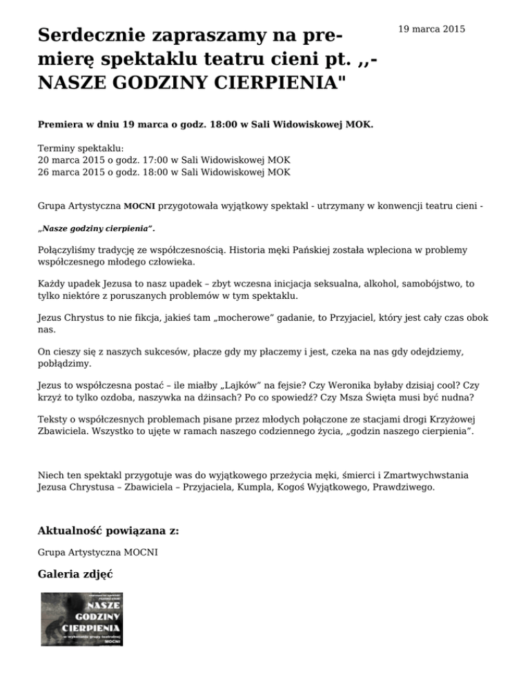 Serdecznie zapraszamy na premierę spektaklu teatru cieni pt. ,,NASZE GODZINY CIERPIENIA" 19 marca 2015 Premiera w dniu 19 marca o godz. 18:00 w Sali Widowiskowej MOK. Terminy spektaklu: 20 marca 2015 o godz. 17:00 w Sali Widowiskowej MOK 26 marca 2015 o godz. 18:00 w Sali Widowiskowej MOK Grupa Artystyczna MOCNI przygotowała wyjątkowy spektakl - utrzymany w konwencji teatru cieni „Nasze godziny cierpienia”. Połączyliśmy tradycję ze współczesnością. Historia męki Pańskiej została wpleciona w problemy współczesnego młodego człowieka. Każdy upadek Jezusa to nasz upadek – zbyt wczesna inicjacja seksualna, alkohol, samobójstwo, to tylko niektóre z poruszanych problemów w tym spektaklu. Jezus Chrystus to nie fikcja, jakieś tam „mocherowe” gadanie, to Przyjaciel, który jest cały czas obok nas. On cieszy się z naszych sukcesów, płacze gdy my płaczemy i jest, czeka na nas gdy odejdziemy, pobłądzimy. Jezus to współczesna postać – ile miałby „Lajków” na fejsie? Czy Weronika byłaby dzisiaj cool? Czy krzyż to tylko ozdoba, naszywka na dżinsach? Po co spowiedź? Czy Msza Święta musi być nudna? Teksty o współczesnych problemach pisane przez młodych połączone ze stacjami drogi Krzyżowej Zbawiciela. Wszystko to ujęte w ramach naszego codziennego życia, „godzin naszego cierpienia”. Niech ten spektakl przygotuje was do wyjątkowego przeżycia męki, śmierci i Zmartwychwstania Jezusa Chrystusa – Zbawiciela – Przyjaciela, Kumpla, Kogoś Wyjątkowego, Prawdziwego. Aktualność powiązana z: Grupa Artystyczna MOCNI Galeria zdjęć