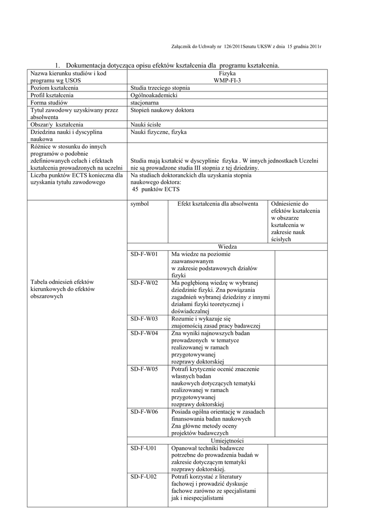 Załącznik do Uchwały nr 126/2011Senatu UKSW z dnia 15 grudnia 2011r 1. Dokumentacja dotycząca opisu efektów kształcenia dla programu kształcenia. Nazwa kierunku studiów i kod programu wg USOS Poziom kształcenia Profil kształcenia Forma studiów Tytuł zawodowy uzyskiwany przez absolwenta Obszar/y kształcenia Dziedzina nauki i dyscyplina naukowa Różnice w stosunku do innych programów o podobnie zdefiniowanych celach i efektach kształcenia prowadzonych na uczelni Liczba punktów ECTS konieczna dla uzyskania tytułu zawodowego Fizyka WMP-FI-3 Studia trzeciego stopnia Ogólnoakademicki stacjonarna Stopień naukowy doktora Nauki ścisłe Nauki fizyczne, fizyka Studia mają kształcić w dyscyplinie fizyka . W innych jednostkach Uczelni nie są prowadzone studia III stopnia z tej dziedziny. Na studiach doktoranckich dla uzyskania stopnia naukowego doktora: 45 punktów ECTS symbol SD-F-W01 Tabela odniesień efektów kierunkowych do efektów obszarowych SD-F-W02 SD-F-W03 SD-F-W04 SD-F-W05 SD-F-W06 SD-F-U01 SD-F-U02 Efekt kształcenia dla absolwenta Wiedza Ma wiedze na poziomie zaawansowanym w zakresie podstawowych działów fizyki Ma pogłębioną wiedzę w wybranej dziedzinie fizyki. Zna powiązania zagadnień wybranej dziedziny z innymi działami fizyki teoretycznej i doświadczalnej Rozumie i wykazuje się znajomością zasad pracy badawczej Zna wyniki najnowszych badan prowadzonych w tematyce realizowanej w ramach przygotowywanej rozprawy doktorskiej Potrafi krytycznie ocenić znaczenie własnych badan naukowych dotyczących tematyki realizowanej w ramach przygotowywanej rozprawy doktorskiej Posiada ogólna orientację w zasadach finansowania badan naukowych Zna główne metody oceny projektów badawczych Umiejętności Opanował techniki badawcze potrzebne do prowadzenia badań w zakresie dotyczącym tematyki rozprawy doktorskiej. Potrafi korzystać z literatury fachowej i prowadzić dyskusje fachowe zarówno ze specjalistami jak i niespecjalistami Odniesienie do efektów kształcenia w obszarze kształcenia w zakresie nauk ścisłych SD-F-U03 SD-F-U04 Tabela odniesień efektów kształcenia kierunkowych do efektów obszarowych SD-F-U05 SD-F-U06 SD-F-U07 SD-F-U08 SD-F-U09 SD-F-K01 SD-F-K02 SD-F-K03 Tabela odniesień efektów kształcenia kierunkowych do efektów obszarowych SD-F-K04 SD-F-K05 Posiada umiejętności wyrażania treści fizycznych w mowie i na piśmie, w tekstach fizycznych o różnym charakterze Posiada umiejętności i zdolność konstruowania własnych narzędzi badawczych Posiada zdolności komunikowania się ze studentami, współpracownikami naukowymi, prowadzenia dyskusji naukowych oraz stawiania i rozwiązywania problemów naukowych Posiada umiejętność interpretacji oraz prezentacji wyników otrzymywanych w trakcie pracy badawczej Posiada umiejętność posługiwania się językiem angielskim i potrafi prezentować wyniki własnych badań w tym języku Posiada umiejętność samodzielnego zaplanowania i przeprowadzenia projektu badawczego Potrafi sporządzić wniosek o przyznanie środków na realizacje projektu badawczego związanego z wybrana problematyką Kompetencje społeczne Ma kompetencje w zakresie prezentacji wyników oraz obrony własnych pomysłów na seminariach lub konferencjach naukowych. Dostosowuje sposób prezentacji własnej wiedzy i wyników własnych badan naukowych do wymagań odbiorcy. Potrafi współpracować z innymi pracownikami naukowymi w ramach wspólnych projektów badawczych. Potrafi wykorzystywać efekty współpracy w swoich badaniach uwzględniając prawa autorskie. Posiada kompetencje w zakresie organizacji pracy naukowej. 1. Dokumentacja związana z programem studiów. Nazwa kierunku studiów i kod programu wg USOS Poziom kształcenia Profil kształcenia Forma studiów Tytuł zawodowy uzyskiwany przez absolwenta Liczba punktów ECTS konieczna dla uzyskania tytułu zawodowego Liczba semestrów Fizyka WMP-FI-3 Studia trzeciego stopnia Ogólnoakademicki Stacjonarna Doktor Obszar/y kształcenia Dziedzina nauki i dyscyplina naukowa Wskazanie związku z misją UKSW i jej strategią rozwoju Ogólne cele kształcenia oraz mo liwości zatrudnienia(typowe miejsca pracy) i kontynuacji kształcenia przez absolwentów studiów Nauki ścisłe Nauki fizyczne, fizyka Wymagania wstępne(oczekiwane kompetencje kandydata) – zwłaszcza w przypadku studiów drugiego stopnia Zasady rekrutacji Dyplom magistra fizyki 45 8 Komisja rekrutacyjna Wydziału Matematyczno-Przyrodniczego ustala listę rankingową, zawierającą ocenę punktową kandydatów według następujących zasad: Kategoria Ocena rozmowy kwalifikacyjnej (kompetencje merytoryczne w zakresie dyscypliny naukowej, zainteresowania badawcze) Ocena na dyplomie Publikacje, aktywność naukowa Maksymalna liczba punktów 60 40 3. Wynik postepowania rekrutacyjnego określa się następująco: 80-100 pkt – wynik bardzo dobry, 50-79 pkt – wynik dobry, Poniżej 50 punktów - wynik niedostateczny 4. Minimalna liczba punktów wymagana do przyjęcia na studia doktoranckie na Wydziale Matematyczno-Przyrodniczym wynosi 50. Minimum kadrowe z przyporządkowaniem poszczególnych osób do dyscyplin naukowych Warunki realizacji programu studiów Np. tabela wydziałowa przekazywana do Działu Kadr i Spraw Socjalnych prof. dr hab. Marek Godlewski prof. dr hab. Jan Mostowski prof. dr hab. Magdalena Załuska-Kotur prof. dr hab. Wiesław Macek dr hab. Grzegorz Grabecki dr hab. Krystyna Lukierska-Walasek dr hab. Aleksander Wittlin dr hab. Tomasz Radożycki dr hab. Marek Wolf Proporcja liczby nauczycieli akademickich stanowiących minimum kadrowe do liczby studiujących 10/40 Opis działalności badawczej w odpowiednim obszarze wiedzy- w przypadku studiów prowadzących do uzyskania dyplomu magisterskiego Wymiar, zasady i forma odbywania praktyk Sumaryczne wskaźniki (punkty ECTS) charakteryzujące program studiów Studenci studiów doktoranckich prowadzą zajęcia dla studentów studiów I i II stopn