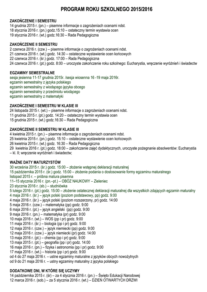 PROGRAM ROKU SZKOLNEGO 2015/2016 ZAKOŃCZENIE I SEMESTRU 14 grudnia 2015 r. (pn.) – pisemne informacje o zagrożeniach ocenami ndst. 18 stycznia 2016 r. (pn.) godz.15:10 – ostateczny termin wystawia ocen 19 stycznia 2016 r. (wt.) godz.16:30 – Rada Pedagogiczna ZAKOŃCZENIE II SEMESTRU 2 czerwca 2016 r. (czw.) – pisemne informacje o zagrożeniach ocenami ndst. 21 czerwca 2016 r. (wt.) godz. 14:30 – ostateczne wystawienie ocen końcowych 22 czerwca 2016 r. (śr.) godz. 17:00 – Rada Pedagogiczna 24 czerwca 2016 r. (pt.) godz. 8:00 – uroczyste zakończenie roku szkolnego: Eucharystia, wręczenie wyróżnień i świadectw EGZAMINY SEMESTRALNE sesja jesienna 11-17 grudnia 2015r. /sesja wiosenna 16 -19 maja 2016r. egzamin semestralny z języka polskiego egzamin semestralny z wiodącego języka obcego egzamin semestralny z przedmiotu wiodącego egzamin semestralny z matematyki ZAKOŃCZENIE I SEMESTRU W KLASIE III 24 listopada 2015 r. (wt.) – pisemne informacje o zagrożeniach ocenami ndst. 11 grudnia 2015 r. (pt.) godz. 14:20 – ostateczny termin wystawia ocen 15 grudnia 2015 r. (wt.) godz.16:30 – Rada Pedagogiczna ZAKOŃCZENIE II SEMESTRU W KLASIE III 4 kwietnia 2015 r. (pn.) – pisemne informacje o zagrożeniach ocenami ndst. 25 kwietnia 2015 r. (pn.) godz. 15:10 – ostateczne wystawienie ocen końcowych 26 kwietnia 2015 r. (wt.) godz. 16:30 – Rada Pedagogiczna 29 kwietnia 2016 r. (pt.) godz. 18:00 – zakończenie zajęć dydaktycznych, uroczyste pożegnanie absolwentów: Eucharystia – kl. II; wręczenie wyróżnień i świadectw; WAŻNE DATY MATURZYSTÓW 30 września 2015 r. (śr.) godz. 15:00 – złożenie wstępnej deklaracji maturalnej 15 października 2015 r. (śr.) godz. 15:00 – złożenie podania o dostosowanie formy egzaminu maturalnego listopad 2015 r. – próbna matura pisemna 11–15 stycznia 2016 r. (pn.–pt.) – OBÓZ NAUKOWY – Zieleniec 23 stycznia 2016 r. (sb.) – studniówka 5 lutego 2016 r. (pt.) godz. 15:00 – złożenie ostatecznej deklaracji maturalnej dla wszystkich zdających egzamin maturalny 4 maja 2016 r. (śr.) – język polski (poziom podstawowy, pp) godz. 9:00 4 maja 2016 r. (śr.) – język polski (poziom rozszerzony, pr) godz. 14:00 5 maja 2016 r. (czw.) – matematyka (pp) godz. 9:00 6 maja 2016 r. (pt.) – język angielski (pp) godz. 9:00 9 maja 2016 r. (pn.) – matematyka (pr) godz. 9:00 10 maja 2016 r. (wt.) – WOS (pp i pr) godz. 9:00 11 maja 2016 r. (śr.) – biologia (pp i pr) godz. 9:00 12 maja 2016 r. (czw.) – język niemiecki (pp) godz. 9:00 12 maja 2016 r. (czw.) – język niemiecki (pr) godz. 14:00 13 maja 2016 r. (pt.) – chemia (pp i pr) godz. 9:00 13 maja 2015 r. (pt.) – geografia (pp i pr) godz. 14:00 16 maja 2016 r. (pn.) – fizyka i astronomia (pp i pr) godz. 9:00 17 maja 2016 r. (wt.) – historia (pp i pr) godz. 9:00 od 4 do 27 maja 2016 r. – ustne egzaminy maturalne z języków obcych nowożytnych od 9 do 21 maja 2016 r. – ustny egzaminy maturalny z języka polskiego DODATKOWE DNI, W KTÓRE SIĘ UCZYMY 14 października 2015 r. (śr) – za 4 stycznia 2016 r. (pn.) – Święto Edukacji Narodowej 12 marca 2016 r. (sob.) – za 5 stycznia 2016 r. (wt.) – DZIEŃ OTWARTYCH DRZWI DNI WOLNE OD NAUKI 11 listopada 2015 r. (śr.) – Święto Nieodległości 23 grudnia 2015 r. – 6 stycznia 2016 r. (śr.–śr.) – przerwa bożonarodzeniowa 31 stycznia – 14 lutego 2016 r. (sob.–nd.) – ferie zimowe 24–29 marca 2016 r. (czw.–wt.) – przerwa wielkanocna 1–3 maja 2016 r. (nd.–wt.) – przerwa majowa 26–29 maja 2016 r. (czw.–nd.) – święto Bożego Ciała REKOLEKCJE SZKOLNE 4 grudnia 2015 r. (pt.) – Adwentowy Dzień Skupienia 17–19 lutego 2016 r. (śr.–pt.) – Rekolekcje Wielkopostne SPOTKANIA Z RODZICAMI WYWIADÓWKI (18:00 – konferencja wychowawcza, 18:30 – spotkanie z wychowawcami, 19:00–20:00 – konsultacje) 8 września 2015 r. (wt.) godz. 18.00 – zebranie organizacyjne roku szkolnego 2015/2016 i spotkanie z wychowawcami 20 października 2015 r. (wt.) godz. 18:00 – zebranie rodziców klas I – III, konsultacje klas I–III 17 listopada 2015 r. (wt.) godz. 18:00 – zebranie rodziców klas I – III, konsultacje klas I–III 15 grudnia 2014 r. (wt.) godz. 18:00 – zebranie rodziców klas I – III, konsultacje klas I–III 26 stycznia 2016 r. (wt.) godz. 18:00 – zebranie rodziców klas I – III, konsultacje klas I–III 22 marca 2016 r. (wt.) godz. 18:00 – zebranie rodziców klasy I – III, konsultacje klas I–III 19 kwietnia 2016 r. (wt.) godz. 18:00 – zebranie rodziców klasy III, konsultacje klas I–II 7 czerwca 2016 (wt.) godz. 18:00 – zebranie rodziców klas I – II, konsultacje klas I–II SPOTKANIA DODATKOWE DLA NAUCZYCIELI 17 października 2015 r. (sb.) – godz. 20:00 – wieczór integracyjny dla nauczycieli z okazji święta KEN 17 grudnia 2015 r. (czw.) godz. 18:00 – spotkanie „opłatkowe” Rodziców, Grona Pedagogicznego, Uczniów i Sympatyków Szkoły - (SU) UROCZYSTOŚCI SZKOLNE 10 września 2015 r.(czw.) godz.10:00 – uroczysta inauguracja roku szkolnego szkół katolickich archidiecezji wrocławskiej z ks. abp J.Kupnym 17 września 2015 r. (czw.) – rocznica Kampanii Wrześniowej w Polsce w 1939 r. – apel - kl. III 9 października 2015 r. (pt.) – Dzień Papieski – apel - służba liturgiczna i SU 13 października 2015 r. (wt.) – akademia z okazji Dnia Komisji Edukacji Narodowej – akademia - kl. II 30 października 2015 r. (pt.) – szkolne Wspomnienia Wszystkich Świętych – apel - kl. I 10 listopada 2015 r. (wt.) – Święto Niepodległości – akademia - kl. II 4 grudnia 2014 r. (pt.) – uroczystość Niepokalanego Poczęcia NMP – kl. I 11 grudnia 2015 r. (pt.) – rocznica wprowadzenia Stanu Wojennego – apel - kl. III 17 grudnia 2015 r. (czw.) godz. 18:00 – spotkanie „opłatkowe” Rodziców, Grona Pedagogicznego, Uczniów i Sympatyków Szkoły – (SU) 29 stycznia 2016 r. (pt.) – uroczystość 