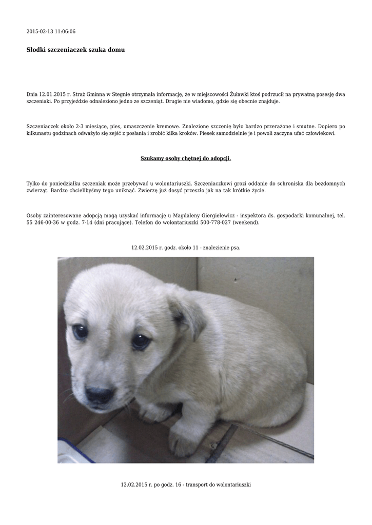 2015-02-13 11:06:06 Słodki szczeniaczek szuka domu Dnia 12.01.2015 r. Straż Gminna w Stegnie otrzymała informację, że w miejscowości Żuławki ktoś podrzucił na prywatną posesję dwa szczeniaki. Po przyjeździe odnaleziono jedno ze szczeniąt. Drugie nie wiadomo, gdzie się obecnie znajduje. Szczeniaczek około 2-3 miesiące, pies, umaszczenie kremowe. Znalezione szczenię było bardzo przerażone i smutne. Dopiero po kilkunastu godzinach odważyło się zejść z posłania i zrobić kilka kroków. Piesek samodzielnie je i powoli zaczyna ufać człowiekowi. Szukamy osoby chętnej do adopcji. Tylko do poniedziałku szczeniak może przebywać u wolontariuszki. Szczeniaczkowi grozi oddanie do schroniska dla bezdomnych zwierząt. Bardzo chcielibyśmy tego uniknąć. Zwierzę już dosyć przeszło jak na tak krótkie życie. Osoby zainteresowane adopcją mogą uzyskać informację u Magdaleny Giergielewicz - inspektora ds. gospodarki komunalnej, tel. 55 246-00-36 w godz. 7-14 (dni pracujące). Telefon do wolontariuszki 500-778-027 (weekend). 12.02.2015 r. godz. około 11 - znalezienie psa. 12.02.2015 r. po godz. 16 - transport do wolontariuszki 12.02.2015 r. po godz. 19.20 - szczenie nie ufa, nie chce opuścić legowiska 13.02.2015 r. okoo godz. 8 - szczenie samo je i zaczyna pierwsze spacerki poza legowisko Kto przygarnie szczenię? Informacje o artykule Autor: Zredagował(a): Marta Kozłowska Data powstania: 13.02.2015 11:06 Data ostatniej modyfikacji: Liczba wyświetleń: Wydrukowano z serwisu: Wydrukowano dnia: 614 stegna.pl 2017-03-09 02:45:25