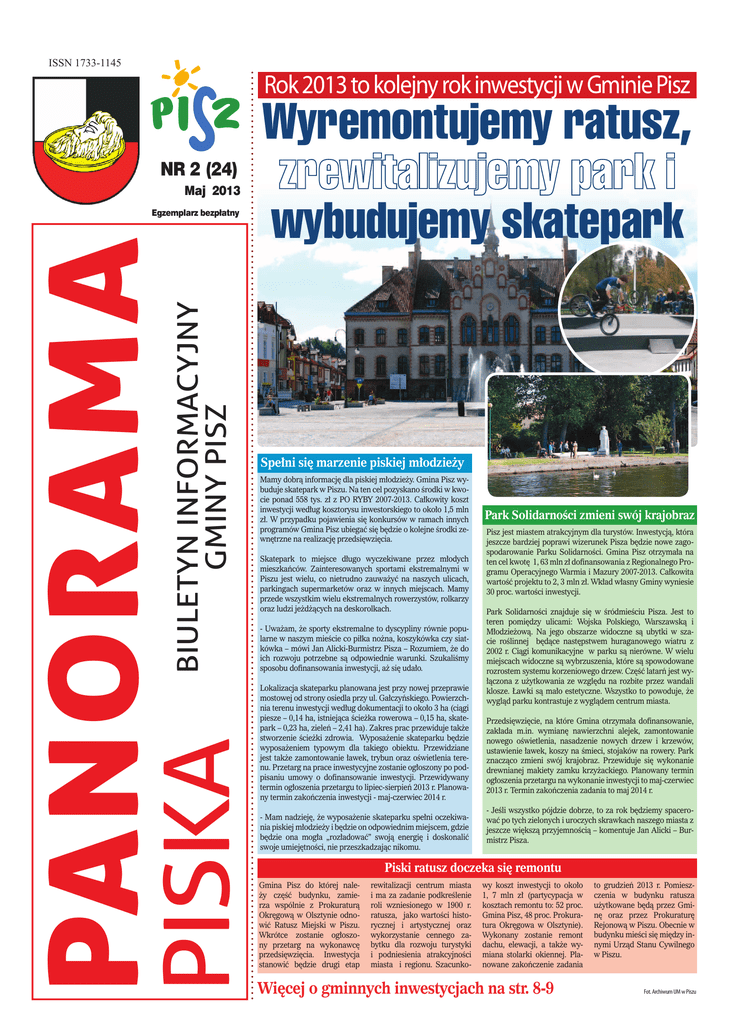 ISSN 1733-1145 Rok 2013 to kolejny rok inwestycji w Gminie Pisz Wyremontujemy ratusz, NR 2 (24) Maj 2013 piska BiuletyN iNFoRmacyjNy GmiNy pisz PANORAMA Egzemplarz bezpłatny wybudujemy skatepark Spełni się marzenie piskiej młodzieży Mamy dobrą informację dla piskiej młodzieży. Gmina Pisz wybuduje skatepark w Piszu. Na ten cel pozyskano środki w kwocie ponad 558 tys. zł z PO RYBY 2007-2013. Całkowity koszt inwestycji według kosztorysu inwestorskiego to około 1,5 mln zł. W przypadku pojawienia się konkursów w ramach innych programów Gmina Pisz ubiegać się będzie o kolejne środki zewnętrzne na realizację przedsięwzięcia. Skatepark to miejsce długo wyczekiwane przez młodych mieszkańców. Zainteresowanych sportami ekstremalnymi w Piszu jest wielu, co nietrudno zauważyć na naszych ulicach, parkingach supermarketów oraz w innych miejscach. Mamy przede wszystkim wielu ekstremalnych rowerzystów, rolkarzy oraz ludzi jeżdżących na deskorolkach. - Uważam, że sporty ekstremalne to dyscypliny równie popularne w naszym mieście co piłka nożna, koszykówka czy siatkówka – mówi Jan Alicki-Burmistrz Pisza – Rozumiem, że do ich rozwoju potrzebne są odpowiednie warunki. Szukaliśmy sposobu dofinansowania inwestycji, aż się udało. Lokalizacja skateparku planowana jest przy nowej przeprawie mostowej od strony osiedla przy ul. Gałczyńskiego. Powierzchnia terenu inwestycji według dokumentacji to około 3 ha (ciągi piesze – 0,14 ha, istniejąca ścieżka rowerowa – 0,15 ha, skatepark – 0,23 ha, zieleń – 2,41 ha). Zakres prac przewiduje także stworzenie ścieżki zdrowia. Wyposażenie skateparku będzie wyposażeniem typowym dla takiego obiektu. Przewidziane jest także zamontowanie ławek, trybun oraz oświetlenia terenu. Przetarg na prace inwestycyjne zostanie ogłoszony po podpisaniu umowy o dofinansowanie inwestycji. Przewidywany termin ogłoszenia przetargu to lipiec-sierpień 2013 r. Planowany termin zakończenia inwestycji - maj-czerwiec 2014 r. - Mam nadzieję, że wyposażenie skateparku spełni oczekiwania piskiej młodzieży i będzie on odpowiednim miejscem, gdzie będzie ona mogła „rozładować” swoją energię i doskonalić swoje umiejętności, nie przeszkadzając nikomu. Park Solidarności zmieni swój krajobraz Pisz jest miastem atrakcyjnym dla turystów. Inwestycją, która jeszcze bardziej poprawi wizerunek Pisza będzie nowe zagospodarowanie Parku Solidarności. Gmina Pisz otrzymała na ten cel kwotę 1, 63 mln zł dofinansowania z Regionalnego Programu Operacyjnego Warmia i Mazury 2007-2013. Całkowita wartość projektu to 2, 3 mln zł. Wkład własny Gminy wyniesie 30 proc. wartości inwestycji. Park Solidarności znajduje się w śródmieściu Pisza. Jest to teren pomiędzy ulicami: Wojska Polskiego, Warszawską i Młodzieżową. Na jego obszarze widoczne są ubytki w szacie roślinnej będące następstwem huraganowego wiatru z 2002 r. Ciągi komunikacyjne w parku są nierówne. W wielu miejscach widoczne są wybrzuszenia, które są spowodowane rozrostem systemu korzeniowego drzew. Część latarń jest wyłączona z użytkowania ze względu na rozbite przez wandali klosze. Ławki są mało estetyczne. Wszystko to powoduje, że wygląd parku kontrastuje z wyglądem centrum miasta. Przedsięwzięcie, na które Gmina otrzymała dofinansowanie, zakłada m.in. wymianę nawierzchni alejek, zamontowanie nowego oświetlenia, nasadzenie nowych drzew i krzewów, ustawienie ławek, koszy na śmieci, stojaków na rowery. Park znacząco zmieni swój krajobraz. Przewiduje się wykonanie drewnianej makiety zamku krzyżackiego. Planowany termin ogłoszenia przetargu na wykonanie inwestycji to maj-czerwiec 2013 r. Termin zakończenia zadania to maj 2014 r. - Jeśli wszystko pójdzie dobrze, to za rok będziemy spacerować po tych zielonych i uroczych skrawkach naszego miasta z jeszcze większą przyjemnością – komentuje Jan Alicki – Burmistrz Pisza. Piski ratusz doczeka się remontu Gmina Pisz do której należy część budynku, zamierza wspólnie z Prokuraturą Okręgową w Olsztynie odnowić Ratusz Miejski w Piszu. Wkrótce zostanie ogłoszony przetarg na wykonawcę przedsięwzięcia. Inwestycja stanowić będzie drugi etap rewitalizacji centrum miasta i ma za zadanie podkreślenie roli wzniesionego w 1900 r. ratusza, jako wartości historycznej i artystycznej oraz wykorzystanie cennego zabytku dla rozwoju turystyki i podniesienia atrakcyjności miasta i regionu. Szacunko- wy koszt inwestycji to około 1, 7 mln zł (partycypacja w kosztach remontu to: 52 proc. Gmina Pisz, 48 proc. Prokuratura Okręgowa w Olsztynie). Wykonany zostanie remont dachu, elewacji, a także wymiana stolarki okiennej. Planowane zakończenie zadania Więcej o gminnych inwestycjach na str. 8-9 to grudzień 2013 r. Pomieszczenia w budynku ratusza użytkowane będą przez Gminę oraz przez Prokuraturę Rejonową w Piszu. Obecnie w budynku mieści się między innymi Urząd Stanu Cywilnego w Piszu. Fot. Archiwum UM w Piszu 2 BIULETYN INFORMACYJNY GMINY PISZ Planujemy nowe inwestycje Szanowni Państwo, N areszcie wiosna! Chyba każdy odetchnął z ulgą, gdy zima w końcu puściła. Trwają wiosenne prace porządkowe. Porządkowane są ulice i parki, naprawiane są drogi, na nowo widać ruch przy inwestycjach. Po zimowym przestoju z nową mocą ruszają prace tak ważne dla naszej społeczności. Przygotowujemy się także do nowych inwestycji, które będą uruchomione niebawem. Mam na myśli remont ratusza, budowę skateparku, rewitalizację Parku Solidarności. Trwają prace związane z drugim etapem zagospodarowania plaży miejskiej. Pragnę przypomnieć, że w ramach tego przedsięwzięcia zaplanowano wykonanie modernizacji Al. Turystów i parkingu oraz budowę boiska do siatkówki, drewnianych wiat, placu zabaw i miejsca do grillowania. Zostanie również wyremontowany stary pomost, który będzie wyposażony w stanowiska dla niepełnosprawnych wędk