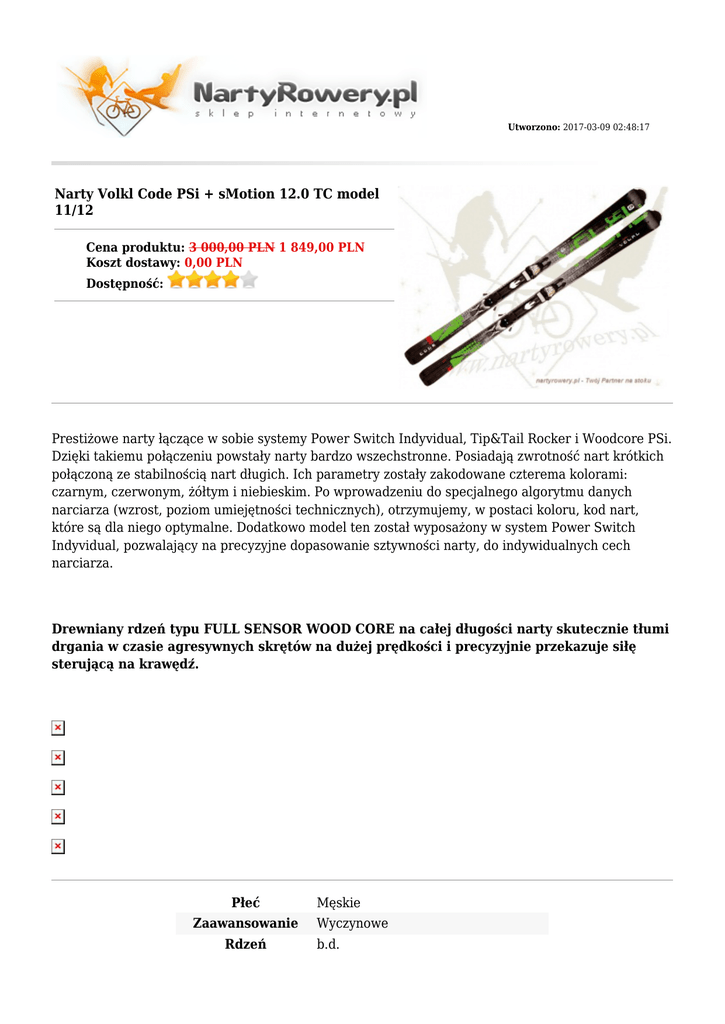 Utworzono: 2017-03-09 02:48:17 Narty Volkl Code PSi + sMotion 12.0 TC model 11/12 Cena produktu: 3 000,00 PLN 1 849,00 PLN Koszt dostawy: 0,00 PLN Dostępność: Prestiżowe narty łączące w sobie systemy Power Switch Indyvidual, Tip&Tail Rocker i Woodcore PSi. Dzięki takiemu połączeniu powstały narty bardzo wszechstronne. Posiadają zwrotność nart krótkich połączoną ze stabilnością nart długich. Ich parametry zostały zakodowane czterema kolorami: czarnym, czerwonym, żółtym i niebieskim. Po wprowadzeniu do specjalnego algorytmu danych narciarza (wzrost, poziom umiejętności technicznych), otrzymujemy, w postaci koloru, kod nart, które są dla niego optymalne. Dodatkowo model ten został wyposażony w system Power Switch Indyvidual, pozwalający na precyzyjne dopasowanie sztywności narty, do indywidualnych cech narciarza. Drewniany rdzeń typu FULL SENSOR WOOD CORE na całej długości narty skutecznie tłumi drgania w czasie agresywnych skrętów na dużej prędkości i precyzyjnie przekazuje siłę sterującą na krawędź. Płeć Zaawansowanie Rdzeń Męskie Wyczynowe b.d. Kształt Kolekcja Producent Długości Taliowanie (mm) b.d. zima 2011/12 Volkl Top Secret Promień skrętu (m) Top Secret Struktura Technologia: Power Switch Individual, Powered by Steel Wiązanie sMotion 12.0 TC Adres: http://nartyrowery.pl/ Telefon: 34 365 66 09 Email: [email protected] Gadu-Gadu: Skype: