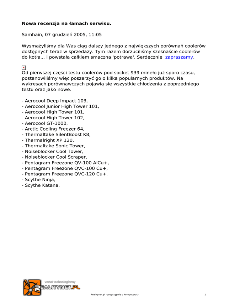 Nowa recenzja na łamach serwisu. Samhain, 07 grudzień 2005, 11:05 Wysmażyliśmy dla Was ciąg dalszy jednego z największych porównań coolerów dostępnych teraz w sprzedaży. Tym razem dorzuciliśmy szesnaście coolerów do kotła... i powstała całkiem smaczna 'potrawa'. Serdecznie zapraszamy. Od pierwszej części testu coolerów pod socket 939 mineło już sporo czasu, postanowiliśmy więc poszerzyć go o kilka popularnych produktów. Na wykresach porównawczych pojawią się wszystkie chłodzenia z poprzedniego testu oraz jako nowe: - Aerocool Deep Impact 103, Aerocool Junior High Tower 101, Aerocool High Tower 101, Aerocool High Tower 102, Aerocool GT-1000, Arctic Cooling Freezer 64, Thermaltake SilentBoost K8, Thermalright XP 120, Thermaltake Sonic Tower, Noiseblocker Cool Tower, Noiseblocker Cool Scraper, Pentagram Freezone QV-100 AlCu+, Pentagram Freezone QVC-100 Cu+, Pentagram Freezone QVC-120 Cu+. Scythe Ninja, Scythe Katana. Realitynet.pl - przystępnie o komputerach 1