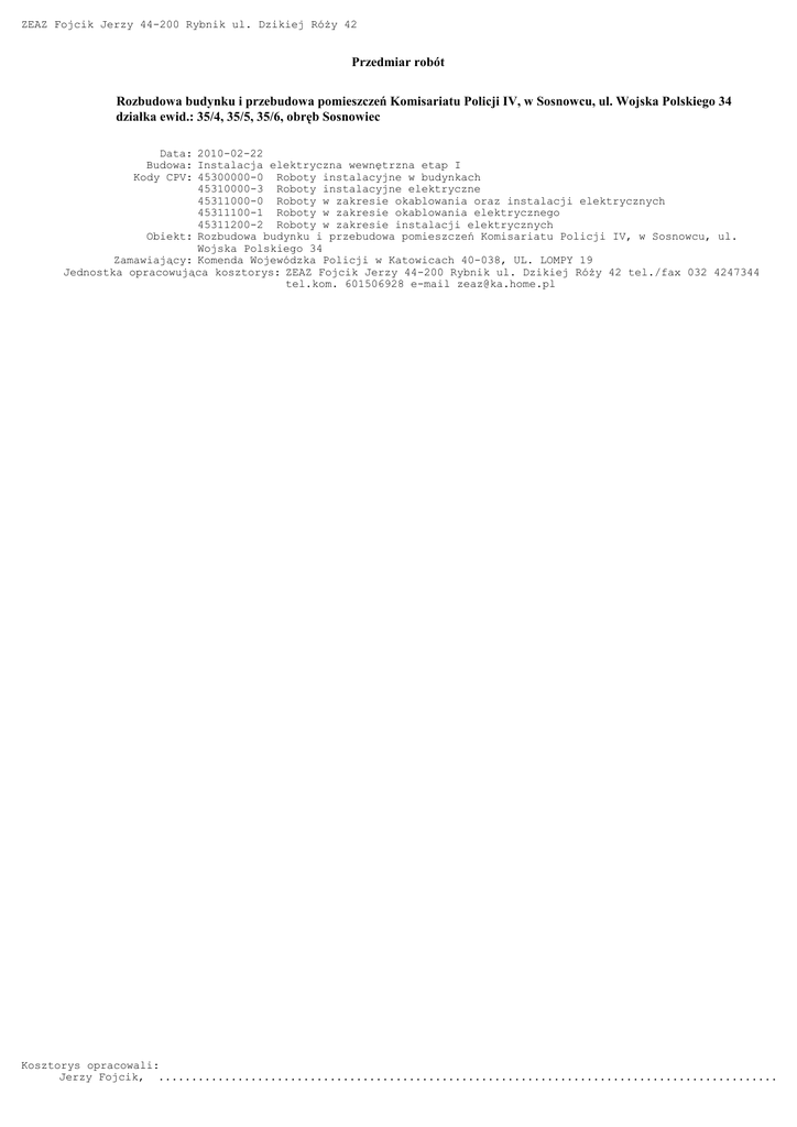 ZEAZ Fojcik Jerzy 44-200 Rybnik ul. Dzikiej RóŜy 42 Przedmiar robót Rozbudowa budynku i przebudowa pomieszczeń Komisariatu Policji IV, w Sosnowcu, ul. Wojska Polskiego 34 działka ewid.: 35/4, 35/5, 35/6, obręb Sosnowiec Data: 2010-02-22 Budowa: Instalacja elektryczna wewnętrzna etap I Kody CPV: 45300000-0 Roboty instalacyjne w budynkach 45310000-3 Roboty instalacyjne elektryczne 45311000-0 Roboty w zakresie okablowania oraz instalacji elektrycznych 45311100-1 Roboty w zakresie okablowania elektrycznego 45311200-2 Roboty w zakresie instalacji elektrycznych Obiekt: Rozbudowa budynku i przebudowa pomieszczeń Komisariatu Policji IV, w Sosnowcu, ul. Wojska Polskiego 34 Zamawiający: Komenda Wojewódzka Policji w Katowicach 40-038, UL. LOMPY 19 Jednostka opracowująca kosztorys: ZEAZ Fojcik Jerzy 44-200 Rybnik ul. Dzikiej RóŜy 42 tel./fax 032 4247344 tel.kom. 601506928 e-mail [email protected] Kosztorys opracowali: Jerzy Fojcik, ................................................................................................. IV Komisariat etap I Sosnowiec Zuzia (C) DataComp 1994-2009(lic. 4738) strona nr: 2 Przedmiar robót Podstawa nakładu, opis pozycji, wyliczenie ilości robót Ilość Krot. 1 Etap I P1 2 DemontaŜ instalacji 2.1 KNNR 9/402/1 Gniazda instalacyjne wtykowe,demontaŜ i montaŜ gniazd wtykowych DATA 2.2 KNNR 9/202/6 Zabezpieczeń głównych demontaŜ 2.3 KNNR 9/201/6 Tablice rozdzielcze i obudowy, demontaŜ tablicy 2.4 KNNR 9/301/3 Przewody układane pod tynkiem, demontaŜ przewodu wtynkowego, płaskiego lub kabelkowego okrągłego 2.5 KNNR 9/305/3 Przewody kabelkowe układane w korytkach i listwach instalacyjnych 2.6 KNNR 9/401/7 Łączniki instalacyjne, demontaŜ łącznika nieuszczelnionego podtynkowego lub natynkowego 2.7 KNNR 9/402/5 Gniazda instalacyjne wtykowe, demontaŜ gniazda nieuszczelnionego podtynkowego lub natynkowego 2.8 KNNR 9/501/7 Oprawy oświetleniowe zawieszane, przykręcane, demontaŜ oprawy świetlówkowej, belka montaŜowa 2.9 KNNR 9/501/5 Oprawy oświetleniowe zawieszane, przykręcane, demontaŜ oprawy Ŝarowej 2.10 KNNR 9/804/7 Kable wieloŜyłowe układane w budynkach i budowlach, demontaŜ kabla, masa do 1,0·kg/m 3 Rozdzielnie 3.1 KNNR 5/404/4 Rozdzielnia RG 3.2 KNNR 5/404/4 Rozdzielnia RGK 3.3 KNNR 5/404/3 RozdzielniaTB-1 3.4 KNNR 5/404/3 RozdzielniaTK-1 3.5 KNNR 3/304/1 Wykucie wnęk w ścianach z cegły z ich otynkowaniem, ściany na zaprawie wapiennej lub cementowo-wapiennej 3.6 KNNR 5/1305/1 Sprawdzenie samoczynnego wyłączania zasilania, działanie wyłącznika róŜnicowoprądowego, próba pierwsza 3.7 KNNR 5/1305/2 Sprawdzenie samoczynnego wyłączania zasilania, działanie wyłącznika róŜnicowoprądowego, próba kaŜda następna 4 MontaŜ opraw opraw oświetleniowych 4.1 Kalkulacja własna Oprawy CANES - ceiling/suspended 2x35W RAL 9006 4.2 Kalkulacja własna Oprawy CANES - ceiling/suspended 2x28W RAL 9006 4.3 Kalkulacja własna Oprawy CRATER - downlight 2x26W 4.4 Kalkulacja własna Oprawy CRATER - downlight 2x26W 4.5 Kalkulacja własna Kinkiet Sagita 124 4.6 Kalkulacja własna Oprawy LOGICA SIGN LG 24W SE 1-3P 4.7 Kalkulacja własna Oprawy LOGICA LG 24W SE 1-3P 4.8 Kalkulacja własna Oprawy iGUZZINI PLATEA HIT 150W nr kat. 7380 4.9 Kalkulacja własna Oprawy Sagita P 239 IP 44 4.10 Kalkulacja własna Oprawy Sagita P 254 IP 44 4.11 KNNR 5/1304/6 Badania i pomiary instalacji uziemiającej, piorunochronnej i skuteczności zerowania, skuteczność zerowania, pomiar kaŜdy następny 4.12 Kalkulacja własna Sprawdzenie i pomiar natęŜenia oswietlenia ogólnego i awaryjnego ewakuacyjnego 5 Gniazdka wtyczkowe 5.1 KNNR 5/302/1 Puszki instalacyjne podtynkowe, Fi·60, pojedyncze 5.2 KNNR 5/308/3 Gniazda instalacyjne wtyczkowe ze stykiem ochronnym, pt, 2-biegunowe 10A 2,5·mm2 przelotowe podwójne Jedn. 21 szt 1 szt 1 szt 220 m 60 m 10 szt 15 szt 10 szt 8 szt 10 m 1 szt 1 szt 1 szt 1 szt 0,6 m3 1 próba 17 próba 20 kpl 1 kpl 6 kpl 2 kpl 1 kpl 3 kpl 1 kpl 5 kpl 1 kpl 1 kpl 41 szt 34 próba 126 szt 17 szt Rozbudowa budynku i przebudowa pomieszczeń Komisariatu Policji IV, w Sosnowcu, ul. Wojska Polskiego 34 działka ewid.: 35/4, ... IV Komisariat etap I Sosnowiec Zuzia (C) DataComp 1994-2009(lic. 4738) strona nr: 3 Podstawa nakładu, opis pozycji, wyliczenie ilości robót Ilość Krot. 5.3 KNNR 5/308/2 Gniazda instalacyjne wtyczkowe ze stykiem ochronnym, pt, 2-biegunowe 10A 2,5·mm2 przelotowe pojedyncze 5.4 Kalkulacja indywidualna Zestaw gniazd wty. 3 Data + 2 pojedyncze 5.5 KNNR 5/1304/6 Badania i pomiary instalacji uziemiającej, piorunochronnej i skuteczności zerowania, skuteczność zerowania, pomiar kaŜdy następny 6 Łączniki oświetleniowe 6.1 KNNR 5/302/1 Puszki instalacyjne podtynkowe, Fi·60, pojedyncze 6.2 KNNR 5/306/2 (1) Łącznik uniwersalny 6.3 KNNR 5/306/2 (2) Łącznik światło 6.4 KNNR 5/306/3 Łącznik świecznikowy 7 MontaŜ korytek oraz rur osłonowych 7.1 KNR 508/705/7 Przykręcanie korytek do gotowych otworów, szerokości 100·mm 7.2 KNR 508/705/8 Przykręcanie korytek, do gotowych otworów, szerokości 200·mm 7.3 KNR 508/706/10 MontaŜ uchwytów stalowych 7.4 KNR 508/706/10 MontaŜ wysięgników 7.5 KNR 508/706/10 MontaŜ wysięgników 7.6 KNR 508/710/5 (1) MontaŜ elementów Kolanko 90° 7.7 KNR 508/710/5 (1) MontaŜ elementów Kolanko 90° 7.8 KNNR 5/103/6 (4) Rury winidurowe układane n.t., podłoŜe inne niŜ betonowe, Fi·28 7.9 KNNR 5/102/3 Rury - peszel PCV samogasnące typ RKS 28/23 7.10 KNNR 5/102/8 Rury winidurowe karbowane (giętkie) układane p.t. w gotowych bruzdach, podłoŜe inne niŜ betonowe, do Fi 36·mm 8 Instalacja elektryczna 8.1 KNNR 5/204/2 (5) Przewody wtynkowe i kabelkowe płaskie układane w tynku, wtynkowy YDYt, na podłoŜu innym niŜ betonowe, 3x1,5·mm2 8.2 KNNR 5/209/1 Przewody kabelkowe układane w gotowych korytkach i na drabinkach, bez mocowania, YDYp-450/750V 3x1,5mm2 8.3 KNNR 5/206/1 Przewody kabelkowe układane n.t., na betonie,YDYp-450/750V 3x1,5mm2 8.4 KNNR 5/204/2 (5)