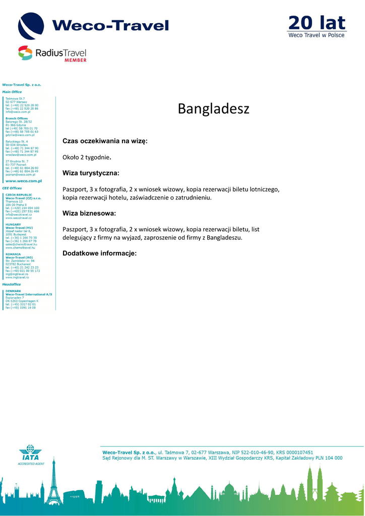 Bangladesz Czas oczekiwania na wizę: Około 2 tygodnie. Wiza turystyczna: Paszport, 3 x fotografia, 2 x wniosek wizowy, kopia rezerwacji biletu lotniczego, kopia rezerwacji hotelu, zaświadczenie o zatrudnieniu. Wiza biznesowa: Paszport, 3 x fotografia, 2 x wniosek wizowy, kopia rezerwacji biletu, list delegujący z firmy na wyjazd, zaproszenie od firmy z Bangladeszu. Dodatkowe informacje: