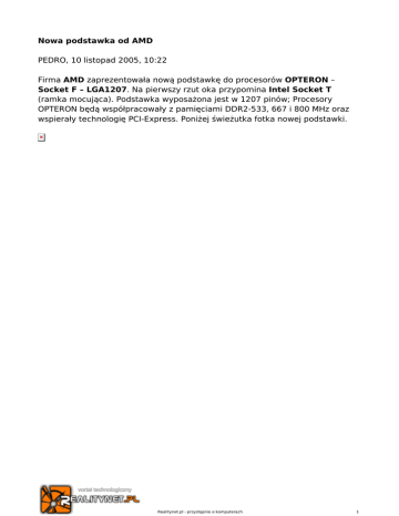 Nowa podstawka od AMD PEDRO, 10 listopad 2005, 10:22 Firma AMD zaprezentowała nową podstawkę do procesorów OPTERON – Socket F – LGA1207. Na pierwszy rzut oka przypomina Intel Socket T (ramka mocująca). Podstawka wyposażona jest w 1207 pinów; Procesory OPTERON będą współpracowały z pamięciami DDR2-533, 667 i 800 MHz oraz wspierały technologię PCI-Express. Poniżej świeżutka fotka nowej podstawki. Realitynet.pl - przystępnie o komputerach 1