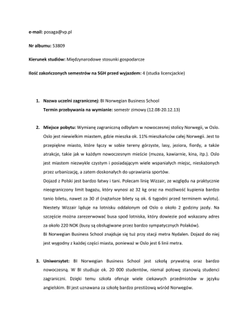e-‐mail: [email protected] Nr albumu: 53809 Kierunek studiów: Międzynarodowe stosunki gospodarcze Ilość zakończonych semestrów na SGH przed wyjazdem: 4 (studia licencjackie) 1. Nazwa uczelni zagranicznej: BI Norwegian Business School Termin przebywania na wymianie: semestr zimowy (12.08-‐20.12.13) 2. Miejsce pobytu: Wymianę zagraniczną odbyłam w nowoczesnej stolicy Norwegii, w Oslo. Oslo jest niewielkim miastem, gdzie mieszka ok. 11% mieszkańców całej Norwegii. Jest to przepiękne miasto, które łączy w sobie tereny górzyste, lasy, jeziora, fiordy, a także atrakcje, takie jak w każdym nowoczesnym mieście (muzea, kawiarnie, kina, itp.). Oslo jest miastem niezwykle czystym i posiadającym wiele wspaniałych miejsc, nieskażonych przez urbanizację, a zatem doskonałych do uprawiania sportów. Dojazd z Polski jest bardzo łatwy i tani. Polecam linię Wizzair, ze względu na praktycznie nieograniczony limit bagażu, który wynosi aż 32 kg oraz na możliwość kupienia bardzo tanio biletu, nawet za 30 zł (najtańsze bilety są ok. 6 tygodni przed terminem wylotu). Niestety Wizzair ląduje na lotnisku oddalonym od Oslo o około 2 godziny jazdy. Na szczęście można zarezerwować busa spod lotniska, który dowiezie pod wskazany adres za około 220 NOK (busy są obsługiwane przez bardzo sympatycznych Polaków). BI Norwegian Business School znajduje się tuż przy stacji metra Nydalen. Dojazd do niej jest wygodny z każdej części miasta, ponieważ w Oslo jest 6 linii metra. 3. Uniwersytet: BI Norwegian Business School jest szkołą prywatną oraz bardzo nowoczesną. W BI studiuje ok. 20 000 studentów, niemal połowę stanowią studenci zagraniczni. Dzięki temu szkoła oferuje wiele ciekawych przedmiotów w języku angielskim. BI jest uznawana za szkołę bardzo prestiżową wśród Norwegów. 4. Kursy: Wszystkie przedmioty, które wybrałam były prowadzone w języku angielskim. Nie miałam żadnych problemów językowych. Przypadkiem złożyło się, że nie miałam żadnego pisemnego egzaminu (dwa przedmioty kończyły się egzaminem ustnym, a pozostałe dwa dostarczeniem term paper lub projektu semestralnego), dzięki temu nie musiałam dojeżdżać na pisemne egzaminy, które odbywają się w specjalnie przygotowanych salach, rozmieszczonych w różnych częściach Oslo. Business and Professional Ethics: Kurs prowadził sympatyczny, jednakże dość flegmatyczny Norweg, Johannes Brinkmann. Kurs nie należał do najbardziej wymagających. Profesor starał się go uczynić ciekawym poprzez organizację dialogu sokratejskiego, czy też puszczanie kawałków filmów związanych z etyką, które miały zachęcić studentów do dyskusji na wybrany temat. Na zaliczenie kursu składała się obecność na zajęciach, przygotowanie prezentacji oraz term paper, który powinien być napisany w trzyosobowych grupach w ciągu całego semestru. Business Communication in English -‐ Oral Effective Presentations and Negotiations: Kurs prowadził bardzo sympatyczny Amerykanin, Charles Cooper. Na zajęciach ćwiczyliśmy scenariusze negocjacyjne oraz mieliśmy czas na przygotowanie prezentacji na temat związany z szeroko pojętym biznesem. W czasie zajęć profesor nas filmował, aby później pokazać nam m.in. jakie błędy popełniamy przy prezentacjach. Egzamin był ustny i składał się z dwóch części: z prezentacji na wcześniej przygotowany temat oraz rozmowy o technikach negocjacyjnych. Cały kurs oceniam jako bardzo ciekawy i wzbogacający. Innovation and Entrepreneurship: To był zdecydowanie najbardziej wymagający kurs. Na samym początku w ramach zajęć odbył się niemal całodzienny warsztat (Innovation Camp), na który był zaproszony przedstawiciel z firmy Miscrosoft. Warsztat miał pomóc studentom w rozpoczęciu innowacyjnego projektu, który miał być zaliczeniem kursu. Jednak projekt nie należał do najprostszych, ponieważ oprócz biznes planu, który powinien się w nim znaleźć, studenci byli zobowiązania do przeprowadzenia jego analizy. Dodatkowo kurs skończył się w połowie semestru i studenci byli pozostawieni z wieloma problemami dot. projektu całkowicie sami. Persuasion and Dialogue for Leaders: Na zajęciach panowała niezwykle sympatyczna atmosfera, podobnie jak w czasie ustnego egzaminu, na którym pani profesor przyprowadziła czworonożnego przyjaciela. Na zajęciach odbywały się bardzo wartościowe warsztaty z aktorami, mające przygotować nas do wygłoszenia profesjonalnego przemówienia, na kontrowersyjny temat. Zaliczenie kursu składało się z obecności na zajęciach, przygotowania przemówienia i wygłoszenia go w czasie egzaminu ustnego, z krytyki przemówienia innego studenta oraz napisania raportu po zakończeniu kursu. Cały kurs oceniam jako niezwykle ciekawy i wzbogacający. 5. Warunki studiowania: Studiowanie w BI Norwegian Business School było samą przyjemnością. Pomijając niesamowitą architekturę szkoły, dostęp do komputerów, Wi-‐ Fi, drukarek i skanerów na całej uczelni oraz możliwość wynajęcia pokoju do pracy grupowej, należy podkreślić, że poziom prowadzonych kursów był na wysokim poziomie, a norweska organizacja pracy okazała się perfekcyjna. Tak jak wspomniałam na całej uczelni był bezproblemowy dostęp do komputerów i drukarek (na początku trzeba było tylko wpłacić 100 NOK na legitymację, aby móc drukować, czy kopiować – skanowanie było za darmo). Biblioteka niestety nie była wystarczająco wyposażona, co oznacza, że było w niej wiele ciekawych pozycji, jednak w niewystarczających egzemplarzach dla wszystkich studentów. Był tylko jeden egzemplarz danej pozycji możliwy do wypożyczenia na dwa tygodnie, z możliwością przedłużenia oraz drugi z możliwością wypożyczenia na jeden dzień. Ja przyjechałam nieco wcześniej, także nie miałam problemu, aby wypożyczyć potrzebny podręcznik, zeskanować go i wydrukować niezbędne rozdziały. Polecam to rozw