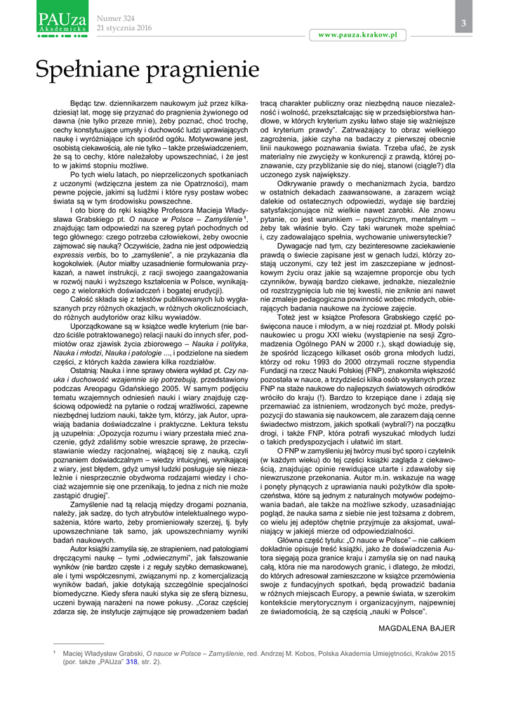 Numer 324 21 stycznia 2016 3 www.pauza.krakow.pl Spełniane pragnienie Będąc tzw. dziennikarzem naukowym już przez kilkadziesiąt lat, mogę się przyznać do pragnienia żywionego od dawna (nie tylko przeze mnie), żeby poznać, choć trochę, cechy konstytuujące umysły i duchowość ludzi uprawiających naukę i wyróżniające ich spośród ogółu. Motywowane jest, osobistą ciekawością, ale nie tylko – także przeświadczeniem, że są to cechy, które należałoby upowszechniać, i że jest to w jakimś stopniu możliwe. Po tych wielu latach, po nieprzeliczonych spotkaniach z uczonymi (wdzięczna jestem za nie Opatrzności), mam pewne pojęcie, jakimi są ludźmi i które rysy postaw wobec świata są w tym środowisku powszechne. I oto biorę do ręki książkę Profesora Macieja Władysława Grabskiego pt. O nauce w Polsce – Zamyślenie 1, znajdując tam odpowiedzi na szereg pytań pochodnych od tego głównego: czego potrzeba człowiekowi, żeby owocnie zajmować się nauką? Oczywiście, żadna nie jest odpowiedzią expressis verbis, bo to „zamyślenie”, a nie przykazania dla kogokolwiek. (Autor miałby uzasadnienie formułowania przykazań, a nawet instrukcji, z racji swojego zaangażowania w rozwój nauki i wyższego kształcenia w Polsce, wynikającego z wielorakich doświadczeń i bogatej erudycji). Całość składa się z tekstów publikowanych lub wygłaszanych przy różnych okazjach, w różnych okolicznościach, do różnych audytoriów oraz kilku wywiadów. Uporządkowane są w książce wedle kryterium (nie bardzo ściśle potraktowanego) relacji nauki do innych sfer, podmiotów oraz zjawisk życia zbiorowego – Nauka i polityka, Nauka i młodzi, Nauka i patologie ..., i podzielone na siedem części, z których każda zawiera kilka rozdziałów. Ostatnią: Nauka i inne sprawy otwiera wykład pt. Czy nauka i duchowość wzajemnie się potrzebują, przedstawiony podczas Areopagu Gdańskiego 2005. W samym podjęciu tematu wzajemnych odniesień nauki i wiary znajduję częściową odpowiedź na pytanie o rodzaj wrażliwości, zapewne niezbędnej ludziom nauki, także tym, którzy, jak Autor, uprawiają badania doświadczalne i praktyczne. Lektura tekstu ją uzupełnia: „Opozycja rozumu i wiary przestała mieć znaczenie, gdyż zdaliśmy sobie wreszcie sprawę, że przeciwstawianie wiedzy racjonalnej, wiążącej się z nauką, czyli poznaniem doświadczalnym – wiedzy intuicyjnej, wynikającej z wiary, jest błędem, gdyż umysł ludzki posługuje się niezależnie i niesprzecznie obydwoma rodzajami wiedzy i chociaż wzajemnie się one przenikają, to jedna z nich nie może zastąpić drugiej”. Zamyślenie nad tą relacją między drogami poznania, należy, jak sadzę, do tych atrybutów intelektualnego wyposażenia, które warto, żeby promieniowały szerzej, tj. były upowszechniane tak samo, jak upowszechniamy wyniki badań naukowych. Autor książki zamyśla się, ze strapieniem, nad patologiami dręczącymi naukę – tymi „odwiecznymi”, jak fałszowanie wyników (nie bardzo częste i z reguły szybko demaskowane), ale i tymi współczesnymi, związanymi np. z komercjalizacją wyników badań, jakie dotykają szczególnie specjalności biomedyczne. Kiedy sfera nauki styka się ze sferą biznesu, uczeni bywają narażeni na nowe pokusy. „Coraz częściej zdarza się, że instytucje zajmujące się prowadzeniem badań tracą charakter publiczny oraz niezbędną nauce niezależność i wolność, przekształcając się w przedsiębiorstwa handlowe, w których kryterium zysku łatwo staje się ważniejsze od kryterium prawdy”. Zatrważający to obraz wielkiego zagrożenia, jakie czyha na badaczy z pierwszej obecnie linii naukowego poznawania świata. Trzeba ufać, że zysk materialny nie zwycięży w konkurencji z prawdą, której poznawanie, czy przybliżanie się do niej, stanowi (ciągle?) dla uczonego zysk największy. Odkrywanie prawdy o mechanizmach życia, bardzo w ostatnich dekadach zaawansowane, a zarazem wciąż dalekie od ostatecznych odpowiedzi, wydaje się bardziej satysfakcjonujące niż wielkie nawet zarobki. Ale znowu pytanie, co jest warunkiem – psychicznym, mentalnym – żeby tak właśnie było. Czy taki warunek może spełniać i, czy zadowalająco spełnia, wychowanie uniwersyteckie? Dywagacje nad tym, czy bezinteresowne zaciekawienie prawdą o świecie zapisane jest w genach ludzi, którzy zostają uczonymi, czy też jest im zaszczepiane w jednostkowym życiu oraz jakie są wzajemne proporcje obu tych czynników, bywają bardzo ciekawe, jednakże, niezależnie od rozstrzygnięcia lub nie tej kwestii, nie zniknie ani nawet nie zmaleje pedagogiczna powinność wobec młodych, obierających badania naukowe na życiowe zajęcie. Toteż jest w książce Profesora Grabskiego część poświęcona nauce i młodym, a w niej rozdział pt. Młody polski naukowiec u progu XXI wieku (wystąpienie na sesji Zgromadzenia Ogólnego PAN w 2000 r.), skąd dowiaduję się, że spośród liczącego kilkaset osób grona młodych ludzi, którzy od roku 1993 do 2000 otrzymali roczne stypendia Fundacji na rzecz Nauki Polskiej (FNP), znakomita większość pozostała w nauce, a trzydzieści kilka osób wysłanych przez FNP na staże naukowe do najlepszych światowych ośrodków wróciło do kraju (!). Bardzo to krzepiące dane i zdają się przemawiać za istnieniem, wrodzonych być może, predyspozycji do stawania się naukowcem, ale zarazem dają cenne świadectwo mistrzom, jakich spotkali (wybrali?) na początku drogi, i także FNP, która potrafi wyszukać młodych ludzi o takich predyspozycjach i ułatwić im start. O FNP w zamyśleniu jej twórcy musi być sporo i czytelnik (w każdym wieku) do tej części książki zagląda z ciekawością, znajdując opinie rewidujące utarte i zdawałoby się niewzruszone przekonania. Autor m.in. wskazuje na wagę i ponęty płynących z uprawiania nauki pożytków dla społeczeństwa, które są