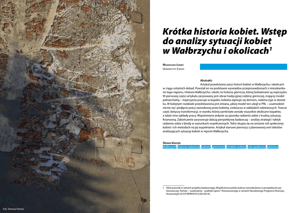 Krótka historia kobiet. Wstęp do analizy sytuacji kobiet w Wałbrzychu i okolicach1 Magdalena Łokieć Uniwersytet Łódzki Abstrakt: Artykuł przedstawia zarys historii kobiet w Wałbrzychu i okolicach w ciągu ostatnich dekad. Powstał on na podstawie wywiadów przeprowadzonych z mieszkankami tego regionu. Historia Wałbrzycha i okolic to historia górnicza, której bohaterami są mężczyźni. W pierwszej części artykułu zarysowany jest obraz tradycyjnej rodziny górniczej, mającej model patriarchalny – mężczyzna pracuje w kopalni, kobieta zajmuje się domem, rodzina żyje w dostatku. W kolejnym rozdziale przedstawiona jest zmiana, jakiej model ten uległ w PRL – usamodzielnienie się i podjęcie pracy zawodowej przez kobiety, zwłaszcza w zakładach odzieżowych. Trzecia część dotyczy transformacji, w wyniku której zamknięte zostały wszystkie okoliczne kopalnie, a także inne zakłady pracy. Wspomniane jedynie są sposoby radzenia sobie z trudną sytuacją finansową. Zakończenie zarysowuje dalszą perspektywę badawczą – analizę strategii i taktyk radzenia sobie z biedą w warunkach współczesnych. Tekst skupia się na zmianie roli społecznej kobiet i ich metodach na jej wypełnianie. Artykuł stanowi pierwszy z planowanej serii tekstów analizujących sytuację kobiet w rejonie Wałbrzycha. Słowa-klucze: Wałbrzych, historia mówiona, kobiety, górnictwo, modele rodziny, rola społeczna, ubóstwo. 1 Tekst powstał w ramach projektu badawczego „Współczesna polska kultura wernakularna w perspektywie porównawczej. Pamięć – wyobraźnia – praktyki oporu“ finansowanego w ramach Narodowego Programu Rozwoju Humanistyki (0107/NPRH3/H12/82/2014). Fot. Tomasz Ferenc Krótka historia kobiet. Wstęp do analizy sytuacji kobiet w Wałbrzychu i okolicach Wprowadzenie Historia Dolnego Śląska, zwłaszcza regionu wałbrzyskiego, to z punktu widzenia samych mieszkańców przede wszystkim historia górnictwa. Już w średniowieczu rozpoczęto tu poszukiwania rud metali szlachetnych, przez wieki zmieniano wielokrotnie profil wydobycia i eksploatowano złoża różnych surowców, aż do barytu i węgla w XX wieku, które stanowiły ostatni – na ten moment – rozdział historii górnictwa w tym rejonie. Od funkcjonowania kopalń zależało całe życie okolicznych mieszkańców w większości jego aspektów (Mucha, 2002; Krzyżanowski, Wójcik, 2008). Historia górnictwa natomiast, jak nietrudno się domyślić, jest zwykle opowiadana jako historia mężczyzn. To oni, schodząc pod ziemię i wydobywając „czarne złoto” są głównymi bohaterami opowieści, o nich i ich pracy lokalne instytucje i zwykli udzie starają się zachować pamięć. Giną w tej pamięci kobiety i ich niewypowiedziane historie. To istotny brak w badaniach nad historią społeczną tego regionu, który chciałabym zacząć uzupełniać przy użyciu historii mówionej i etnografii (wielu badaczy w nich właśnie widzi narzędzia dające szansę na odnalezienie i przywrócenie zapomnianych, nieopowiedzianych opowieści) (Hirsh, Smith, 2002). W niniejszym artykule chcę przedstawić zarys historii kobiet w tym regionie w ciągu ostatnich dekad – zwłaszcza historii zmiany ich roli społecznej. Stanowi on pierwszą, wstępną próbę zmierzenia się z tematem sytuacji kobiet w okolicach Wałbrzycha, który zamierzam w najbliższym czasie kontynuować. Jak sądzę, warto ten temat otworzyć właśnie krótkim rysem historycznym. Materiałem źródłowym, z którego korzystam nie będzie literatura historyczna, gdyż próżno w niej szukać kobiet i ich doświadczeń, trudno spotkać w nich rozwinięcie wątków domowych, rodzinnych (a zatem tych, z którymi tradycyjnie związane były kobiety) czy bardziej ogólnie, zawodowych. Historia pisana tych terenów to historia górnicza w wąskim tego słowa znaczeniu. Za podstawę szkicu posłużą mi opowieści kobiet zebrane podczas badań terenowych przeprowadzonych w Wałbrzychu i jednej z pobliskich miejscowości w lipcu 2016 r. Takie podejście do tematu pozwoli przyjrzeć się wyobrażeniom kobiet na temat ich historii i historii okolicy, w której mieszkają, ustalić, co dla nich było najważniejsze i jakie obrazy kobiety (ale też rodziny, i szerzej, społeczności) łączą z różnymi okresami historycznymi. Będzie to również dobre tło do analizy ich aktualnej sytuacji, zwłaszcza w kontekście rynku pracy, którą zamierzam w przyszłości podjąć. Opieram się przede wszystkim na wypowiedziach czterech kobiet – dwóch wywiadach biograficznych i dwóch narracjach zbudowanych w ramach wywiadów dotyczących instytucji, z którymi związane były rozmówczynie. Mam nadzieję, że w ramach dalszych prac nad tematem uda mi się poszerzyć to grono, należy jednak podkreślić, że dotarcie do kobiet i namówienie ich do rozmów nie było łatwe – jeśli nie precyzowaliśmy, niemal zawsze proponowano nam kontakty z mężczyznami jako kompetentnymi rozmówcami. To tylko dowód na to, jak istotna i interesująca może być próba uchwycenia kobiecej perspektywy, zwłaszcza w tak intuicyjnie niekobiecej tematyce. Przyjęcie właśnie herstories jako perspektywy badawczej pozwala na wydobycie zupełnie nowych, nie opisywanych dotąd wątków właśnie przez oddanie głosu pozornie nie mającym tu wiele do opowiedzenia kobietom. Historia kobiet jest związana z przemysłem wydobywczym, jego zmianami i likwidacją co najmniej równie silnie jak historia mężczyzn, choć, jak się wydaje, w sposób mniej oczywisty: to nie tylko kwestia posiadania lub nie 15 posiadania zatrudnienia. Zmiany sytuacji na rynku pracy, od zupełnego braku potrzeby uczestniczenia w nim kobiet, poprzez peerelowskie dążenie do stuprocentowego zatrudnienia, aż do rażąco wysokiej stopy bezrobocia na przełomie wieków i współczesnych prób radzenia sobie z tym problemem wpływały nie tylko na sam fakt pracy zawodowej kobiet, ale też, co ważniejsze, 