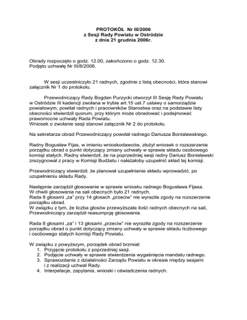 PROTOKÓŁ Nr III/2006 z Sesji Rady Powiatu w Ostródzie z dnia 21 grudnia 2006r. Obrady rozpoczęto o godz. 12.00, zakończono o godz. 12.30. Podjęto uchwałę Nr III/8/2006. W sesji uczestniczyło 21 radnych, zgodnie z listą obecności, która stanowi załącznik Nr 1 do protokołu. Przewodniczący Rady Bogdan Purzycki otworzył III Sesję Rady Powiatu w Ostródzie III kadencji zwołana w trybie art.15 ust.7 ustawy o samorządzie powiatowym, powitał radnych i pracowników Starostwa oraz na podstawie listy obecności stwierdził quorum, przy którym moŜe obradować i podejmować prawomocne uchwały Rada Powiatu. Wniosek o zwołanie sesji stanowi załącznik Nr 2 do protokołu. Na sekretarza obrad Przewodniczący powołał radnego Dariusza Bonisławskiego. Radny Bogusław Fijas, w imieniu wnioskodawców, złoŜył wniosek o rozszerzenie porządku obrad o punkt dotyczący zmiany uchwały w sprawie składu osobowego komisji stałych. Radny stwierdził, Ŝe na poprzedniej sesji radny Dariusz Bonisławski zrezygnował z pracy w Komisji BudŜetu i naleŜałoby uzupełnić skład tej komisji. Przewodniczący stwierdził, Ŝe planował uzupełnienie składu wprowadzić, po uzupełnieniu składu Rady. Następnie zarządził głosowanie w sprawie wniosku radnego Bogusława Fijasa. W chwili głosowania na sali obecnych było 21 radnych. Rada 8 głosami „za” przy 14 głosach „przeciw” nie wyraziła zgody na rozszerzenie porządku obrad. W związku z tym, Ŝe liczba głosów przewyŜszała ilość radnych obecnych na sali, Przewodniczący zarządził reasumpcję głosowania. Rada 8 głosami „za” i 13 głosami „przeciw” nie wyraziła zgody na rozszerzenie porządku obrad o punkt dotyczący zmiany uchwały w sprawie składu liczbowego i osobowego stałych komisji Rady Powiatu. W związku z powyŜszym, porządek obrad brzmiał: 1. Przyjęcie protokołu z poprzedniej sesji. 2. Podjęcie uchwały w sprawie stwierdzenia wygaśnięcia mandatu radnego. 3. Sprawozdanie z działalności Zarządu Powiatu w okresie między sesjami i z realizacji uchwał Rady. 4. Interpelacje, zapytania, wnioski i oświadczenia radnych. 2 Pierwszym punktem porządku obrad było przyjęcie protokołu z poprzedniej sesji. Radny Jerzy Grubba zgłosił wniosek formalny, aby ten punkt zrealizować na następnej sesji, poniewaŜ okres od poprzedniej sesji był krótki i radni nie zdąŜyli zapoznać się z protokółem. Radny Jerzy Adamowicz zgłosił wniosek formalny o odczytanie przez przewodniczącego protokołu przed głosowaniem. Przewodniczący zarządził głosowanie nad wnioskiem radnego Jerzego Grubby, tj. przesunięcie tego punktu na następną sesję. W chwili głosowania na sali obecnych było 21 radnych. Rada, 5 głosami „za”, 13 głosami „przeciw” i 3 głosami „wstrzymującymi się”, nie wyraziła zgody na przeniesienie realizacji tego punktu na następną sesję. Przewodniczący zarządził głosowanie nad wnioskiem radnego Jerzego Adamowicza, tj. odczytanie protokołu. W chwili głosowania na sali obecnych było 21 radnych. Rada głosowała następująco: 4 głosy „za”, 15 głosów „przeciw” i 3 głosy „wstrzymujące się”. W związku z tym, Ŝe liczba głosów nie zgadzała się z ilością radnych obecnych na sali, Przewodniczący zarządził reasumpcję głosowania w tej sprawie. Rada, 4 głosami „za”, 14 głosami „przeciw” i 3 głosami „wstrzymującymi się”, nie wyraziła zgody na odczytywanie protokołu. Wobec powyŜszego Przewodniczący zarządził głosowanie w sprawie przyjęcia protokołu z poprzedniej sesji. W chwili głosowania na sali obecnych było 21 radnych. Rada, 17 głosami „za”, 1 głosem „przeciw” i 3 głosami „wstrzymującymi się” przyjęła protokół z II Sesji Rady Powiatu. Podjęcie uchwały w sprawie stwierdzenia wygaśnięcia mandatu radnego było drugim punktem porządku obrad. Pismo w sprawie zrzeczenia się mandatu radnego Jarosława śyty stanowi załącznik Nr 3 do protokołu. Przewodniczący odczytał treść projektu uchwały. Uwag do projektu nie zgłoszono. W chwili głosowania na sali obecnych było 21 radnych. Uchwała Nr III/17/2006 w sprawie stwierdzenia wygaśnięcia mandatu radnego, została podjęta jednogłośnie i stanowi załącznik Nr 4 do protokołu. Kolejnym punktem porządku obrad było sprawozdanie z działalności Zarządu Powiatu w okresie między sesjami i z realizacji uchwał Rady. Sprawozdanie stanowi załącznik Nr 5 do protokołu. Pytań do sprawozdania nie zgłoszono. 3 Ostatnim punktem porządku obrad były interpelacje, zapytania, wnioski i oświadczenia radnych. Radny Bogusław Fijas stwierdził, Ŝe na tej sali mówi się o współpracy, a nie ma zgody na rozszerzenie porządku obrad o punkt dotyczący uzupełnienia składu Komisji BudŜetu. Przypomniał, Ŝe na poprzedniej sesji radna Ewa Michałowska zrezygnowała z pracy w tej komisji, poniewaŜ komisja nie moŜe liczyć więcej niŜ 11 osób. Po rezygnacji radnego Dariusza Bonisławskiego z pracy w tej komisji, zwolniło się jedno miejsce, które mogłaby zająć radna Ewa Michałowska, ale nie ma zgody na uzupełnienie składu komisji. Radny Jerzy Adamowicz zaproponował dokonanie zmiany uchwały na następnej sesji, czyli 29 grudnia, poniewaŜ w dniu dzisiejszym nie ma dwóch radnych. Radny Bogusław Fijas powiedział, Ŝe radni otrzymali w dniu dzisiejszym porządek obrad sesji , która odbędzie się 29 grudnia br. i nie ma tam punktu dotyczącego zmiany uchwały określającej składy osobowe komisji. Radny Jerzy Kruszewski stwierdził, Ŝe na pierwszej sesji brakowało dwóch radnych i nie przeszkadzało to nikomu w wyborze Starosty i całego Zarządu Powiatu. Zdaniem radnego, nie ma zgody na rozszerzenie porządku obrad, poniewaŜ jest to wniosek radnych z opozycji. Radny Cezary Pec proponował załagodzenie sytuacji i dojście do porozumienia poprzez rozszerzenie w dniu dzisiejszym porządku obrad i przyjęcie radnej Ewy Micha