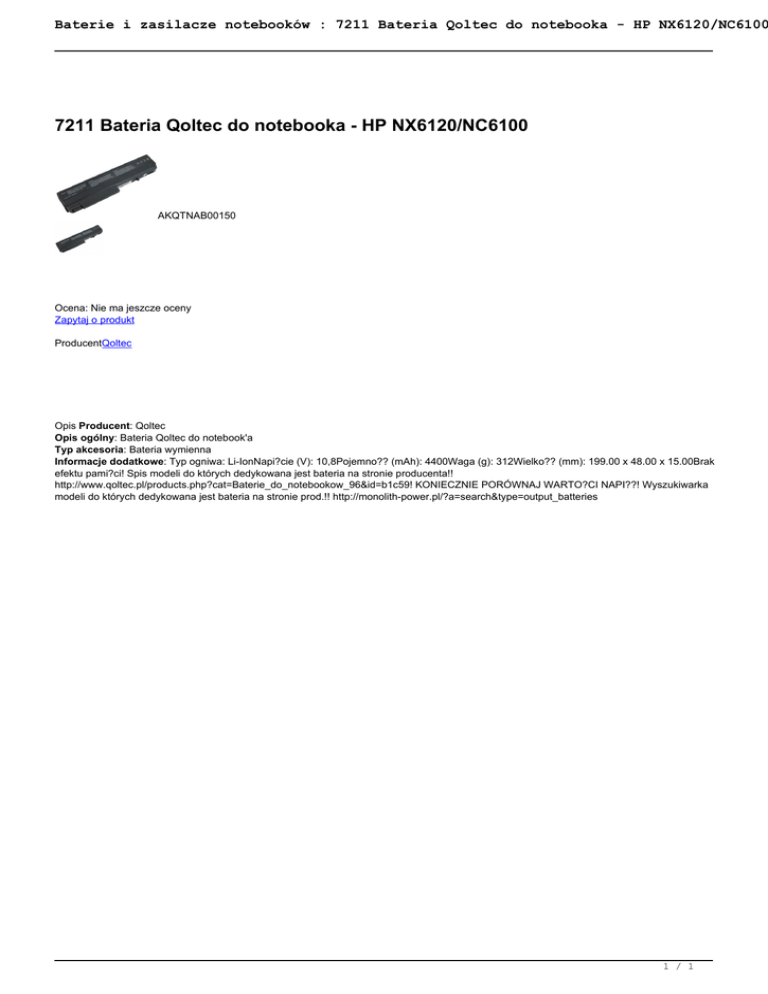 Baterie i zasilacze notebooków : 7211 Bateria Qoltec do notebooka - HP NX6120/NC6100 7211 Bateria Qoltec do notebooka - HP NX6120/NC6100 AKQTNAB00150 Ocena: Nie ma jeszcze oceny Zapytaj o produkt ProducentQoltec Opis Producent: Qoltec Opis ogólny: Bateria Qoltec do notebook'a Typ akcesoria: Bateria wymienna Informacje dodatkowe: Typ ogniwa: Li-IonNapi?cie (V): 10,8Pojemno?? (mAh): 4400Waga (g): 312Wielko?? (mm): 199.00 x 48.00 x 15.00Brak efektu pami?ci! Spis modeli do których dedykowana jest bateria na stronie producenta!! http://www.qoltec.pl/products.php?cat=Baterie_do_notebookow_96&id=b1c59! KONIECZNIE PORÓWNAJ WARTO?CI NAPI??! Wyszukiwarka modeli do których dedykowana jest bateria na stronie prod.!! http://monolith-power.pl/?a=search&type=output_batteries 1 / 1 Powered by TCPDF (www.tcpdf.org)