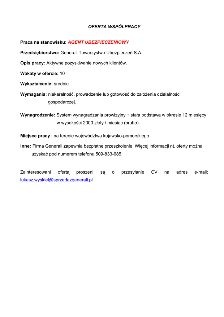 OFERTA WSPÓŁPRACY Praca na stanowisku: AGENT UBEZPIECZENIOWY Przedsiębiorstwo: Generali Towarzystwo Ubezpieczeń S.A. Opis pracy: Aktywne pozyskiwanie nowych klientów. Wakaty w ofercie: 10 Wykształcenie: średnie Wymagania: niekaralność, prowadzenie lub gotowość do założenia działalności gospodarczej. Wynagrodzenie: System wynagradzania prowizyjny + stała podstawa w okresie 12 miesięcy w wysokości 2000 złoty / miesiąc (brutto). Miejsce pracy : na terenie województwa kujawsko-pomorskiego Inne: Firma Generali zapewnia bezpłatne przeszkolenie. Więcej informacji nt. oferty można uzyskać pod numerem telefonu 509-833-685. Zainteresowani ofertą proszeni [email protected] są o przesyłanie CV na adres e-mail: