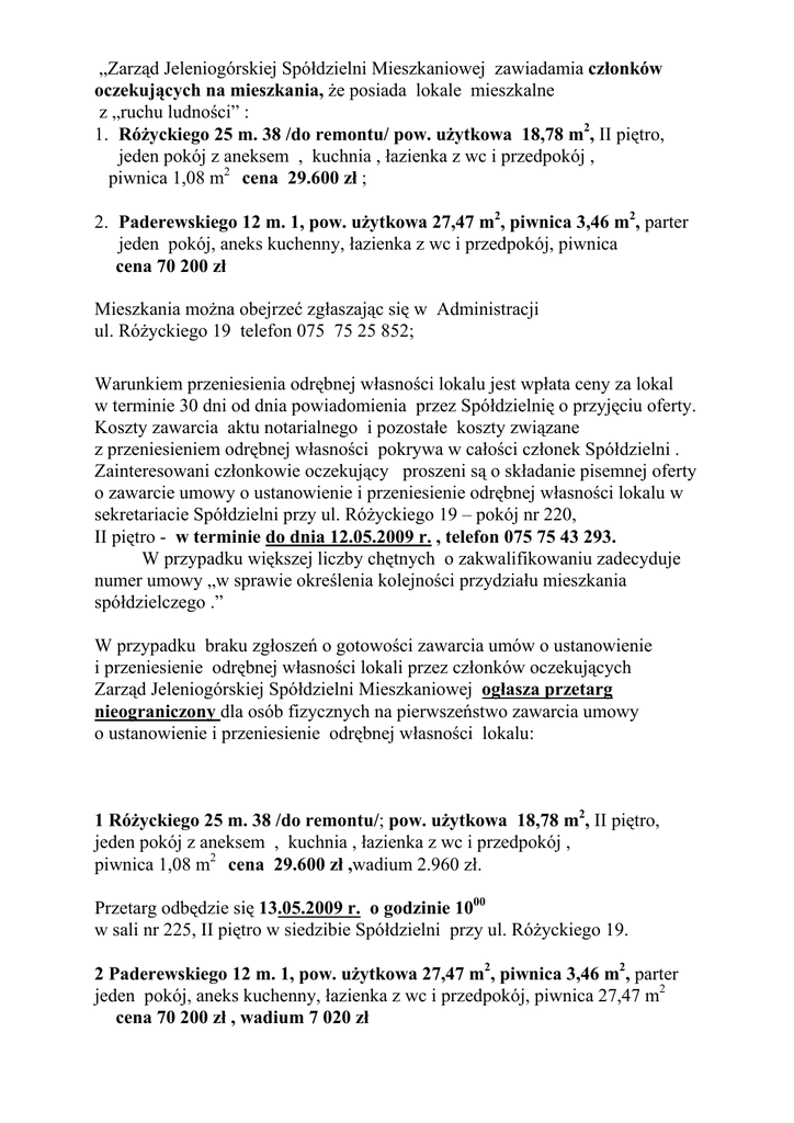 „Zarząd Jeleniogórskiej Spółdzielni Mieszkaniowej zawiadamia członków oczekujących na mieszkania, że posiada lokale mieszkalne z „ruchu ludności” : 1. Różyckiego 25 m. 38 /do remontu/ pow. użytkowa 18,78 m2, II piętro, jeden pokój z aneksem , kuchnia , łazienka z wc i przedpokój , piwnica 1,08 m2 cena 29.600 zł ; 2. Paderewskiego 12 m. 1, pow. użytkowa 27,47 m2, piwnica 3,46 m2, parter jeden pokój, aneks kuchenny, łazienka z wc i przedpokój, piwnica cena 70 200 zł Mieszkania można obejrzeć zgłaszając się w Administracji ul. Różyckiego 19 telefon 075 75 25 852; Warunkiem przeniesienia odrębnej własności lokalu jest wpłata ceny za lokal w terminie 30 dni od dnia powiadomienia przez Spółdzielnię o przyjęciu oferty. Koszty zawarcia aktu notarialnego i pozostałe koszty związane z przeniesieniem odrębnej własności pokrywa w całości członek Spółdzielni . Zainteresowani członkowie oczekujący proszeni są o składanie pisemnej oferty o zawarcie umowy o ustanowienie i przeniesienie odrębnej własności lokalu w sekretariacie Spółdzielni przy ul. Różyckiego 19 – pokój nr 220, II piętro - w terminie do dnia 12.05.2009 r. , telefon 075 75 43 293. W przypadku większej liczby chętnych o zakwalifikowaniu zadecyduje numer umowy „w sprawie określenia kolejności przydziału mieszkania spółdzielczego .” W przypadku braku zgłoszeń o gotowości zawarcia umów o ustanowienie i przeniesienie odrębnej własności lokali przez członków oczekujących Zarząd Jeleniogórskiej Spółdzielni Mieszkaniowej ogłasza przetarg nieograniczony dla osób fizycznych na pierwszeństwo zawarcia umowy o ustanowienie i przeniesienie odrębnej własności lokalu: 1 Różyckiego 25 m. 38 /do remontu/; pow. użytkowa 18,78 m2, II piętro, jeden pokój z aneksem , kuchnia , łazienka z wc i przedpokój , piwnica 1,08 m2 cena 29.600 zł ,wadium 2.960 zł. Przetarg odbędzie się 13.05.2009 r. o godzinie 1000 w sali nr 225, II piętro w siedzibie Spółdzielni przy ul. Różyckiego 19. 2 Paderewskiego 12 m. 1, pow. użytkowa 27,47 m2, piwnica 3,46 m2, parter jeden pokój, aneks kuchenny, łazienka z wc i przedpokój, piwnica 27,47 m2 cena 70 200 zł , wadium 7 020 zł Przetarg odbędzie się 13.05.2009 r. o godzinie 10 30 w sali nr 225, II piętro w siedzibie Spółdzielni przy ul. Różyckiego 19. Mieszkania można obejrzeć zgłaszając się w Administracji ul. Różyckiego 19 telefon 075 75 25 852; Różnicę pomiędzy ceną nabycia a wadium osoba wygrywająca przetarg jest obowiązana wpłacić przed zawarciem aktu notarialnego nie później niż w terminie 14 dni po przetargu. Warunkiem przystąpienia do przetargu jest wniesienie wadium . Wadium należy wpłacić najpóźniej w dniu przetargu, lecz nie później niż na 15minut przed wyznaczoną godziną przetargu, w kasie Spółdzielni przy ul. Różyckiego 19 czynnej od poniedziałku do piątku w godz. 800- 1430. Wadium przepada w wyniku jednostronnego zerwania umowy przez nabywcę. Koszty zawarcia aktu notarialnego i pozostałe koszty związane z przeniesieniem odrębnej własności pokrywa w całości Nabywca .” Zastrzega się prawo unieważnienia przetargu bez podania przyczyny. Zapraszamy do wzięcia udziału w przetargu”.