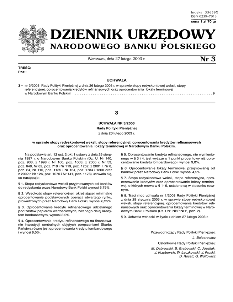 Indeks 35659X ISSN 0239–7013 cena 1 z³ 70 gr DZIENNIK URZĘDOWY NARODOWEGO BANKU POLSKIEGO Warszawa, dnia 27 lutego 2003 r. Nr 3 TREŒÆ: Poz.: UCHWA£A 3 – nr 3/2003 Rady Polityki Pieniê¿nej z dnia 26 lutego 2003 r. w sprawie stopy redyskontowej weksli, stopy referencyjnej, oprocentowania kredytów refinansowych oraz oprocentowania lokaty terminowej w Narodowym Banku Polskim . . . . . . . . . . . . . . . . . . . . . . . . . . . . . . . . . . . . . . . . . . . . . . . . . . . . . . . . . . . . . . . . . . . . . . . . . . . . 9 3 UCHWA£A NR 3/2003 Rady Polityki Pieniê¿nej z dnia 26 lutego 2003 r. w sprawie stopy redyskontowej weksli, stopy referencyjnej, oprocentowania kredytów refinansowych oraz oprocentowania lokaty terminowej w Narodowym Banku Polskim. Na podstawie art. 12 ust. 2 pkt 1 ustawy z dnia 29 sierpnia 1997 r. o Narodowym Banku Polskim (Dz. U. Nr 140, poz. 938, z 1998 r. Nr 160, poz. 1063, z 2000 r. Nr 53, poz. 648, Nr 62, poz. 718 i Nr 119, poz. 1252, z 2001 r. Nr 8, poz. 64, Nr 110, poz. 1189 i Nr 154, poz. 1784 i 1800 oraz z 2002 r. Nr 126, poz. 1070 i Nr 141, poz. 1178) uchwala siê, co nastêpuje: § 1. Stopa redyskontowa weksli przyjmowanych od banków do redyskonta przez Narodowy Bank Polski wynosi 6,75%. § 2. Wysokoœæ stopy referencyjnej, okreœlaj¹cej minimalne oprocentowanie podstawowych operacji otwartego rynku, prowadzonych przez Narodowy Bank Polski, wynosi 6,25%. § 3. Oprocentowanie kredytu refinansowego udzielanego pod zastaw papierów wartoœciowych, zwanego dalej kredytem lombardowym, wynosi 8,0%. § 4. Oprocentowanie kredytu refinansowego na finansowanie inwestycji centralnych objêtych porêczeniami Skarbu Pañstwa równe jest oprocentowaniu kredytu lombardowego i wynosi 8,0%. § 5. Oprocentowanie kredytu refinansowego, nie wymienionego w § 3 i 4, jest wy¿sze o 1 punkt procentowy ni¿ oprocentowanie kredytu lombardowego i wynosi 9,0%. § 6. Oprocentowanie lokaty terminowej przyjmowanej od banków przez Narodowy Bank Polski wynosi 4,5%. § 7. Stopa redyskontowa weksli, stopa referencyjna, oprocentowanie kredytów oraz oprocentowanie lokaty terminowej, o których mowa w § 1- 6, ustalone s¹ w stosunku rocznym. § 8. Traci moc uchwa³a nr 1/2003 Rady Polityki Pieniê¿nej z dnia 29 stycznia 2003 r. w sprawie stopy redyskontowej weksli, stopy referencyjnej, oprocentowania kredytów refinansowych oraz oprocentowania lokaty terminowej w Narodowym Banku Polskim (Dz. Urz. NBP Nr 2, poz. 2). § 9. Uchwa³a wchodzi w ¿ycie z dniem 27 lutego 2003 r. Przewodnicz¹cy Rady Polityki Pieniê¿nej: L. Balcerowicz Cz³onkowie Rady Polityki Pieniê¿nej: M. D¹browski, B. Grabowski, C. Józefiak, J. Krzy¿ewski, W. £¹czkowski, J. Pruski, D. Rosati, G. Wójtowicz - 10 - DZIENNIK URZÊDOWY NBP NR 3 CENA ROCZNEJ PRENUMERATY brutto (z 7% VAT) na 2003 rok wynosi: 68 z³. (Cena netto 63,55 z³ + 7% VAT (tj. 4,45 z³)) Wydawca: Narodowy Bank Polski. Redakcja: Departament Prawny, 00-919 Warszawa, ul. Œwiêtokrzyska 11/21; http://www.nbp.pl Wp³aty na prenumeratê przyjmuj¹: 1) jednostki kolporta¿owe RUCH S.A. w³aœciwe dla miejsca zamieszkania lub siedziby prenumeratora do dnia 20 listopada na rok nastêpny; infolinia bezp³atna: 0-800-1200-29. Dostawa egzemplarzy nastêpuje w uzgodniony sposób; od osób lub instytucji zamieszka³ych lub maj¹cych siedzibê w miejscowoœciach, w których nie ma jednostek kolporta¿owych „Ruch”, wp³aty nale¿y wnosiæ na konto: „Ruch” S.A. Oddzia³ Krajowej Dystrybucji Prasy w PBK S.A. XIII Oddzia³ W-wa Nr 11101053-16551-2700-1-67 lub w kasach Oddzia³u Krajowej Dystrybucji Prasy, ul. Towarowa 28, czynnych codziennie od poniedzia³ku do pi¹tku w godz. 800-1400, je¿eli cena czasopisma w prenumeracie przewy¿sza kwotê 2,00-/egz. Dostawa w takim przypadku odbywa siê poczt¹ zwyk³¹ w ramach op³aconej prenumeraty, tzn. „pod opask¹”. 2) Urzêdy pocztowe przyjmuj¹ przedp³aty do dnia 25 listopada na rok nastêpny od prenumeratorów obs³ugiwanych przez te urzêdy oraz przez dorêczycieli na wsi i w miejscowoœciach, gdzie dostêp do urzêdu pocztowego jest utrudniony. Informacja tel. (0-22) 826-75-11. Przedp³aty na prenumeratê przyjmuj¹ tak¿e: 3) JARD-PRESS S.A. - Kolporta¿ Prasy, 01-207 Warszawa, ul. Karolkowa 28, tel. 631-48-88; 4) KOLPORTER S.A., 25-620 Kielce, ul. Kolberga 11, tel. w Warszawie 846-29-27 oraz 5) GARMOND PRESS SA, 01-106 Warszawa, ul. Nakielska 3, tel. 836-70-08, tel./fax 836-69-21. Prenumeratê ze zleceniem wysy³ki za granicê przyjmuje w terminie do dnia 31 paŸdziernika na rok nastêpny RUCH S.A. Oddzia³ Krajowej Dystrybucji Prasy, ul. Jana Kazimierza 31/33, fax: 5328 - 732; tel. 5328 - 731, 5328 - 816, 5328 - 820; internet: www.ruch.pol.pl; www.exportim.com; konto w PBK S.A. XIII Oddzia³ Warszawa Nr 11101053-16551-2700-1-67. Reklamacje z powodu niedorêczenia dziennika nale¿y sk³adaæ w rejonowych Oddzia³ach RUCH S.A., w których op³acona zosta³a prenumerata, w terminie 15 dni po otrzymaniu nastêpnego numeru. Egzemplarze bie¿¹ce (poza prenumerat¹) oraz z lat ubieg³ych mo¿na nabywaæ na podstawie nades³anego zamówienia w Departamencie Prawnym NBP, ul. Œwiêtokrzyska 11/21, 00-919 Warszawa, tel. 829-92-50, fax 653-26-96 lub 829-94-46. NBP – Zam. 121/2003 – 2.300-A4