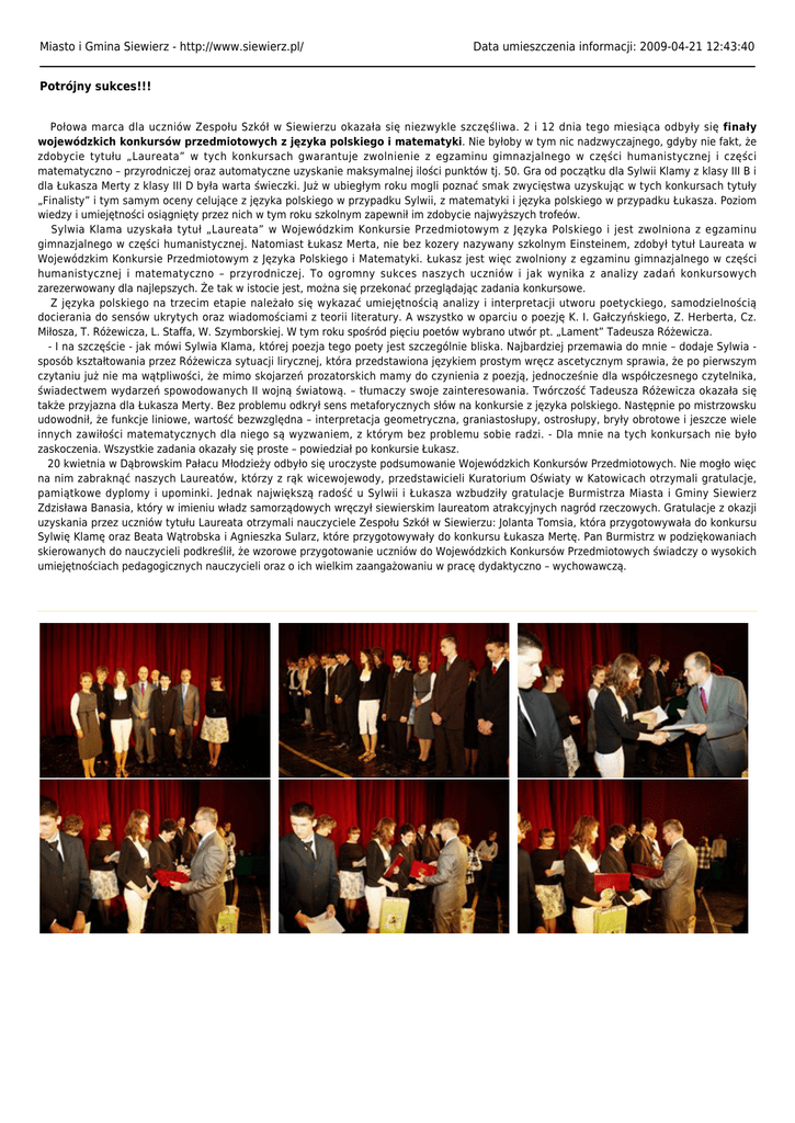 Miasto i Gmina Siewierz - http://www.siewierz.pl/ Data umieszczenia informacji: 2009-04-21 12:43:40 Potrójny sukces!!! Połowa marca dla uczniów Zespołu Szkół w Siewierzu okazała się niezwykle szczęśliwa. 2 i 12 dnia tego miesiąca odbyły się finały wojewódzkich konkursów przedmiotowych z języka polskiego i matematyki. Nie byłoby w tym nic nadzwyczajnego, gdyby nie fakt, że zdobycie tytułu „Laureata” w tych konkursach gwarantuje zwolnienie z egzaminu gimnazjalnego w części humanistycznej i części matematyczno – przyrodniczej oraz automatyczne uzyskanie maksymalnej ilości punktów tj. 50. Gra od początku dla Sylwii Klamy z klasy III B i dla Łukasza Merty z klasy III D była warta świeczki. Już w ubiegłym roku mogli poznać smak zwycięstwa uzyskując w tych konkursach tytuły „Finalisty” i tym samym oceny celujące z języka polskiego w przypadku Sylwii, z matematyki i języka polskiego w przypadku Łukasza. Poziom wiedzy i umiejętności osiągnięty przez nich w tym roku szkolnym zapewnił im zdobycie najwyższych trofeów. Sylwia Klama uzyskała tytuł „Laureata” w Wojewódzkim Konkursie Przedmiotowym z Języka Polskiego i jest zwolniona z egzaminu gimnazjalnego w części humanistycznej. Natomiast Łukasz Merta, nie bez kozery nazywany szkolnym Einsteinem, zdobył tytuł Laureata w Wojewódzkim Konkursie Przedmiotowym z Języka Polskiego i Matematyki. Łukasz jest więc zwolniony z egzaminu gimnazjalnego w części humanistycznej i matematyczno – przyrodniczej. To ogromny sukces naszych uczniów i jak wynika z analizy zadań konkursowych zarezerwowany dla najlepszych. Że tak w istocie jest, można się przekonać przeglądając zadania konkursowe. Z języka polskiego na trzecim etapie należało się wykazać umiejętnością analizy i interpretacji utworu poetyckiego, samodzielnością docierania do sensów ukrytych oraz wiadomościami z teorii literatury. A wszystko w oparciu o poezję K. I. Gałczyńskiego, Z. Herberta, Cz. Miłosza, T. Różewicza, L. Staffa, W. Szymborskiej. W tym roku spośród pięciu poetów wybrano utwór pt. „Lament” Tadeusza Różewicza. - I na szczęście - jak mówi Sylwia Klama, której poezja tego poety jest szczególnie bliska. Najbardziej przemawia do mnie – dodaje Sylwia sposób kształtowania przez Różewicza sytuacji lirycznej, która przedstawiona językiem prostym wręcz ascetycznym sprawia, że po pierwszym czytaniu już nie ma wątpliwości, że mimo skojarzeń prozatorskich mamy do czynienia z poezją, jednocześnie dla współczesnego czytelnika, świadectwem wydarzeń spowodowanych II wojną światową. – tłumaczy swoje zainteresowania. Twórczość Tadeusza Różewicza okazała się także przyjazna dla Łukasza Merty. Bez problemu odkrył sens metaforycznych słów na konkursie z języka polskiego. Następnie po mistrzowsku udowodnił, że funkcje liniowe, wartość bezwzględna – interpretacja geometryczna, graniastosłupy, ostrosłupy, bryły obrotowe i jeszcze wiele innych zawiłości matematycznych dla niego są wyzwaniem, z którym bez problemu sobie radzi. - Dla mnie na tych konkursach nie było zaskoczenia. Wszystkie zadania okazały się proste – powiedział po konkursie Łukasz. 20 kwietnia w Dąbrowskim Pałacu Młodzieży odbyło się uroczyste podsumowanie Wojewódzkich Konkursów Przedmiotowych. Nie mogło więc na nim zabraknąć naszych Laureatów, którzy z rąk wicewojewody, przedstawicieli Kuratorium Oświaty w Katowicach otrzymali gratulacje, pamiątkowe dyplomy i upominki. Jednak największą radość u Sylwii i Łukasza wzbudziły gratulacje Burmistrza Miasta i Gminy Siewierz Zdzisława Banasia, który w imieniu władz samorządowych wręczył siewierskim laureatom atrakcyjnych nagród rzeczowych. Gratulacje z okazji uzyskania przez uczniów tytułu Laureata otrzymali nauczyciele Zespołu Szkół w Siewierzu: Jolanta Tomsia, która przygotowywała do konkursu Sylwię Klamę oraz Beata Wątrobska i Agnieszka Sularz, które przygotowywały do konkursu Łukasza Mertę. Pan Burmistrz w podziękowaniach skierowanych do nauczycieli podkreślił, że wzorowe przygotowanie uczniów do Wojewódzkich Konkursów Przedmiotowych świadczy o wysokich umiejętnościach pedagogicznych nauczycieli oraz o ich wielkim zaangażowaniu w pracę dydaktyczno – wychowawczą. Urząd Miasta i Gminy Siewierz, 42-470 Siewierz, ul. Żwirki i WIgury 16, tel. 32 64 99 400, e-mail: [email protected] Burmistrz Miasta i Gminy Siewierz mgr Zdzisław Banaś