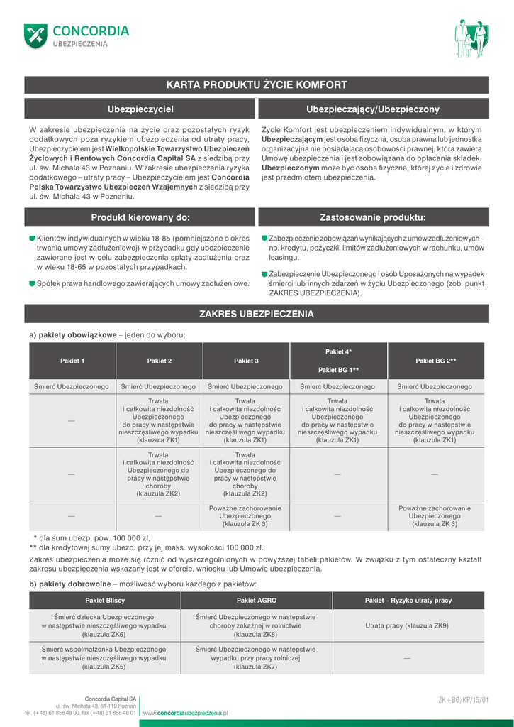 KARTA PRODUKTU Życie Komfort Ubezpieczyciel Ubezpieczający/Ubezpieczony W zakresie ubezpieczenia na życie oraz pozostałych ryzyk dodatkowych poza ryzykiem ubezpieczenia od utraty pracy, Ubezpieczycielem jest Wielkopolskie Towarzystwo Ubezpieczeń Życiowych i Rentowych Concordia Capital SA z siedzibą przy ul. św. Michała 43 w Poznaniu. W zakresie ubezpieczenia ryzyka dodatkowego – utraty pracy – Ubezpieczycielem jest Concordia Polska Towarzystwo Ubezpieczeń Wzajemnych z siedzibą przy ul. św. Michała 43 w Poznaniu. Życie Komfort jest ubezpieczeniem indywidualnym, w którym Ubezpieczającym jest osoba fizyczna, osoba prawna lub jednostka organizacyjna nie posiadająca osobowości prawnej, która zawiera Umowę ubezpieczenia i jest zobowiązana do opłacania składek. Ubezpieczonym może być osoba fizyczna, której życie i zdrowie jest przedmiotem ubezpieczenia. Produkt kierowany do: Zastosowanie produktu: lientów indywidualnych w wieku 18-85 (pomniejszone o okres K trwania umowy zadłużeniowej) w przypadku gdy ubezpieczenie zawierane jest w celu zabezpieczenia spłaty zadłużenia oraz w wieku 18-65 w pozostałych przypadkach. Spółek prawa handlowego zawierających umowy zadłużeniowe. Zabezpieczenie zobowiązań wynikających z umów zadłużeniowych – np. kredytu, pożyczki, limitów zadłużeniowych w rachunku, umów leasingu. Zabezpieczenie Ubezpieczonego i osób Uposażonych na wypadek śmierci lub innych zdarzeń w życiu Ubezpieczonego (zob. punkt ZAKRES UBEZPIECZENIA). Zakres ubezpieczenia a) pakiety obowiązkowe – jeden do wyboru: Pakiet 4* Pakiet 1 Pakiet 2 Pakiet 3 Pakiet BG 2** Pakiet BG 1** Śmierć Ubezpieczonego Śmierć Ubezpieczonego Śmierć Ubezpieczonego Śmierć Ubezpieczonego Śmierć Ubezpieczonego — Trwała i całkowita niezdolność Ubezpieczonego do pracy w następstwie nieszczęśliwego wypadku (klauzula ZK1) Trwała i całkowita niezdolność Ubezpieczonego do pracy w następstwie nieszczęśliwego wypadku (klauzula ZK1) Trwała i całkowita niezdolność Ubezpieczonego do pracy w następstwie nieszczęśliwego wypadku (klauzula ZK1) Trwała i całkowita niezdolność Ubezpieczonego do pracy w następstwie nieszczęśliwego wypadku (klauzula ZK1) — Trwała i całkowita niezdolność Ubezpieczonego do pracy w następstwie choroby (klauzula ZK2) Trwała i całkowita niezdolność Ubezpieczonego do pracy w następstwie choroby (klauzula ZK2) — — — — Poważne zachorowanie Ubezpieczonego (klauzula ZK 3) — Poważne zachorowanie Ubezpieczonego (klauzula ZK 3) * dla sum ubezp. pow. 100 000 zł, ** dla kredytowej sumy ubezp. przy jej maks. wysokości 100 000 zł. Zakres ubezpieczenia może się różnić od wyszczególnionych w powyższej tabeli pakietów. W związku z tym ostateczny kształt zakresu ubezpieczenia wskazany jest w ofercie, wniosku lub Umowie ubezpieczenia. b) pakiety dobrowolne – możliwość wyboru każdego z pakietów: Pakiet Bliscy Pakiet AGRO Pakiet – Ryzyko utraty pracy Śmierć dziecka Ubezpieczonego w następstwie nieszczęśliwego wypadku (klauzula ZK6) Śmierć Ubezpieczonego w następstwie choroby zakaźnej w rolnictwie (klauzula ZK8) Utrata pracy (klauzula ZK9) Śmierć współmałżonka Ubezpieczonego w następstwie nieszczęśliwego wypadku (klauzula ZK5) Śmierć Ubezpieczonego w następstwie wypadku przy pracy rolniczej (klauzula ZK7) — Concordia Capital SA ul. św. Michała 43, 61-119 Poznań tel. (+48) 61 858 48 00, fax (+48) 61 858 48 01 ŻK+BG/KP/15/01 www.concordiaubezpieczenia.pl KARTA PRODUKTU Życie Komfort Opis świadczeń § 7 i § 8 OWU Życie Komfort Z tytułu śmierci Ubezpieczonego Ubezpieczyciel wypłaca świadczenie główne, którego wysokość ustalana jest w sposób następujący. W odniesieniu do umów ubezpieczenia zawieranych: 1. na stałą sumę ubezpieczenia – Ubezpieczyciel wypłaca świadczenie główne w wysokości sumy ubezpieczenia; 2. na kredytową sumę ubezpieczenia – Ubezpieczyciel wypłaca świadczenie główne w wysokości aktualnego zobowiązania. Rodzaj sumy ubezpieczenia (stała/kredytowa) oraz jej wysokość wskazane są w dokumencie ubezpieczenia. Stała suma ubezpieczenia ma charakter stały w trakcie obowiązywania Umowy ubezpieczenia. Kredytowa suma ubezpieczenia może mieć zastosowanie wyłącznie do umów ubezpieczenia stanowiących zabezpieczenie zobowiązań wynikających z umowy zadłużeniowej. W przypadku umów zadłużeniowych, w których spłata kapitału następuje ratalnie, kredytowa suma ubezpieczenia ma charakter malejący. Jest ona w danym momencie równa aktualnej na dzień zajścia zdarzenia ubezpieczeniowego kwocie obliczanej na podstawie początkowego harmonogramu spłaty zadłużenia wynikającego z umowy zadłużeniowej. Kredytowa suma ubezpieczenia obejmuje sumę rat kapitałowych pozostających do spłaty w danym momencie zgodnie z tym harmonogramem oraz jedną zaległą ratę odsetkową – o ile występuje – jeśli zaległość w jej spłacie jest nie dłuższa niż 30 dni przed zajściem zdarzenia ubezpieczeniowego. Wysokość i zmienność sumy ubezpieczenia została szczegółowo opisana w § 8 ust. 2-6 i 11-13 OWU Życie Komfort. Opis świadczeń – klauzule (ryzyka) dodatkowe W przypadku klauzul dodatkowych Ubezpieczyciel wypłaca następujące świadczenia dodatkowe: Klauzula Świadczenie kredytowa suma ubezpieczenia Świadczenie stała suma ubezpieczenia Trwała i całkowita niezdolność Ubezpieczonego do pracy w następstwie nieszczęśliwego wypadku (klauzula ZK1) Określony % świadczenia głównego (aktualnego zobowiązania), nie więcej niż kwota wskazana w dokumencie ubezpieczenia Określony % świadczenia głównego (sumy ubezpieczenia), nie więcej niż kwota wskazana w dokumencie ubezpieczenia Trwała i całkowita niezdolność Ubezpieczonego do pracy w następstwie choroby (klauzula ZK2) Określony % świadczenia głównego (aktualnego zobowiązania), nie więcej niż kwota wskazana w dokumencie ubezpi