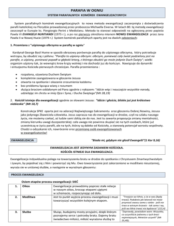 PARAFIA W OGNIU SYSTEM PARAFIALNYCH KOMÓREK EWANGELIZACYJNYCH System parafialnych komórek ewangelizacyjnych to nowa metoda ewangelizacji zaczerpnięta z doświadczenia parafii katolickiej na Florydzie prowadzonej przez proboszcza Michaella Eiversa. W latach 80. tę metodę ewangelizacji zaszczepił w Europie ks. Piergiorgio Perini z Mediolanu. Metoda ta stanowi odpowiedź na ogłoszoną przez papieża Pawła VI EVANGELII NUNTIANDI (1975 r.), a po raz pierwszy określona mianem NOWEJ EWANGELIZACJI przez Jana Pawła II w Nowej Hucie (1979 r.) System komórek parafialnych oparty jest na dwóch założeniach: 1. Przemiana z "uśpionego olbrzyma w parafię w ogniu" Kardynał George Basil Hume w sposób obrazowy porównuje parafię do uśpionego olbrzyma, który potrzebuje wstrząsu, by obudzić się z półsnu: "Parafia to uśpiony olbrzym: olbrzym, ponieważ cały świat podzielony jest na parafie, a uśpiony, ponieważ popadł w głęboki letarg, z którego obudzić go może jedynie Duch Święty"; wielki organizm uśpiony tak, że wewnątrz krew krąży wolniej i nie dochodzi juz do kończyn. Nawiązuje do dynamiki i entuzjazmu Kościoła pierwszych chrześcijan. Parafia przemieniona : rozpalona, ożywiona Duchem Świętym kompletnie zaangażowana w głoszenie Jezusa otwarta na spotkanie i okazanie zrozumienia każdemu bez problemu łącząca wiarę z rozumem służąca braciom oddalonym od Pana zgodnie z nakazem: "Idźcie więc i nauczajcie wszystkie narody, udzielając im chrztu w imię Ojca i Syna, i Ducha Świętego"(Mt 28,19) 2. Kościół istnieje dla ewangelizacji zgodnie ze słowami Jezusa: "Idźcie i głoście, bliskie już jest królestwo niebieskie" (Mt 10,7) Konstrukcja SPKE oparta jest na adoracji Najświętszego Sakramentu oraz głoszeniu Dobrej Nowiny, Jezusa jako jedynego Zbawiciela człowieka. Jezus zaprasza nas do ewangelizacji w drodze, czyli na szlaku naszego życia, nie możemy czekać, aż ludzie sami zbliżą sie do nas. Jest tu zawarta propozycja zmiany mentalności, zmiany kierunku uwagi duszpasterskiej: cała uwaga nie powinna skupiać sie na tych osobach, które już uczestniczą w życiu parafii, ale na tych, którzy są daleko od Kościoła, a stanowią potencjał wzrostu wspólnoty. Chodzi o odzyskanie ich, nawrócenie oraz przemianę osób ewangelizowanych w ewangelizatorów! EWANGELIZACJA "Biada mi, gdybym nie głosił Ewangelii"(1 Kor 9,16) EWANGELIZACJA JEST JEDYNYM ZADANIEM KOŚCIOŁA. KOŚCIÓŁ ISTNIEJE DLA EWANGELIZACJI. Ewangelizacja indywidualna polega na towarzyszeniu bratu w drodze do spotkania z Chrystusem Zmartwychwstałym i żywym, by pojednać się z Nim i powierzyć się Mu. Owo towarzyszenie jest zakorzenione w modlitwie nieustannej, wyraża sie w uniżonej służbie, a następnie w wyraźnym głoszeniu: PROCES EWANGELIZACJI 1. 2. 3. Osiem etapów procesu ewangelizacji: SIEĆ Oikos Ewangelizacje prowadzimy poprzez stałe relacje w naszym oikos, krocząc etapami ujętymi w schemacie, rozpoczynając od dołu. Modlitwa Jest to punkt wyjścia procesu ewangelizacji i musi towarzyszyć wszystkim kolejnym etapom. Służba Służąc, budujemy mosty przyjaźni, dzięki którym poznajemy serce i potrzeby brata. Dajemy bratu świadectwo miłości, miłość wyrażona służbą to "Trwajcie we Mnie, a Ja w was [będę trwać]. Podobnie jak latorośl nie może przynosić owocu sama z siebie - jeśli nie trwa w winnym krzewie - tak samo i wy, jeśli we Mnie trwać nie będziecie" (J15,4) "Zaprawdę, powiadam wam: Wszystko, co uczyniliście jednemu z tych braci najmniejszych, Mnieście uczynili" (Mt 25,40); klucz otwierający każde serce. "Nie ma nic piękniejszego niż wpaść w sieci Ewangelii Chrystusa. Nie ma nic przyjemniejszego, jak poznać Go i opowiadać innym o przyjaźni z Nim" Benedykt XVI "Ja jestem Światłością świata. Kto idzie za Mną, nie będzie chodził w ciemności, lecz będzie miał światło życia" (J 8,12) "Powierz Panu swą sprawę, a spełnią sie twoje zamiary" (Prz 16,3) 4. Dzielenie się wiarą Od cichego świadectwa życiem przechodzimy do wyraźnego głoszenia Jezusa jako naszego Pana 5. Objaśnianie Odpowiadamy na wiele pytań coraz bardziej głębokich, które w zaufaniu stawia nam brat. 6. Zawierzenie 7. Komórka 8. Parafia Poprzez głoszenie w sercu brata rośnie pragnienie powierzenia własnego życia Jezusowi "Trwali oni w nauce apostołów Przyjęcie Jezusa jako jedynego Pana życia i we wspólnocie, w łamaniu chleba sprawia, ze ewangelizowany ma coraz większe i w modlitwach" (Dz 2,42) pragnienie poznania i pokochania Go. Bracia zjednoczeni w komórce stanowią idealne środowisko dla przyjęcia, wspierania i towarzyszenia nowo przybyłemu. "Pan zaś przymnażał im codziennie tych, Komórka, będąc małą wspólnotą wiary, uczy którzy dostępowali zbawienia" (Dz 2,47) brata, jak przylgnąć do większej wspólnoty, jaką jest parafia. Ponadto ewangelizowany brat sam ze świeżym zapałem zacznie ewangelizować osoby we własnym oikos. I ETAP: KONCEPCJA SIECI - OIKOS Oikos - słowo greckiego pochodzenia: ekologia, ekosystem, ekonomia, oznacza także: dom, ognisko domowe, znajomych, środowisko pracy, przyjaciół, miejsca rozrywki. Oikos to ludzie, z którymi utrzymujemy stałe relacje. Jest to strategia ewangelizacji w istniejących relacjach. Wyróżnia się cztery środowiska właściwe relacjom: RODZINA - PRZYJACIELE - SASIEDZI - WSPÓŁPRACOWNICY = EWANGELIZACJA ŚRODOWISKA Każdy chrześcijanin musi być ewangelizatorem we własnym oikos - jest tu niezastąpiony. II ETAP SIECI: MODLITWA I SIŁA DUCHA ŚWIETEGO Zmartwychwstały Jezus zaprasza nas do przyjęcia Ducha Świętego: "Pokój wam! Jak Ojciec Mnie posłał, tak i Ja was posyłam." Po tych słowach tchnął na nich i powiedział im: "Weźmijcie Ducha Świętego!"(J 20, 21-22) Nieustanna modlitwa i pokorne, ale zdecydowane wołanie o dar Ducha Świętego i Jego charyzmatyczną moc zapewnią skuteczność naszemu zaangażowaniu w głoszeniu Ewange