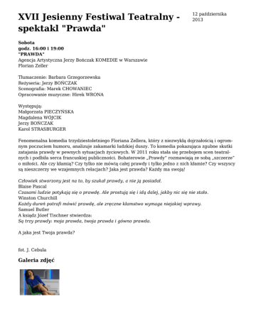 XVII Jesienny Festiwal Teatralny spektakl "Prawda" 12 października 2013 Sobota godz. 16:00 i 19:00 "PRAWDA" Agencja Artystyczna Jerzy Bończak KOMEDIE w Warszawie Florian Zeller Tłumaczenie: Barbara Grzegorzewska Reżyseria: Jerzy BOŃCZAK Scenografia: Marek CHOWANIEC Opracowanie muzyczne: Hirek WRONA Występują: Małgorzata PIECZYŃSKA Magdalena WÓJCIK Jerzy BOŃCZAK Karol STRASBURGER Fenomenalna komedia trzydziestoletniego Floriana Zellera, który z niezwykłą dojrzałością i ogromnym poczuciem humoru, analizuje zakamarki ludzkiej duszy. To komedia pokazująca zgubne skutki zatajania prawdy w pewnych sytuacjach życiowych. W 2011 roku stała się przebojem scen teatralnych i podbiła serca francuskiej publiczności. Bohaterowie „Prawdy” rozmawiają ze sobą „szczerze” o miłości. Ale czy kłamią? Czy tylko nie mówią całej prawdy i tylko jedno z nich kłamie? Czy wszyscy są nieszczerzy we wzajemnych relacjach? Jaka jest prawda? Każdy ma swoją! Człowiek stworzony jest na to, by szukał prawdy, a nie ją posiadał. Blaise Pascal Czasami ludzie potykają się o prawdę. Ale prostują się i idą dalej, jakby nic się nie stało. Winston Churchill Każdy dureń potrafi mówić prawdę, ale zręczne kłamstwo wymaga niejakiej wprawy. Samuel Butler A ksiądz Józef Tischner stwierdza: Są trzy prawdy: moja prawda, twoja prawda i gówno prawda. A jaka jest Twoja prawda? fot. J. Cebula Galeria zdjęć