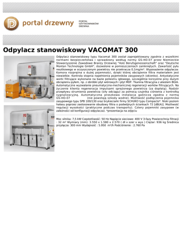 Odpylacz stanowiskowy VACOMAT 300 Odpylacz stanowiskowy typu Vacomat 300 został zaprojektowany zgodnie z wszelkimi normami bezpieczeństwa i sprawdzony według normy GS-HO-07 przez Niemieckie Stowarzyszenie Zawodowe Branży Drzewnej "Holz Berufsgenossenschaft" oraz "Deutsche Montan Technologie GmbH", dozwolone w pomieszczeniach zamkniętych. Zawartość pyłu resztkowego w oczyszczonym powietrzu nie przekracza 0,1mg/m³. Wyposażenie odpylacza: Komora rozprężna o dużej pojemności, dzięki której obciążenie filtra materiałem jest niewielkie. Kontrola stopnia napełnienia pojemników zasypowych (okienko). Antystatyczne worki filtrujące wykonane na bazie poliestru igłowego, szczególnie korzystne przy dużym obciążeniu pyłem, np. z obróbki płyt wiórowych i płyt MDF. Tkanina filtracyjna z atestem BGIA. Automatyczne wyzwalanie pneumatyczno-mechanicznej regeneracji worków filtrujących. Na życzenie klienta regeneracja impulsami sprężonego powietrza (za dopłatą). Nadzór przepływu strumienia powietrza (siły odciągu) za pomocą czujnika ciśnienia z kontrolką sygnalizacyjną. Automatyczna proszkowa instalacja gaśnicza zgodna z normą GS-HO-07 (nie powstają szkody wodne). Możliwość podłączenia pojemnika zasypowego typu SPB 100/130 oraz brykieciarki firmy SCHUKO typu Compacto*. Niski poziom hałasu poprzez zastosowanie obudowy filtra o podwójnych ściankach 72 [dB(A)]. Możliwość regulacji wysokości (praktyczne podczas transportu). Cztery pojemniki zasypowe (w zależności od konfiguracji odpylacza). *prezentacja na zdjęciu Moc silnika: 7,5 kW Częstotliwość: 50 Hz Napięcie sieciowe: 400 V 3-fazy Powierzchnia filtracji : 32 m² Wymiary (mm): 3.550 x 1.580 x 2.570 ( dł x szer x wys ) Ciężar: 936 kg Średnica przyłącza: 300 mm Wydajność : 5.950 m³/h Podciśnienie : 2.760 Pa