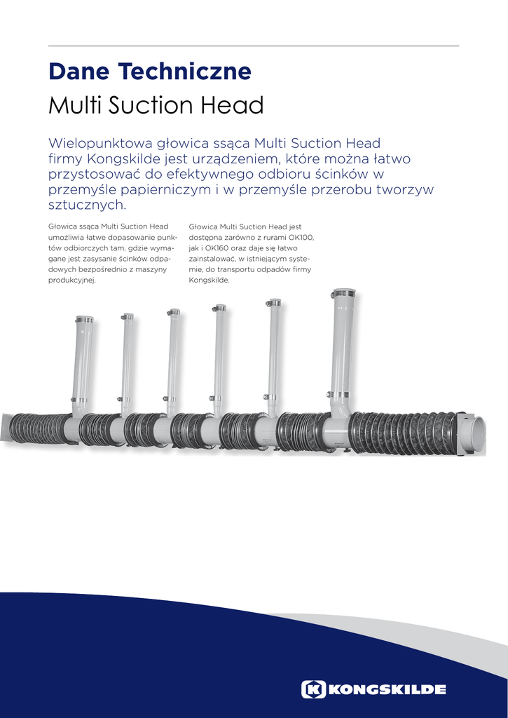 Dane Techniczne Multi Suction Head Wielopunktowa głowica ssąca Multi Suction Head firmy Kongskilde jest urządzeniem, które można łatwo przystosować do efektywnego odbioru ścinków w przemyśle papierniczym i w przemyśle przerobu tworzyw sztucznych. Głowica ssąca Multi Suction Head umożliwia łatwe dopasowanie punktów odbiorczych tam, gdzie wymagane jest zasysanie ścinków odpadowych bezpośrednio z maszyny produkcyjnej. Głowica Multi Suction Head jest dostępna zarówno z rurami OK100, jak i OK160 oraz daje się łatwo zainstalować, w istniejącym systemie, do transportu odpadów firmy Kongskilde. Zastosowanie Głowica Multi Suction Head jest instalowane bezpośrednio na ma szynie głównej, zajmując niewiele miejsca. Punkty odbioru ścinka dają się łatwo przesuwać na boki na rurze głównej, umożliwiając rozwiązania zgodne z życzeniem klienta oraz szybką konfigurację do nowych zadań. Działanie Urządzenie Multi Suction Head składa się z rury głównej przelotowej wzdłuż całej swej długości. Punkty zasysające dostępne w różnych średnicach, są zamontowane na ruchomych rękawach, które dołączono do zewnętrznej strony rury głównej, co pozwala na dokładne ich dopasowanie do urządzenia produkującego ścinkę. Wąż elastyczny, znajdujący się pomiędzy ruchomymi rękawami, wewnątrz rury głównej zapewnia ciągłą szczelność. Aby zapewnić równomierne zasysanie we wszystkich punktach odbiorczych, rura główna wewnątrz ma przekrój stożkowy, z najwęższym końcem znajdującym się najbliżej jej zamkniętej strony. Rura jest na zewnątrz cylindryczna, aby ułatwić dopasowanie elastycznego węża. Rura główna jest dostępna w czterech standardowych długościach, które mogą być skrócone do jednego metra w Części składowe Głowica Multi Suction Head składa się z czterech głównych części składowych, które w różnych kombinacjach tworzą kompletną całość. obydwu kierunkach, aby dopasować ją do szerokości maszyny głównej. Możliwość ustawienia różnych odległości pomiędzy punktami odbiorczymi jest ograniczona tylko przez elastyczny wąż pomiędzy ruchomymi rękawami. Dlatego maksymalna odległość pomiędzy rurami dwóch punktów odbiorczych to wielkość 6 razy większa niż odległość minimalna. Rura główna jest wyposażona w kołnierz na obu końcach do zamocowania jej na maszynie produkcyjnej. Należy zapewnić możliwość przejścia przez ramę z jednej strony maszyny produkcyjnej, aby podłączyć głowicę Multi Suction Head do systemu rur, który biegnie od dmuchawy Multiair. Rysunki czterech głównych części składowych 1: Punkt zasysający 1: Ruchomy rękaw 1: Rura główna 1: Elastyczny wąż Zamówienia Głowica Multi Suction Head może być składana na różne sposoby, dając możliwość tworzenia wielu różnorodnych kombinacji. Dlatego różne części należy zamawiać oddzielnie. Poniższa tabela zawiera wskazówki pomocne przy zamówieniach. Z powodu swojej konstrukcji, głowica Multi Suction Head jest dostarczana jako pojedynczy element składowy. W razie potrzeby, firma Kongskilde chętnie pomoże przy montażu sprzętu. Główny przewód rurowy można zamówić w trzech długościach: 1,3-3,3 m, 3,3-4,5 m oraz 4,5-6,3 m. Elastyczny wąż należy również zamawiać oddzielnie. Rura ta dostarczana jest w trzech różnych długościach: 2 m, 4 m i 6 m. W celu uzyskania optymalnej elastyczności instalacji, ważne jest aby elastyczny Przy obliczaniu wymaganej długości rury głównej, należy zmierzyć szerokość od kołnierza do kołnierza. Rura główna głowicy Multi Suction Head jest standardowo dostarczana z dwoma rękawami. Dodatkowe rękawy można zamówić oddzielnie. przewód odpowiadał żądanym opcjom. Dalsze informacje i wskazówki na ten temat można uzyskać kontaktując się z firmą Kongskilde. Multi Suction Head OK100 Rozmiar punktów zasysających Części składowe Liczba ruchomych Ø50 Ø60 Ø76 Ø100 Min. długość rury głownej rękawów, które należy zamawiać oddzielnie 2 3 4 2 2 5 0.8 1.2 1.6 1.6 2.0 0 1 2 2 3 Multi Suction Head OK160 Rozmiar punktów zasysających Części składowe Liczba ruchomych Ø50 Ø60 Ø76 Ø100 Min. długość rury głownej rękawów, które należy zamawiać oddzielnie 2 0.8 0 3 1.2 1 1 2 1.2 1 1 2 1.2 1 4 1.6 2 2 2 1.6 2 3 2 2.0 3 4 2 2.4 4 4 2 2.4 4 7 2.8 5 5 2 2.8 5 5 2 2.8 5 8 3.2 6 6 2 3.2 6 7 2 3.6 7 10 4.0 8 8 2 4.0 8 11 4.4 9 12 4.8 10 Liczba punktów zasysających 2 3 4 4 5 Liczba punktów zasysających 2 3 3 3 4 4 5 6 6 7 7 7 8 8 9 10 10 11 12 Wymiary Długość zmienna 150 150 200 4 x ø9 Rama maszyny 730 OK160/OK100 Rama maszyny min. 325 min. 325 150 200 150 W przypadku kilku ścinków odpadowych, można zainstalować potrzebną liczbę dodatkowych punktów odbiorczych. Liczba punktów zasysających, które można zainstalować, zależy od długości rury głównej. zasysających. Dzięki odpowiedniemu doborowi kolanek i rur, punkt zasysający może być skierowany niemal w każdym kierunku.Wyposażenie dodatkowe dla głowicy Multi Suction Head obejmuje kolanka o kącie 45°, różne przewody rurowe i dodatkowe zaciski. Multi Suction Head po raz kolejny udowadnia swoją elastyczność różnorodnością części składowych punktów Subject to modifications. Różne kombinacje kolanek 123001712 KPL/PL/Multi Suction Head/DATA/0416 Opcje Kongskilde Polska Sp. z o.o. Tel. 024 355 96 15 [email protected] www.kongskilde.com