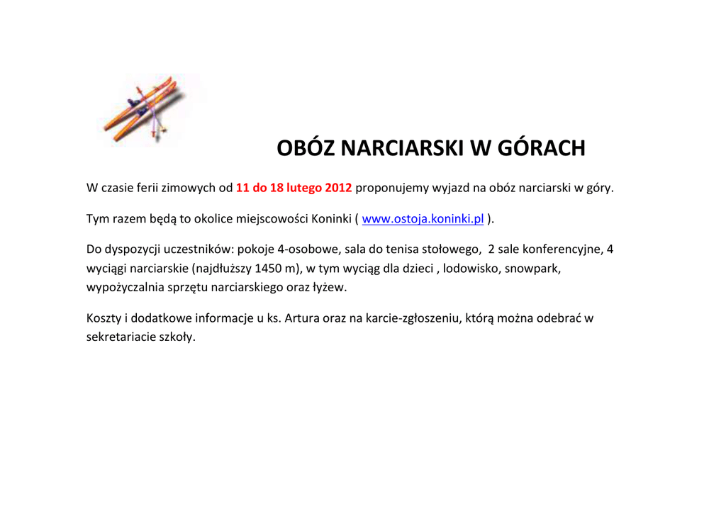 OBÓZ NARCIARSKI W GÓRACH W czasie ferii zimowych od 11 do 18 lutego 2012 proponujemy wyjazd na obóz narciarski w góry. Tym razem będą to okolice miejscowości Koninki ( www.ostoja.koninki.pl ). Do dyspozycji uczestników: pokoje 4-osobowe, sala do tenisa stołowego, 2 sale konferencyjne, 4 wyciągi narciarskie (najdłuższy 1450 m), w tym wyciąg dla dzieci , lodowisko, snowpark, wypożyczalnia sprzętu narciarskiego oraz łyżew. Koszty i dodatkowe informacje u ks. Artura oraz na karcie-zgłoszeniu, którą można odebrad w sekretariacie szkoły.