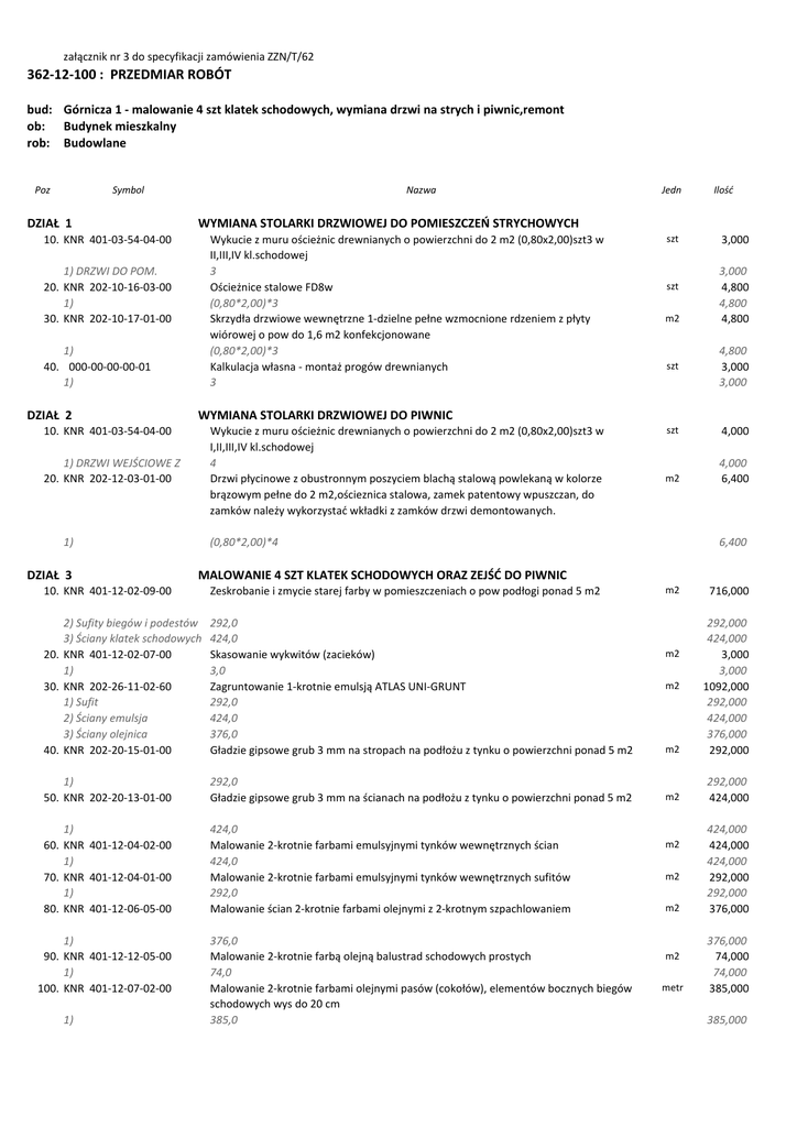 załącznik nr 3 do specyfikacji zamówienia ZZN/T/62 362-12-100 : PRZEDMIAR ROBÓT bud: Górnicza 1 - malowanie 4 szt klatek schodowych, wymiana drzwi na strych i piwnic,remont ob: Budynek mieszkalny rob: Budowlane Poz Symbol DZIAŁ 1 Nazwa Wykucie z muru ościeżnic drewnianych o powierzchni do 2 m2 (0,80x2,00)szt3 w II,III,IV kl.schodowej 3 Ościeżnice stalowe FD8w (0,80*2,00)*3 Skrzydła drzwiowe wewnętrzne 1-dzielne pełne wzmocnione rdzeniem z płyty wiórowej o pow do 1,6 m2 konfekcjonowane (0,80*2,00)*3 Kalkulacja własna - montaż progów drewnianych 3 1) DRZWI DO POM. 20. KNR 202-10-16-03-00 1) 30. KNR 202-10-17-01-00 1) 40. 000-00-00-00-01 1) Wykucie z muru ościeżnic drewnianych o powierzchni do 2 m2 (0,80x2,00)szt3 w I,II,III,IV kl.schodowej 4 Drzwi płycinowe z obustronnym poszyciem blachą stalową powlekaną w kolorze brązowym pełne do 2 m2,ościeznica stalowa, zamek patentowy wpuszczan, do zamków należy wykorzystać wkładki z zamków drzwi demontowanych. 1) DRZWI WEJŚCIOWE Z 20. KNR 202-12-03-01-00 1) m2 3,000 3,000 4,800 4,800 4,800 szt 4,800 3,000 3,000 szt 4,000 m2 4,000 6,400 6,400 MALOWANIE 4 SZT KLATEK SCHODOWYCH ORAZ ZEJŚĆ DO PIWNIC Zeskrobanie i zmycie starej farby w pomieszczeniach o pow podłogi ponad 5 m2 2) Sufity biegów i podestów 3) Ściany klatek schodowych 20. KNR 401-12-02-07-00 1) 30. KNR 202-26-11-02-60 1) Sufit 2) Ściany emulsja 3) Ściany olejnica 40. KNR 202-20-15-01-00 292,0 424,0 Skasowanie wykwitów (zacieków) 3,0 Zagruntowanie 1-krotnie emulsją ATLAS UNI-GRUNT 292,0 424,0 376,0 Gładzie gipsowe grub 3 mm na stropach na podłożu z tynku o powierzchni ponad 5 m2 1) 50. KNR 202-20-13-01-00 292,0 Gładzie gipsowe grub 3 mm na ścianach na podłożu z tynku o powierzchni ponad 5 m2 1) 60. KNR 401-12-04-02-00 1) 70. KNR 401-12-04-01-00 1) 80. KNR 401-12-06-05-00 424,0 Malowanie 2-krotnie farbami emulsyjnymi tynków wewnętrznych ścian 424,0 Malowanie 2-krotnie farbami emulsyjnymi tynków wewnętrznych sufitów 292,0 Malowanie ścian 2-krotnie farbami olejnymi z 2-krotnym szpachlowaniem 1) szt (0,80*2,00)*4 10. KNR 401-12-02-09-00 1) 90. KNR 401-12-12-05-00 1) 100. KNR 401-12-07-02-00 szt WYMIANA STOLARKI DRZWIOWEJ DO PIWNIC 10. KNR 401-03-54-04-00 DZIAŁ 3 Ilość WYMIANA STOLARKI DRZWIOWEJ DO POMIESZCZEŃ STRYCHOWYCH 10. KNR 401-03-54-04-00 DZIAŁ 2 Jedn 376,0 Malowanie 2-krotnie farbą olejną balustrad schodowych prostych 74,0 Malowanie 2-krotnie farbami olejnymi pasów (cokołów), elementów bocznych biegów schodowych wys do 20 cm 385,0 m2 716,000 m2 292,000 424,000 3,000 3,000 1092,000 292,000 424,000 376,000 292,000 m2 292,000 424,000 m2 m2 m2 m2 m2 m2 metr 424,000 424,000 424,000 292,000 292,000 376,000 376,000 74,000 74,000 385,000 385,000 110. KNR 401-12-09-04-00 1) 120. 000-00-00-00-01 1) DZIAŁ 4 10. KNNR N009-02-03-05-00 20. KNNR N009-04-01-07-00 30. KNNR N009-05-01-05-00 40. KNR 403-09-07-01-00 50. KNR 401-03-47-10-00 60. KNR 403-11-45-01-00 70. KNR 403-11-46-01-00 80. KNNR N009-04-03-06-00 90. KNNR N005-04-04-05-00 100. 110. 120. 130. 140. KNNR N005-04-07-03-00 KNNR N005-04-07-01-00 KNNR N005-04-07-01-00 KNNR N005-04-07-01-00 KNNR N005-04-06-01-00 150. KNNR N005-02-01-03-00 160. KNNR N005-04-06-01-00 170. KNNR N005-04-06-01-00 180. KNNR N005-04-04-05-00 1) 190. KNNR N005-04-07-02-01 200. KNNR N005-02-03-03-03 210. KNNR N005-05-02-01-02 220. KNNR N005-04-06-01-00 230. KNNR N005-04-06-01-00 240. 250. 260. 270. 280. 290. 300. 310. 320. 330. 340. 350. 360. KNNR N009-04-01-01-05 KNNR N009-04-03-02-01 KNNR N005-12-07-01-00 KNNR N005-12-08-01-00 KNNR N005-12-09-05-00 KNNR N005-02-04-02-04 KNNR N005-03-02-01-00 KNNR N005-01-03-05-01 KNNR N005-02-03-01-05 KNNR N005-02-03-01-04 KNNR N005-03-07-01-00 KNNR N005-03-04-01-00 KNNR N005-05-04-02-00 370. KNNR N005-04-06-01-00 Malowanie 2-krotnie farbą olejną stolarki okiennej pow do 0,5 m2 - gabloty na ogłoszenia 1,60 Kalkulacja własna - wykonanie napisów: "Dbaj o czystość", data malowania klatki. szt 1,600 kmpl 1,600 4,000 4 4,000 Instalacja elektryczna oświetleniowa potrzeb administracyjnych klatek Demontaż aparatu elektrycznego o masie do 2,5 kg-,automatów schodowych, wyłączników, ,gniazd bezpiecznikowych tablicowych,automatów zmierzchowych,zasilaczy domof. Demontaż łączników instalacyjnych podtynkowych i natynkowych nieuszczelnionych, przycisków "dzwonek" Demontaż oprawy żarowej- kl.sch.strych Odłączenie przewodów o przekroju żył do 2,5 mm2 od tulejek, zacisków w puszkach szt 20,000 szt 25,000 szt szt 23,000 40,000 Skucie występów na ścianach z cegieł na zaprawie cementowej Demontaż drzwiczek wnękowych pow do 0,5 m2 z podłoża ceglanego mocowanych na śrubach kotwowych Demontaż płyty izolacyjnej o pow do 0,5 m2 wnęki rozdzielczej Demontaż puszek i odgałęźników podtynkowych i natynkowych do fi 60 Montaż obudowy tablicy elektrycznej o powierzchni do 0,1 m2-rozdzielnica wnękowa RW-3 3x12S IP30 /530x285x130/ prod.Firma-Kubiak Wyłącznik przeciwporażeniowy 1(2)-biegunowy 25A 30mA Wyłącznik nadprądowy 1-biegunowy S191 B6A Wyłącznik nadprądowy 1-biegunowy S191 B10A Wyłącznik nadprądowy 1-biegunowy S191 B16A Montaż aparatu elektrycznego o masie do 2,5 kg - montaz ist.transformatorów dzwonkowych,ist.zasilaczy domofonowych, automatu zmierzchowego AZ-112 m2 szt 0,500 4,000 szt szt szt 4,000 80,000 4,000 szt szt szt szt szt 4,000 24,000 8,000 4,000 9,000 Przewód izolowany jednożyłowy LY 4,0 wciągany do rur Montaż aparatu elektrycznego o masie do 2,5 kg-rozłącznik izolacyjny FR40A 3 bieg.na szynę TH Montaż aparatu elektrycznego o masie do 2,5 kg-montaz zestawu instalacyjnego C1648N IP44 16A 3P+N+PE prod.SID Elektromet Montaż obudowy tablicy elektrycznej o powierzchni do 0,1 m2- obudowa OZR-2322 IP30 /288x237x175/ prod.Firma-Kubiak 1,00 Wyłącznik nadprądowy 3-biegunowy S193 C16A Przewód kabelkowy YDY 5x4,0 wciągany do rur Montaż oprawy plafoniery technicznej żarowej CAMEA PRO RCR LED 12W IP 44 prod.Lenna Lighting Montaż 