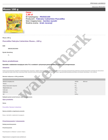 Informacje o produkcie Utworzono 09-03-2017 Musss 100 g Cena : 1,89 zł Nr katalogowy : MUSSS100 Producent : Fabryka Cukierków Pszczółka Stan magazynowy : bardzo wysoki Średnia ocena : brak recenzji er m ar k Musss 100 g Pszczółka Fabryka Cukierków Musss...100 g EAN 5901812623454 Rynek docelowy PL Dane produktowe Karmelki z nadzieniem musującym (min.7%) o smakach: cytrynowym,pomarańczowym,wiśniowym,winogronowym. Składniki Cukier,syrop glukozowy,regulatory kwasowości:kwas cytrynowy i węglan sodu,koncentraty soków owocowych 0,1% (cytrynowy,pomarańczowy,wiśniowy),aromaty,koncentrat czarnego bzu (koncentrat czarnego bzu,woda,cukier,kwas cytrynowy E330), barwniki:kurkumina,koszenila.Produkt może zawierać: mleko i jego pochodne,produkty pochodne soi,orzeszki arachidowe i inne orzechy. Wartość energetyczna Tłuszcz Kwasy tłuszczowe nasycone Węglowodany (g) Białko (g) Sól w Cukry (g) at Wartości odżywcze w 100 g produktu Najlepiej spożyć przed końcem: data na opakowaniu Opis produktu Marka Pszczółka Fabryka Cukierków Nazwa produktu uregulowana prawnie Musss...Karmelki z nadzieniem musującym. Przechowywanie i stosowanie Rodzaj przechowywania Przechowywanie Przechowywać w chłodnym i suchym miejscu Wygenerowano w programie www.oscGold.com 1622kJ 0g 0g 95 g 72 g 0g 0,95 g 382 kcal Opakowanie Rozmiar opakowania Rodzaj opakowania Typ - Zgrzewane Waga Obsługa klienta Adres producenta Fabryka Cukierków „Pszczółka” Sp. z o.o. 20-401 Lublin ul. Krochmalna 13 i tel. 814 3632 361, fax 814 632 358 www.pszczolka.pl Polska Adres zwrotny 20-401 Lublin ul. Krochmalna 13 i at Fabryka Cukierków „Pszczółka” Sp. z o.o. w tel. 814 3632 361, fax 814 632 358 Adres internetowy www.pszczolka.pl Rozszerzone dane Język produktu Główny język opisu - polski Język danych - polski Języki na opakowaniu ● polski er m ar k Waga netto – 100 g
