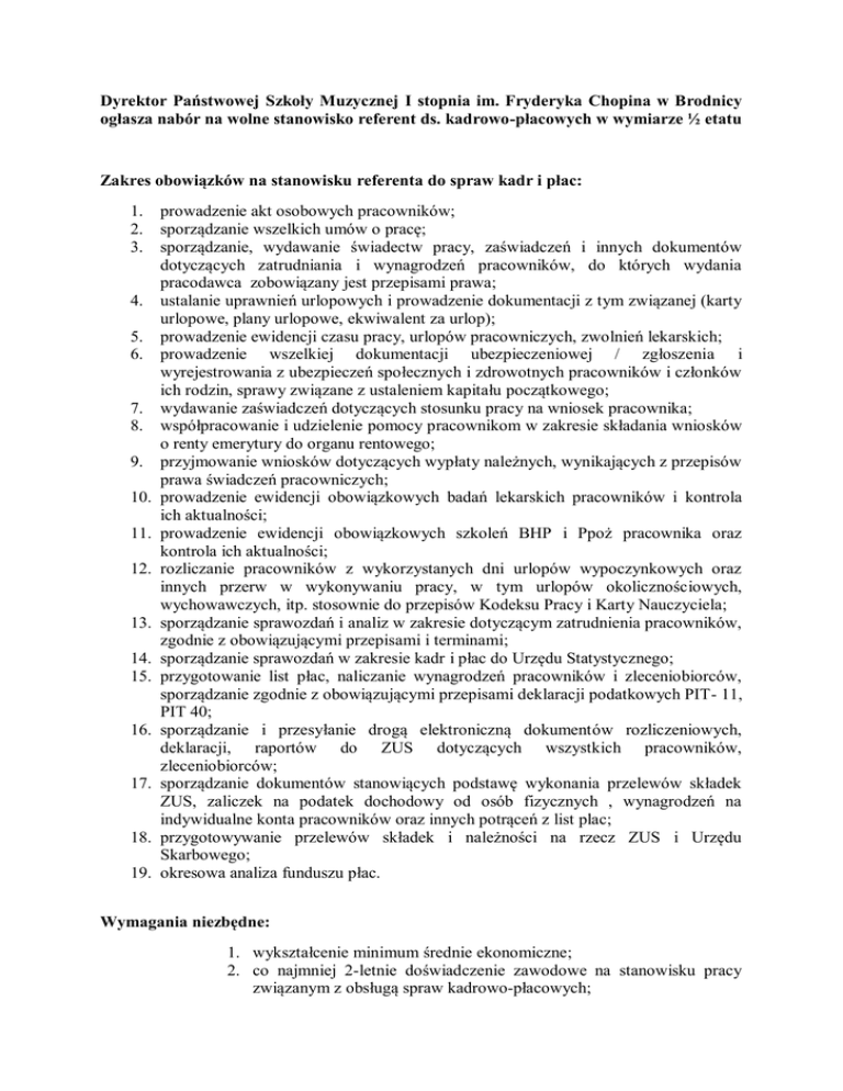 Dyrektor Państwowej Szkoły Muzycznej I stopnia im. Fryderyka Chopina w Brodnicy ogłasza nabór na wolne stanowisko referent ds. kadrowo-płacowych w wymiarze ½ etatu Zakres obowiązków na stanowisku referenta do spraw kadr i płac: 1. 2. 3. 4. 5. 6. 7. 8. 9. 10. 11. 12. 13. 14. 15. 16. 17. 18. 19. prowadzenie akt osobowych pracowników; sporządzanie wszelkich umów o pracę; sporządzanie, wydawanie świadectw pracy, zaświadczeń i innych dokumentów dotyczących zatrudniania i wynagrodzeń pracowników, do których wydania pracodawca zobowiązany jest przepisami prawa; ustalanie uprawnień urlopowych i prowadzenie dokumentacji z tym związanej (karty urlopowe, plany urlopowe, ekwiwalent za urlop); prowadzenie ewidencji czasu pracy, urlopów pracowniczych, zwolnień lekarskich; prowadzenie wszelkiej dokumentacji ubezpieczeniowej / zgłoszenia i wyrejestrowania z ubezpieczeń społecznych i zdrowotnych pracowników i członków ich rodzin, sprawy związane z ustaleniem kapitału początkowego; wydawanie zaświadczeń dotyczących stosunku pracy na wniosek pracownika; współpracowanie i udzielenie pomocy pracownikom w zakresie składania wniosków o renty emerytury do organu rentowego; przyjmowanie wniosków dotyczących wypłaty należnych, wynikających z przepisów prawa świadczeń pracowniczych; prowadzenie ewidencji obowiązkowych badań lekarskich pracowników i kontrola ich aktualności; prowadzenie ewidencji obowiązkowych szkoleń BHP i Ppoż pracownika oraz kontrola ich aktualności; rozliczanie pracowników z wykorzystanych dni urlopów wypoczynkowych oraz innych przerw w wykonywaniu pracy, w tym urlopów okolicznościowych, wychowawczych, itp. stosownie do przepisów Kodeksu Pracy i Karty Nauczyciela; sporządzanie sprawozdań i analiz w zakresie dotyczącym zatrudnienia pracowników, zgodnie z obowiązującymi przepisami i terminami; sporządzanie sprawozdań w zakresie kadr i płac do Urzędu Statystycznego; przygotowanie list płac, naliczanie wynagrodzeń pracowników i zleceniobiorców, sporządzanie zgodnie z obowiązującymi przepisami deklaracji podatkowych PIT- 11, PIT 40; sporządzanie i przesyłanie drogą elektroniczną dokumentów rozliczeniowych, deklaracji, raportów do ZUS dotyczących wszystkich pracowników, zleceniobiorców; sporządzanie dokumentów stanowiących podstawę wykonania przelewów składek ZUS, zaliczek na podatek dochodowy od osób fizycznych , wynagrodzeń na indywidualne konta pracowników oraz innych potrąceń z list plac; przygotowywanie przelewów składek i należności na rzecz ZUS i Urzędu Skarbowego; okresowa analiza funduszu płac. Wymagania niezbędne: 1. wykształcenie minimum średnie ekonomiczne; 2. co najmniej 2-letnie doświadczenie zawodowe na stanowisku pracy związanym z obsługą spraw kadrowo-płacowych; 3. praktyczna umiejętność wykonywania czynności z zakresu kompleksowej obsługi kadrowej; 4. biegła obsługa komputera (pakiet MS Office, Płatnik) i urządzeń biurowych; 5. dobra znajomość przepisów prawnych dotyczących zadań wykonywanych na stanowisku pracy w tym: prawa pracy i przepisów wykonawczych, ustawy o systemie oświaty, ustawy Karty Nauczyciela, ustawy o ochronie danych osobowych; 6. obywatelstwo polskie; 7. zdolność do czynności prawnych i korzystania z pełni praw publicznych; 8. niekaralność za przestępstwa popełnione umyślnie ścigane z oskarżenia publicznego lub umyślne przestępstwa skarbowe; 9. nieposzlakowana opinia. Wymagania dodatkowe: 1. odpowiedzialność, sumienność, zaangażowanie i samodzielność; 2. umiejętności analityczne i interpersonalne; 3. dokładność; 4. umiejętność pracy w zespole; 5. oprogramowanie kadrowe i płacowe Vulcan; 6. umiejętność nawiązywania kontaktów i współpracy z innymi instytucjami zewnętrznymi. Wymagane dokumenty: 1. 2. 3. 4. 5. 6. 7. 8. 9. list motywacyjny; CV z dokładnym opisem przebiegu pracy zawodowej; kwestionariu osobowy; kserokopie dokumentów potwierdzających wykształecenie, posiadane kwalifikacje zawodowe, nabyte umiejętności, poświadczone przez kandydata za zgodność z oryginałem; kserokopie dokumentów potwierdzających staż pracy (świadectwa pracy, zaświadczenia), poświadczone przez kandydata za zgodność z oryginałem; zaświadczenie lekarskie o braku przeciwwskazań zdrowotnych do zajmowanego stanowiska; oświadczenie kandydata, że nie był karany za przestępstwo popełnione umyślnie oraz za naruszenie dyscypliny finansów publicznych, oświadczenie kandydata, że posiada pełną zdolność do czynności prawnych oraz korzysta z pełni praw publicznych; oświadczenie o wyrażeniu zgody na przetwarzanie danych osobowych dla celów rekrutacji o treści: “Wyrażam zgodę na przetwarzanie moich danych osobowych zawartych w ofercie pracy dla potrzeb niezbędnych do realizacji procesu rekrutacji zgodnie z ustawą z dnia 29 sierpnia 1997 roku o ochronie danych osobowych (tj. z 2002 roku Dz. U. Nr 101, poz. 926 z późn. zm.).