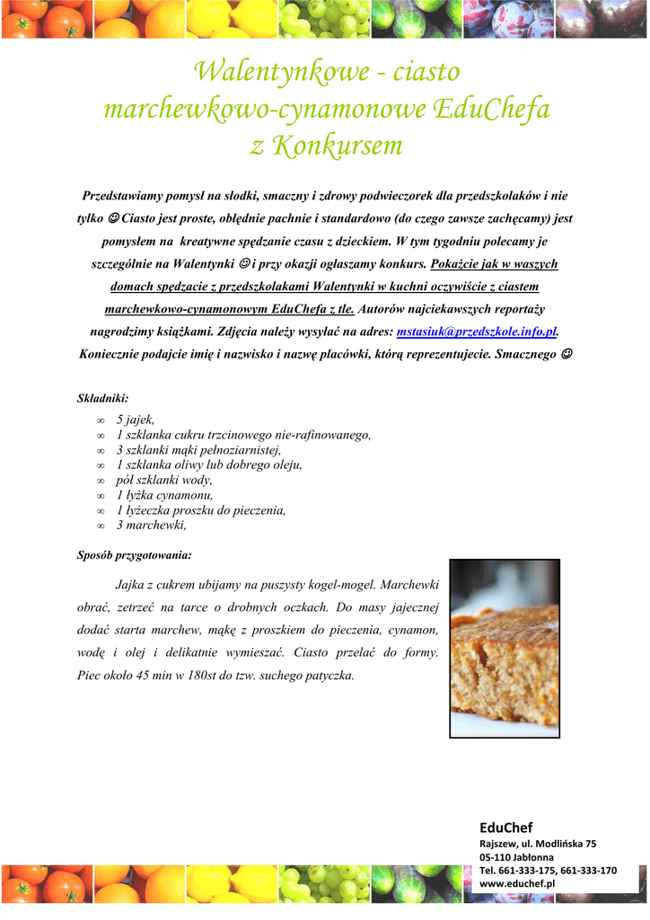 Walentynkowe - ciasto marchewkowo-cynamonowe EduChefa z Konkursem Przedstawiamy pomysł na słodki, smaczny i zdrowy podwieczorek dla przedszkolaków i nie tylko ☺ Ciasto jest proste, obłędnie pachnie i standardowo (do czego zawsze zachęcamy) jest pomysłem na kreatywne spędzanie czasu z dzieckiem. W tym tygodniu polecamy je szczególnie na Walentynki ☺ i przy okazji ogłaszamy konkurs. Pokażcie jak w waszych domach spędzacie z przedszkolakami Walentynki w kuchni oczywiście z ciastem marchewkowo-cynamonowym EduChefa z tle. Autorów najciekawszych reportaży nagrodzimy książkami. Zdjęcia należy wysyłać na adres: [email protected]. Koniecznie podajcie imię i nazwisko i nazwę placówki, którą reprezentujecie. Smacznego ☺ Składniki: • • • • • • • • 5 jajek, 1 szklanka cukru trzcinowego nie-rafinowanego, 3 szklanki mąki pełnoziarnistej, 1 szklanka oliwy lub dobrego oleju, pół szklanki wody, 1 łyżka cynamonu, 1 łyżeczka proszku do pieczenia, 3 marchewki, Sposób przygotowania: Jajka z cukrem ubijamy na puszysty kogel-mogel. Marchewki obrać, zetrzeć na tarce o drobnych oczkach. Do masy jajecznej dodać starta marchew, mąkę z proszkiem do pieczenia, cynamon, wodę i olej i delikatnie wymieszać. Ciasto przelać do formy. Piec około 45 min w 180st do tzw. suchego patyczka. EduChef Rajszew, ul. Modlińska 75 05-110 Jabłonna Tel. 661-333-175, 661-333-170 www.educhef.pl