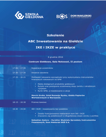 Szkolenie ABC Inwestowania na Giełdzie IKE i IKZE w praktyce 6 grudnia 2016 Centrum Giełdowe, Sala Notowań, II poziom 17:00 – 17:30 Rejestracja uczestników 17:30 – 17:35 Otwarcie szkolenia 17:35 – 18.15 Możliwości lokowania oszczędności przy wykorzystaniu instrumentów finansowych notowanych na GPW    Paleta dostępnych produktów giełdowych Ryzyko oraz powiązanie oczekiwanej stopy zwrotu z określonym ryzykiem Rynki GPW, a inwestowanie w akcje Marcin Gruba, Dział Rozwoju Rynku, Giełda Papierów Warto ciowych w Warszawie 18:15 – 18:30 Przerwa kawowa 18.30 - 19.30 IKE i IKZE - inwestowanie bez podatków   Zasady funkcjonowania maklerskich kont IKE i IKZE Znaczenie ulg podatkowych w długofalowej stopie zwrotu z portfela Sebastian Zadora – Dyrektor Wydziału Sprzedaży Instrumentów Finansowych, Dom Maklerski BO S.A.