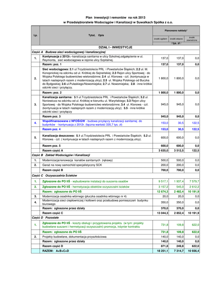 Plan inwestycji i remontów na rok 2013 w Przedsiębiorstwie Wodociągów i Kanalizacji w Suwałkach Spółka z o.o. Planowane nakłady* Lp. Tytuł, Opis środki ogółem środki własne środki zewnetrzne / tys. zł / DZIAŁ I - INWESTYCJE Część A Budowa sieci wodociągowej i kanalizacyjnej 1. 2. 3. 4. 5. Kontynuacja z 2012r.- kanalizacja sanitarna w ulicy Szkolnej,odgałęzienie w ul. Reymonta, sieć wodociagowa w rejonie ulicy Szpitalnej. Razem: poz. 1 137,0 137,0 0,0 137,0 137,0 0,0 Sieć wodociągowa: 2.1 ul.Trzydziestolecia PRL i Powstańców Śląskich; 2.2 ul. M. Konopnickiej na odcinku od ul. Krótkiej do Sejneńskiej; 2.3 Rejon ulicy Sportowej - do Wojska Polskiego budownictwo wielorodzinne; 2.4 ul. Klonowa - czI. (kontynuacja w latach nastepnych razem z modernizacją ulicy); 2.5 ul. Wojska Polskiego od Buczka do Bydgoskiej; 2.6 ul.Pułaskiego/Nowomiejska; 2.7 ul. Nowomiejska; 2.8 - inne krótkie odcinki sieci i przyłączy. 1 800,0 1 800,0 0,0 Razem: poz. 2 1 800,0 1 800,0 0,0 Kanalizacja sanitarna: 3.1 ul.Trzydziestolecia PRL i Powstańców Śląskich; 3.2 ul. Noniewicza na odcinku od ul. Krótkiej w kierunku ul. Waryńskiego; 3.3 Rejon ulicy Sportowej - do Wojska Polskiego budownictwo wielorodzinne; 3.4 ul. Klonowa - czI. (kontynuacja w latach nastepnych razem z modernizacją ulicy); 3.5 - inne krótkie odcinki sieci i przyłączy 945,0 945,0 0,0 Razem poz. 3 945,0 945,0 0,0 Współfinansowane z NFOŚiGW - budowa przyłączy kanalizacji sanitarnej do budynków - kontynuacja z 2012r. (łączna wartość 335,7 tys. zł) 153,0 30,5 122,5 Razem poz. 4 153,0 30,5 122,5 Kanalizacja deszczowa: 5.1 ul.Trzydziestolecia PRL i Powstańców Śląskich; 5.2 ul. Klonowa - czI. ( kontynuacja w latach nastepnych razem z modernizacją ulicy). 600,0 600,0 0,0 Razem poz. 5 Razem część A 600,0 600,0 0,0 3 635,0 3 512,5 122,5 Część B Zakład Wodociągów i Kanalizacji 1. Modernizacja/renowacja kanałów sanitarnych (rękawy) 500,0 500,0 0,0 2. Garaż na nowy samochód specjalistyczny SCK 200,0 200,0 0,0 Razem część B 700,0 700,0 0,0 9 517,1 1 937,4 7 579,7 Część C Oczyszczalnia Ścieków 1. 2. Zgłoszone do PO IiŚ - wybudowanie instalacji do suszenia osadów Zgłoszone do PO IiŚ - hermetyzacja obiektów oczyszczalni ścieków Razem: zgłoszone do PO IiŚ 3. 4. Modernizacja osadnika wtórnego (płuczka osadnika wtórnego nr 4) Modernizacja sieci ciepłowniczej i kotłowni oraz przebudowa pomieszczeń budynku biurowego Razem: zgłoszone przez działy Razem część C 3 157,2 545,0 2 612,2 12 674,3 2 482,4 10 191,9 20,0 20,0 0,0 350,0 350,0 0,0 370,0 370,0 0,0 13 044,3 2 852,4 10 191,9 731,8 109,8 622,0 622,0 Część D Pozostałe 1. 2. Zgłoszone do PO IiŚ - koszty obsługi i przygotowania projektu (w tym: projekty budowlane suszarni i hermetyzacji oczyszczalni) promocja, inżynier kontraktu Razem: zgłoszone do PO IiŚ 731,8 109,8 Projekty budowlane, dokumentacja przyszłościowa 140,0 140,0 0,0 Razem: zgłoszone przez działy 140,0 140,0 0,0 Razem część D RAZEM: A+B+C+D 871,8 249,8 622,0 18 251,1 7 314,7 10 936,4 Planowane nakłady* Lp. Tytuł, Opis środki ogółem środki własne środki zewnetrzne / tys. zł / Część E Zakupy inwestycyjne 1. Zakupy inwestycyjne według załącznika 415,2 415,2 0 Razem część E 415,2 415,2 0 Rezerwa 180,0 180,0 0,0 Razem część F 180,0 180,0 0,0 700,0 700,0 0,0 0,0 Część F Rezerwa 1. Część G Warunkowe 1. Sieć wodociągowa ul. Staniszewskiego do budynku nr 63 2. Sieć kanalizacji sanitarnej ul. Wojska Polskiego od Buczka do Bydgoskiej 3. 400,0 400,0 Razem: poz. 1-2 1 100,0 1 100,0 0,0 Zakupy wg załącznika 2 220,0 1 156,0 1 064,0 3 320,0 2 256,0 1 064,0 OGÓŁEM DZIAŁ I : A+B+C+D+E+F Razem część G 18 846,3 7 909,9 10 936,4 Inwestycje zgłoszone do PO IiŚ 13 406,1 2 592,2 10 813,9 Inwestycje współfinansowane z NFOŚiGW 153,0 30,5 122,5 5 287,2 5 287,2 0,0 Regeneracja studni głębinowych: 1A, 6C, 5C 90,0 90,0 0,0 Razem część A 90,0 90,0 0,0 224,0 224,0 0,0 20,0 20,0 0,0 Inwestycje finansowane tylko ze środków własnych DZIAŁ II - REMONTY Część A Zakład Wodociągów i Kanalizacji 1. Część B Oczyszczalnia Ścieków 1. Remonty urządzeń i sprzętu (wirówki: Guinard i Alfa Laval; pompy na PG i PW, dmuchawy) 2. Naprawa układu zasilania i sterowania badanie transformatorów 3. Części do agregatu kogeneracyjnego (chlodnica, wentylator wyciągowy) Razem część B 28,0 28,0 0,0 272,0 272,0 0,0 60,0 60,0 0,0 Część C Pozostałe 1. 2. Budynki i budowle w Zakładzie Wodociągow i Kanalizacji- remonty zapobiegawcze Budynki i obiekty na oczyszczalni ścieków - remonty zapobiegawcze i odtworzeniowe Razem część C 75,0 75,0 0,0 135,0 135,0 0,0 Razem A+B+C 497,0 497,0 0,0 Część D 1. Rezerwa 50,0 50,0 0,0 Razem część D 50,0 50,0 0,0 Remont elewacji ZKF + barierki 200,0 200,0 0,0 Razem część E 200,0 200,0 0,0 Część E Warunkowe OGÓŁEM DZIAŁ II: A+B+C+D OGÓŁEM DZIAŁ I + II * Wysokość planowanych nakładów może ulec zmianie w wyniku przeprowadzonych przetargów 547,0 547,0 0,0 19 393,3 8 456,9 10 936,4