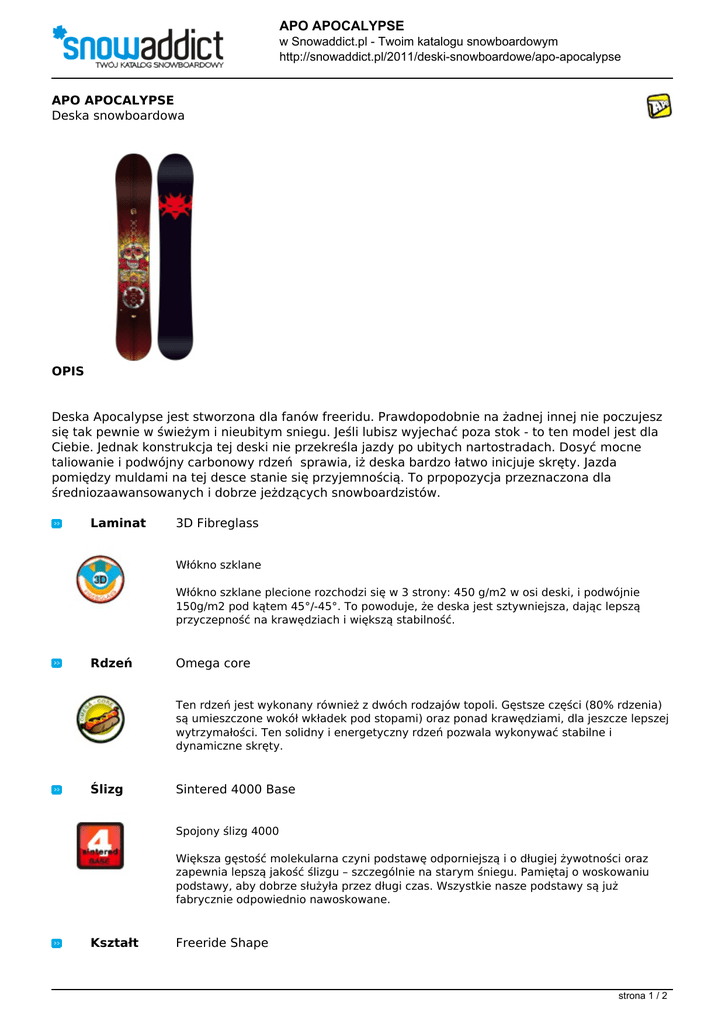 APO APOCALYPSE w Snowaddict.pl - Twoim katalogu snowboardowym http://snowaddict.pl/2011/deski-snowboardowe/apo-apocalypse APO APOCALYPSE Deska snowboardowa OPIS Deska Apocalypse jest stworzona dla fanów freeridu. Prawdopodobnie na żadnej innej nie poczujesz się tak pewnie w świeżym i nieubitym sniegu. Jeśli lubisz wyjechać poza stok - to ten model jest dla Ciebie. Jednak konstrukcja tej deski nie przekreśla jazdy po ubitych nartostradach. Dosyć mocne taliowanie i podwójny carbonowy rdzeń sprawia, iż deska bardzo łatwo inicjuje skręty. Jazda pomiędzy muldami na tej desce stanie się przyjemnością. To prpopozycja przeznaczona dla średniozaawansowanych i dobrze jeżdzących snowboardzistów. Laminat 3D Fibreglass Włókno szklane Włókno szklane plecione rozchodzi się w 3 strony: 450 g/m2 w osi deski, i podwójnie 150g/m2 pod kątem 45°/-45°. To powoduje, że deska jest sztywniejsza, dając lepszą przyczepność na krawędziach i większą stabilność. Rdzeń Omega core Ten rdzeń jest wykonany również z dwóch rodzajów topoli. Gęstsze części (80% rdzenia) są umieszczone wokół wkładek pod stopami) oraz ponad krawędziami, dla jeszcze lepszej wytrzymałości. Ten solidny i energetyczny rdzeń pozwala wykonywać stabilne i dynamiczne skręty. Ślizg Sintered 4000 Base Spojony ślizg 4000 Większa gęstość molekularna czyni podstawę odporniejszą i o długiej żywotności oraz zapewnia lepszą jakość ślizgu – szczególnie na starym śniegu. Pamiętaj o woskowaniu podstawy, aby dobrze służyła przez długi czas. Wszystkie nasze podstawy są już fabrycznie odpowiednio nawoskowane. Kształt Freeride Shape strona 1 / 2 APO APOCALYPSE w Snowaddict.pl - Twoim katalogu snowboardowym http://snowaddict.pl/2011/deski-snowboardowe/apo-apocalypse 100% Kierunkowy: Dłuższy, progresywny przód i bardziej miękki tył z większym promieniem skrętu czyni deski o freeridowym kształcie bardziej stabilne i wydajne na i poza stokami. Profil Classic camber Snowboard zaczął się rozwijać przy użyciu klasycznego wygięcia - classic camber. Wygięte deski są tak zrobione aby nimi jeździć wszędzie, oferując dobrą kontrolę, dynamiczność, precyzją i siłę. Flex 9 Długości 162, 166, 174 Wymiary KE - krawędź efektywna ST - szerokość talii PS - promień skrętu 162 166 174 KE 1191mm 1232mm 1270mm ST 251mm 254mm 252mm PS 10.5m 10.9m 11.0m SB 25mm 25mm 25mm SB - setback Płeć Mężczyźni Więcej na temat tego produktu pod adresem: http://snowaddict.pl/2011/deski-snowboardowe/apo-apocalypse Dokument PDF pochodzi ze Snowaddict.pl - Twój katalog snowboardowy Data i czas pobrania dokumentu: 2017-03-09 02:49:29 © 2011-2017 Snowaddict.pl - Twój katalog snowboardowy strona 2 / 2 Powered by TCPDF (www.tcpdf.org)