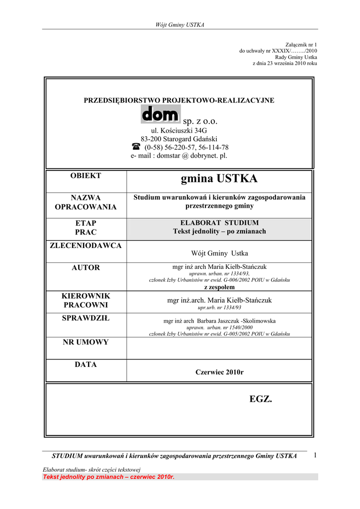 Wójt Gminy USTKA Załącznik nr 1 do uchwały nr XXXIX/……../2010 Rady Gminy Ustka z dnia 23 września 2010 roku PRZEDSIĘBIORSTWO PROJEKTOWO-REALIZACYJNE sp. z o.o. ul. Kościuszki 34G 83-200 Starogard Gdański (0-58) 56-220-57, 56-114-78 e- mail : domstar @ dobrynet. pl. OBIEKT gmina USTKA NAZWA OPRACOWANIA Studium uwarunkowań i kierunków zagospodarowania przestrzennego gminy ETAP PRAC ELABORAT STUDIUM Tekst jednolity – po zmianach ZLECENIODAWCA Wójt Gminy Ustka AUTOR mgr inŜ arch Maria Kiełb-Stańczuk uprawn. urban. nr 1334/93, członek Izby Urbanistów nr ewid. G-006/2002 POIU w Gdańsku z zespołem KIEROWNIK PRACOWNI mgr inŜ.arch. Maria Kiełb-Stańczuk SPRAWDZIŁ mgr inŜ arch Barbara Jaszczuk -Skolimowska upr.urb. nr 1334/93 uprawn. urban. nr 1540/2000 członek Izby Urbanistów nr ewid. G-005/2002 POIU w Gdańsku NR UMOWY DATA Czerwiec 2010r EGZ. STUDIUM uwarunkowań i kierunków zagospodarowania przestrzennego Gminy USTKA Elaborat studium- skrót części tekstowej Tekst jednolity po zmianach – czerwiec 2010r. 1 Wójt Gminy USTKA ZMIANA Studium uwarunkowań i kierunków zagospodarowania przestrzennego gminy Ustka – tekst jednolity Wykonawca zmiany : Biuro Urbanistyczne arch. Maria Czerniak, ul. Bora Komorowskiego 104/43, 80-377 Gdańsk Zespół projektowy: Projektant główny – mgr inŜ arch. Maria Czerniak – wpis na listę członków Pomorskiej Okręgowej Izby Urbanistów w Gdańsku pod numerem G-032/2002 Projektant – mgr inŜ arch. Lidia Urbańska - wpis na listę członków Pomorskiej Okręgowej Izby Urbanistów w Gdańsku pod numerem G-259/2009 Zmiana studium dotyczy obszaru połoŜonego w obrębie geodezyjnym Wytowno – dz. nr 346, 307, 19/1, 299, 353, 20/1, 20/2, 20/3 i 24 tekst jednolity uwzględnia takŜe następujące zmiany1 wg uchwał: Nr XXVI/280/2005 Rady Gminy Ustka z dnia 17.06.2005r.- dla cz. terenów połoŜonych w obrębie geod. Niestkowo, Lędowo i Machowinko Nr XXVI/281/2005 Rady Gminy Ustka z dnia 17.06.2005r.-dla cz. terenu połoŜonego w obrębie geod. Grabno Nr XXVI/282/2005 Rady Gminy Ustka z dnia 17.06.2005r- dla cz. terenu połoŜonego w obrębie geod. Dębina Nr XXVI/283/2005 Rady Gminy Ustka z dnia 17.06.2005r- dla cz. terenu połoŜonego w obrębie geod. Machowinko Nr XXX/305/2005 Rady Gminy Ustka z dnia 29.11.2005r – dla cz. terenu połoŜonego w obrębie geod. Machowio Nr XXXVII/375/2006 Rady Gminy Ustka z dnia 29.08.2006r- dla cz. terenu połoŜonego w obrębie geod. Wytowno UCHWAŁA NR XXXIV/397/2010 Rady Gminy Ustka z dnia 19 lutego 2010 roku - dot. fragmentu m. Objazda dla dz. geod. 8/19, 8/20, 8/21, 8/22, 8/23 i cz. 8/18 Nr NR XXXIV/396/2010 Rady Gminy Ustka z dnia 19 lutego 2010r- dot. fragmentu m. Dębina Zmiany do pierwotnego tekstu oznaczono kursywą w wyróŜnionych szarością blokach tekstu. 1 Zmiany te nie były sporządzane przez Biuro Urbanistyczne arch. Maria Czerniak. STUDIUM uwarunkowań i kierunków zagospodarowania przestrzennego Gminy USTKA Elaborat studium- skrót części tekstowej Tekst jednolity po zmianach – czerwiec 2010r. 2 Wójt Gminy USTKA Wójt Gminy USTKA Studium uwarunkowań i kierunków zagospodarowania przestrzennego Gminy USTKA ELABORAT STUDIUM- skrót Załącznik nr 1 do Uchwały Nr V/37/2002 Rady Gminy Ustka z dnia 30 grudnia 2002r. opracowanie sporządzone w okresie kwiecień 2002- listopad 2002, zespół autorski współpracujący z Zarządem Gminy USTKA- Przedsiębiorstwo Projektowo-Realizacyjne „DOM” Sp z o.o. , 83-200 Starogard Gdański, ul. Kościuszki 34G, tel/fax 0-prefiks-58 56-220-57, e-mail [email protected] projektant prowadzący: mgr inŜ. arch Maria Kiełb-Stańczuk - uprawn. do projektowania w planowaniu przestrzennym nr 1334/93, wpis do Północnej Okręgowej Izby Urbanistów w Gdańsku nr G-006/2002 STUDIUM uwarunkowań i kierunków zagospodarowania przestrzennego Gminy USTKA Elaborat studium- skrót części tekstowej Tekst jednolity po zmianach – czerwiec 2010r. 3 Wójt Gminy USTKA SPIS TREŚCI : INFORMACJE WSTĘPNE. ................................................................................................................................ 5 UWARUNKOWANIA – SYNTEZA ................................................................................................................... 6 1. Uwarunkowania zewnętrzne – moŜliwości i ograniczenia rozwojowe wynikające z połoŜenia oraz uwarunkowań regionalnych. .......................................................................... 6 2. Uwarunkowania wewnętrzne- wynikające z dotychczasowego uŜytkowania, zagospodarowania, przeznaczenia i uzbrojenia terenu......................................................... 12 3. Uwarunkowania wynikające z własności gruntów oraz lokalnego rynku nieruchomości. .............................................................................................................................................. 20 4. Uwarunkowania wynikające z występowania na obszarze gminy obszarów i obiektów chronionych na podstawie przepisów szczególnych. ........................................................... 21 5. Uwarunkowania wynikające ze stanu i funkcjonowania środowiska przyrodniczego i kulturowego, w tym stanu rolniczej przestrzeni produkcyjnej............................................. 24 6. Uwarunkowania społeczno-demograficzne i wynikające z jakości Ŝycia mieszkańców. 29 7.Inne uwarunkowania. ........................................................................................................ 31 KIERUNKI ZAGOSPODAROWANIA PRZESTRZENNEGO, ZASADY POLITYKI PRZESTRZENNEJ .............................................................................................................................................................................. 33 1. Wstęp, załoŜenia programowe, prognozy, cele rozwojowe. ............................................ 33 2. Główne kierunki zagospodarowania oraz podział obszaru gminy na strefy funkcjonalnoprzestrzenne.......