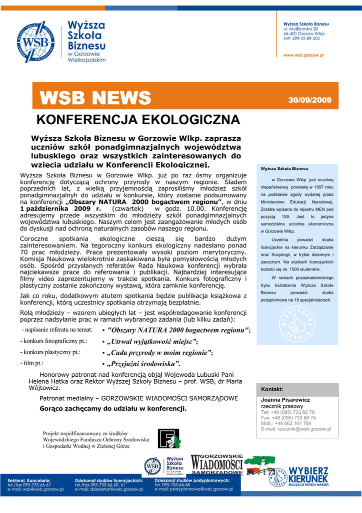 WSB NEWS 30/09 30/09/2009 /09/2009 KONFERENCJA EKOLOGICZNA WyŜsza Szkoła Biznesu w Gorzowie Wlkp. zaprasza uczniów szkół ponadgimnazjalnych województwa lubuskiego oraz wszystkich zainteresowanych do wzięcia udziału w Konferencji Ekologicznej. WyŜsza Szkoła Biznesu w Gorzowie Wlkp. juŜ po raz ósmy organizuje konferencję dotyczącą ochrony przyrody w naszym regionie. Śladem poprzednich lat, z wielką przyjemnością zaprosiliśmy młodzieŜ szkół ponadgimnazjalnyh do udziału w konkursie, który zostanie podsumowany na konferencji „Obszary NATURA 2000 bogactwem regionu”, w dniu 1 października 2009 r. (czwartek) w godz. 10.00. Konferencję adresujemy przede wszystkim do młodzieŜy szkół ponadgimnazjalnych województwa lubuskiego. Naszym celem jest zaangaŜowanie młodych osób do dyskusji nad ochroną naturalnych zasobów naszego regionu. Coroczne spotkania ekologiczne cieszą się bardzo duŜym zainteresowaniem. Na tegoroczny konkurs ekologiczny nadesłano ponad 70 prac młodzieŜy. Prace prezentowały wysoki poziom merytoryczny. Komisja Naukowa wielokrotnie zaskakiwana była pomysłowością młodych osób. Spośród przysłanych referatów Rada Naukowa konferencji wybrała najciekawsze prace do referowania i publikacji. Najbardziej interesujące filmy video zaprezentujemy w trakcie spotkania. Konkurs fotograficzny i plastyczny zostanie zakończony wystawą, która zamknie konferencję. Jak co roku, dodatkowym atutem spotkania będzie publikacja ksiąŜkowa z konferencji, którą uczestnicy spotkania otrzymają bezpłatnie. WyŜsza Szkoła Biznesu w Gorzowie Wlkp. jest uczelnią niepaństwową powstałą w 1997 roku na podstawie zgody wydanej przez Ministerstwo Edukacji Narodowej. Została wpisana do rejestru MEN pod pozycją 129. Jest to jedyna samodzielna uczelnia ekonomiczna w Gorzowie Wlkp. Uczelnia powadzi studia licencjackie na kierunku Zarządzanie oraz Socjologii, w trybie dziennym i zaocznym. Na studiach licencjackich kształci się ok. 1500 studentów. W ramach pozaakademickiego trybu kształcenia Biznesu WyŜsza prowadzi Szkoła studia podyplomowe na 19 specjalnościach. Rolą młodzieŜy – wzorem ubiegłych lat – jest współredagowanie konferencji poprzez nadsyłanie prac w ramach wybranego zadania (lub kilku zadań): - napisanie referatu na temat: • "Obszary NATURA 2000 bogactwem regionu"; - konkurs fotograficzny pt.: • „Utrwal wyjątkowość miejsc”; - konkurs plastyczny pt.: • „Cuda przyrody w moim regionie”; - film pt.: • „Przyjaźni środowisku”. Honorowy patronat nad konferencją objął Wojewoda Lubuski Pani Helena Hatka oraz Rektor WyŜszej Szkoły Biznesu – prof. WSB, dr Maria Wójtowicz. Patronat medialny – GORZOWSKIE WIADOMOŚCI SAMORZĄDOWE Gorąco zachęcamy do udziału w konferencji. Projekt współfinansowany ze środków Wojewódzkiego Funduszu Ochrony Środowiska i Gospodarki Wodnej w Zielonej Górze Kontakt: Joanna Pisarewicz rzecznik prasowy Tel: +48 (095) 733 66 79 Fax: +48 (095) 733 66 74 Mob.: +48 662 161 784 E-mail: [email protected]