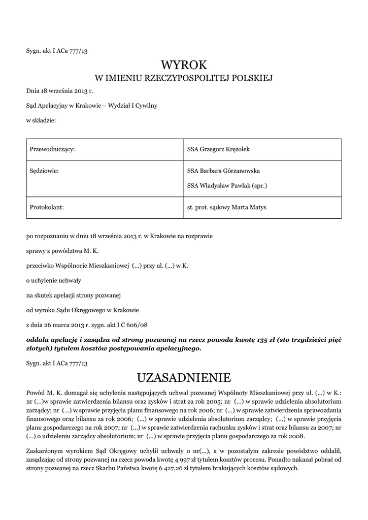 Sygn. akt I ACa 777/13 WYROK W IMIENIU RZECZYPOSPOLITEJ POLSKIEJ Dnia 18 września 2013 r. Sąd Apelacyjny w Krakowie – Wydział I Cywilny w składzie: Przewodniczący: SSA Grzegorz Krężołek Sędziowie: SSA Barbara Górzanowska SSA Władysław Pawlak (spr.) Protokolant: st. prot. sądowy Marta Matys po rozpoznaniu w dniu 18 września 2013 r. w Krakowie na rozprawie sprawy z powództwa M. K. przeciwko Wspólnocie Mieszkaniowej (...) przy ul. (...) w K. o uchylenie uchwały na skutek apelacji strony pozwanej od wyroku Sądu Okręgowego w Krakowie z dnia 26 marca 2013 r. sygn. akt I C 606/08 oddala apelację i zasądza od strony pozwanej na rzecz powoda kwotę 135 zł (sto trzydzieści pięć złotych) tytułem kosztów postępowania apelacyjnego. Sygn. akt I ACa 777/13 UZASADNIENIE Powód M. K. domagał się uchylenia następujących uchwał pozwanej Wspólnoty Mieszkaniowej przy ul. (...) w K.: nr (...)w sprawie zatwierdzenia bilansu oraz zysków i strat za rok 2005; nr (...) w sprawie udzielenia absolutorium zarządcy; nr (...) w sprawie przyjęcia planu finansowego na rok 2006; nr (...) w sprawie zatwierdzenia sprawozdania finansowego oraz bilansu za rok 2006; (...) w sprawie udzielenia absolutorium zarządcy; (...) w sprawie przyjęcia planu gospodarczego na rok 2007; nr (...) w sprawie zatwierdzenia rachunku zysków i strat oraz bilansu za 2007; nr (...) o udzieleniu zarządcy absolutorium; nr (...) w sprawie przyjęcia planu gospodarczego za rok 2008. Zaskarżonym wyrokiem Sąd Okręgowy uchylił uchwały o nr(...), a w pozostałym zakresie powództwo oddalił, zasądzając od strony pozwanej na rzecz powoda kwotę 4 997 zł tytułem kosztów procesu. Ponadto nakazał pobrać od strony pozwanej na rzecz Skarbu Państwa kwotę 6 427,26 zł tytułem brakujących kosztów sądowych. W uzasadnieniu ustalił m. in.: Powód jest członkiem pozwanej Wspólnoty i przysługuje mu udział w nieruchomości wspólnej w 184/10000 częściach. Skarżone uchwały zostały podjęte częściowo w trybie głosowania na zabraniu, a częściowo w drodze indywidualnego zbierania głosów. Umowy sprzedaży wyodrębnionych lokali na rzecz członków pozwanej Wspólnoty, z deweloperem (...) sp. z o.o. w K. (obecnie (...) Deweloper sp. z o.o.) zawierały postanowienia zwalniające Dewelopera w okresie 3 pełnych lat obrotowych od powstania wspólnoty mieszkaniowej, z części kosztów obciążających członków pozwanej Wspólnoty jak: kosztów wywozu śmieci, utrzymania czystości, utrzymania i eksploatacji drogi dojazdowej, utrzymania zieleni, bieżących napraw oraz wpłat na fundusz remontowy, a także kosztów urządzeń i robót wykonywanych w przyszłości na życzenie mieszkańców. Deweloper – zgodnie z zapisami tych umów - miał natomiast uczestniczyć w pozostałych kosztach obciążających członków pozwanej Wspólnoty, wyłącznie w zakresie udokumentowanym fakturami wystawionymi Wspólnocie przez dostawców i usługodawców, przy czym Deweloper został zwolniony od uiszczania miesięcznych zaliczek na koszty zarządu, zaś zapłata przypadających na niego kosztów, miała następować na podstawie odrębnych not księgowych wystawionych przez zarządcę. W oparciu o powyższe umowy, zarząd nieruchomością pozwanej Wspólnoty został powierzony Biuru (...) s.c. M. D., W. S.. Poza tym kupujący wyrazili zgodę na ustanowienie na rzecz Dewelopera służebności polegających na umieszczeniu na frontowej ścianie budynku oraz na dachu jego tablic reklamowych oraz na wykonanie przez niego własnym staraniem i kosztem na nieruchomości wspólnej parkingu o nawierzchni żwirowej, którego nieodpłatnymi i wyłącznymi użytkownikami mieli być jego pracownicy, kooperanci i klienci. Bilans pozwanej Wspólnoty za lata 2004-2005 oraz za 2006 zamknął się stratą. Przy rozliczaniu strat za te lata, Zarządca obciążył spółkę (...) niższą kwotą, aniżeli wynika to z posiadanych przez nią udziałów. Wskutek takiego działania, część strat przypadających na Dewelopera jako członka pozwanej Wspólnoty, pokryli pozostali jej członkowie (1 111,09 zł w 2006 r., 42,29 zł w 2007 r.) W 2005 r. członkowie pozwanej Wspólnoty nie byli obowiązani do uiszczania zaliczek na fundusz remontowy. Uchwały o wnoszeniu opłat na poczet przyszłych remontów, pozwana Wspólnota podjęła w dniu 23 lutego 2006 r., a kolejna w tej materii 5 marca 2007 r. Wysokość przypadających i nie pobranych od Dewelopera zaliczek na fundusz remontowy za lata 2006-2007 wynosi 1 473,34 zł. Gdyby został on obciążony zaliczkami eksploatacyjnymi i remontowymi, tak jak pozostali członkowie pozwanej Wspólnoty, to zmianie uległaby wysokość przychodów Wspólnoty, a tym samym wysokość jej wyników finansowych w spornym okresie. Mianowicie wysokość przychodów Wspólnoty za lata 2005-2007 byłaby wyższa odpowiednio o 6 434,19 zł w 2005 r., 2 238,53 zł w 2006 r. i 1 579,22 zł w 2007 r., tj. łącznie o 10 251,94 zł. Wyższy poziom przychodów implikowałby osiągnięcie zysku w 2005 r. i 2006 r., co spowodowałoby brak obciążeń z tytułu rozliczania strat dla pozostałych członków pozwanej Wspólnoty. Ostateczna wartość dodatkowych należności, które powinny obciążać Dewelopera w spornym okresie, uwzględniająca rozliczenie strat poniesionych przez Wspólnotę, dokonane w 2006 i 2007 r. i rozliczenie mediów, wynosi 9 879,39 zł. W dniu 17 maja 2005 r. Deweloper przelał na rachunek pozwanej Wspólnoty kwotę 18 674,54 zł, stanowiącą różnicę pomiędzy wpłaconymi przez jej członków na jego rachunek ryczałtowymi zaliczkami a poniesionymi przez Wspólnotę kosztami. Kwota wpłat nie znajdująca pokrycia w wydatkach poniesionych przez Dewelopera za Wspólnotę, została rozliczona na poszczególnych jej członków w kwietniu 2005 r. Strona pozwana nie podjęła uchwały w przedmiocie regulaminu rozliczania mediów, ale w 2004 r., zatwierdzony został dokument o nazwie „(...)