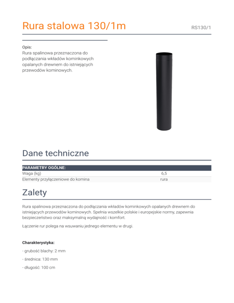 Rura stalowa 130/1m RS130/1 Opis: Rura spalinowa przeznaczona do podłączania wkładów kominkowych opalanych drewnem do istniejących przewodów kominowych. Dane techniczne PARAMETRY OGÓLNE: Waga (kg) Elementy przyłączeniowe do komina 6,5 rura Zalety Rura spalinowa przeznaczona do podłączania wkładów kominkowych opalanych drewnem do istniejących przewodów kominowych. Spełnia wszelkie polskie i europejskie normy, zapewnia bezpieczeństwo oraz maksymalną wydajność i komfort. Łączenie rur polega na wsuwaniu jednego elementu w drugi. Charakterystyka: - grubość blachy: 2 mm - średnica: 130 mm - długość: 100 cm - wytrzymałość na temperaturę: 1000°C - materiał: blacha stalowa - pokryte czarną farbą żaroodporną - spawane plazmowo Zwrot Klient będący Konsumentem, który zawarł Umowę sprzedaży, może w terminie 14 dni odstąpić od niej bez podawania przyczyny. Bieg terminu na odstąpienie od Umowy sprzedaży rozpoczyna się od chwili objęcia Towaru w posiadanie przez Klienta lub wskazaną przez niego osobę trzecią inną niż przewoźnik. Oświadczenie można złożyć na formularzu, którego wzór został zamieszczony przez Sprzedawcę na Stronie Internetowej Sklepu pod adresem: formularz odstąpienia. Kratki.pl Marek Bal ul. W. Gombrowicza 4 26-660 Wsola/Jedlińsk www.kratki.com tel. 48 340 10 00 Data publikacji: 25.11.2016