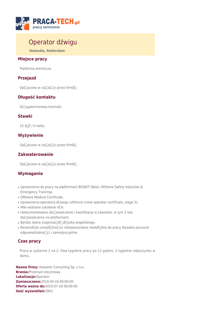 Operator dźwigu Holandia, Rotterdam Miejsce pracy Platforma wiertnicza. Przejazd OpĹacone w caĹoĹci przez firmÄ. Długość kontaktu DĹugoterminowy kontrakt. Stawki 15 ⏠/ h netto. Wyżywienie OpĹacone w caĹoĹci przez firmÄ. Zakwaterowanie OpĹacone w caĹoĹci przez firmÄ. Wymagania ● ● ● ● ● ● ● Uprawnienia do pracy na platformach BOSIET (Basic Offshore Safety Induction & Emergency Training). Offshore Medical Certificate. Uprawnienia operatora dĹşwigu (offshore crane operator certificate, stage 3). Mile widziane szkolenie VCA. Udokumentowane doĹwiadczenie i kwalifikacje w zawodzie, w tym 3 lata doĹwiadczenia na platformach. Bardzo dobra znajomoĹÄ jÄzyka angielskiego. RozwiniÄte umiejÄtnoĹci interpersonalne niezbÄdne do pracy Wysokie poczucie odpowiedzialnoĹci i samodyscyplina. Czas pracy Praca w systemie 2 na 2. Dwa tygodnie pracy po 12 godzin, 2 tygodnie odpoczynku w domu. Nazwa firmy: Kowalski Consulting Sp. z o.o. Branża:Przemysł stoczniowy Lokalizacja:Operator Zamieszczono:2010-04-16 00:00:00 Oferta ważna do:2010-07-16 00:00:00 Ilość wyświetleń:2841